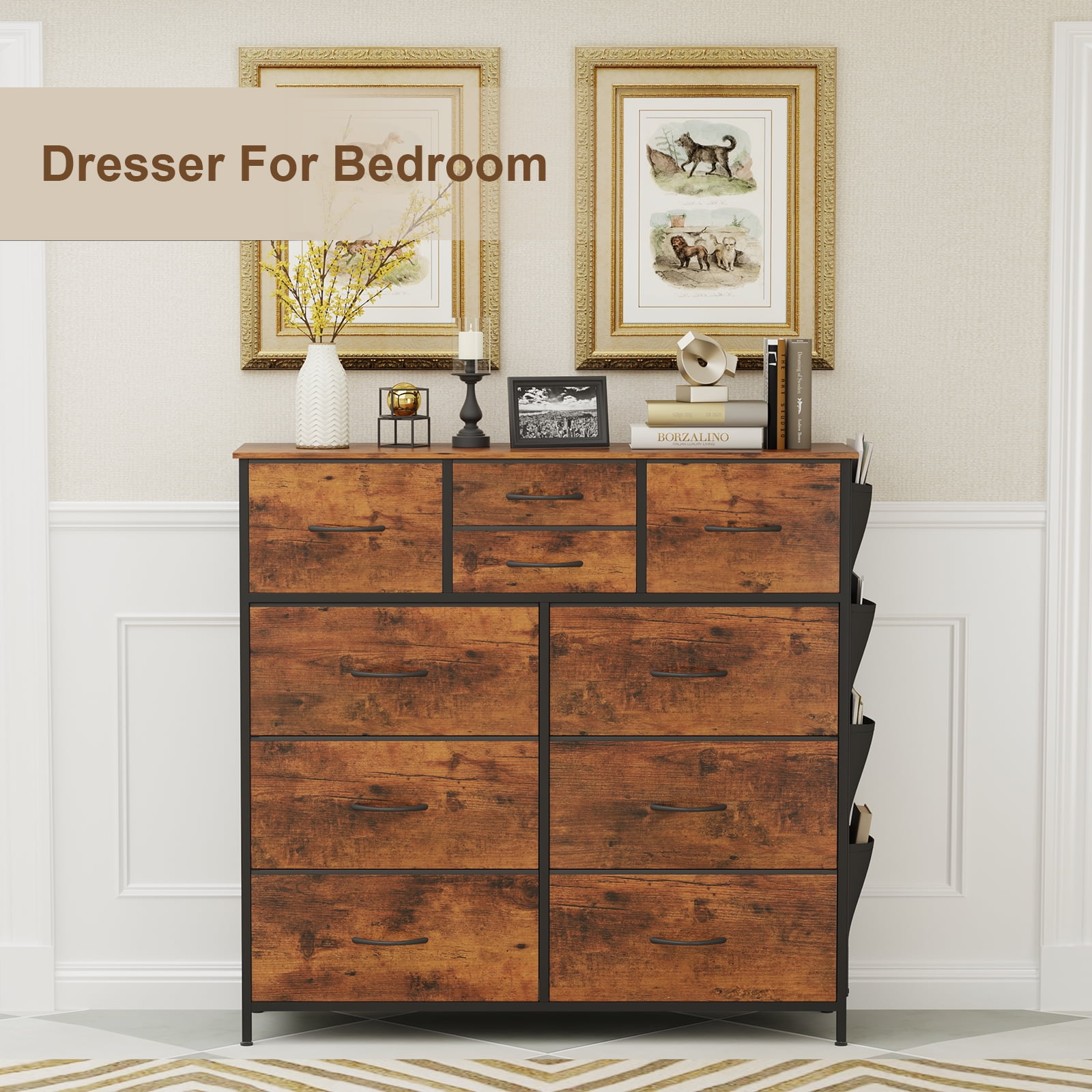 About this item. Plenty of Storage Space: The fabric dresser for bedroom is designed with 10 individual collapsible drawers, including 3 different sized drawers for your categorized storage needs, providing you with endless organizational possibilities. Additionally, the wood top provides a hard surface for frequently used items to keep them within reach. Upgraded Design and Side Pockets: Compared to other closet dressers, our dresser combines a 4 side pockets and 2 side hooks design. The side pockets add extra space for thin items. Eliminate Clutter: The SUGIFT drawer dresser is a great way to keep you neat and organized. It is the perfect addition to any modern décor for bedroom storage, entryways, hallways, closet organization, living room or nursery storage, college dorms, small apartments, or playrooms, and pairs perfectly with your other storage furniture. High Quality and Stable Structure: This tower chest of drawers is made of sturdy steel frame, MDF wood waterproof countertop and high-grade non-woven breathable fabric for reliable strength and stability, while the back bar again enhances the stability of the structure! Easy Assembly and Friendly Customer Service: With easy-to-understand assembly instructions and numbered parts included in the package, you’ll have a brand new dresser in no time at all. If you have any questions about our 10-drawer dresser, please feel free to contact us.