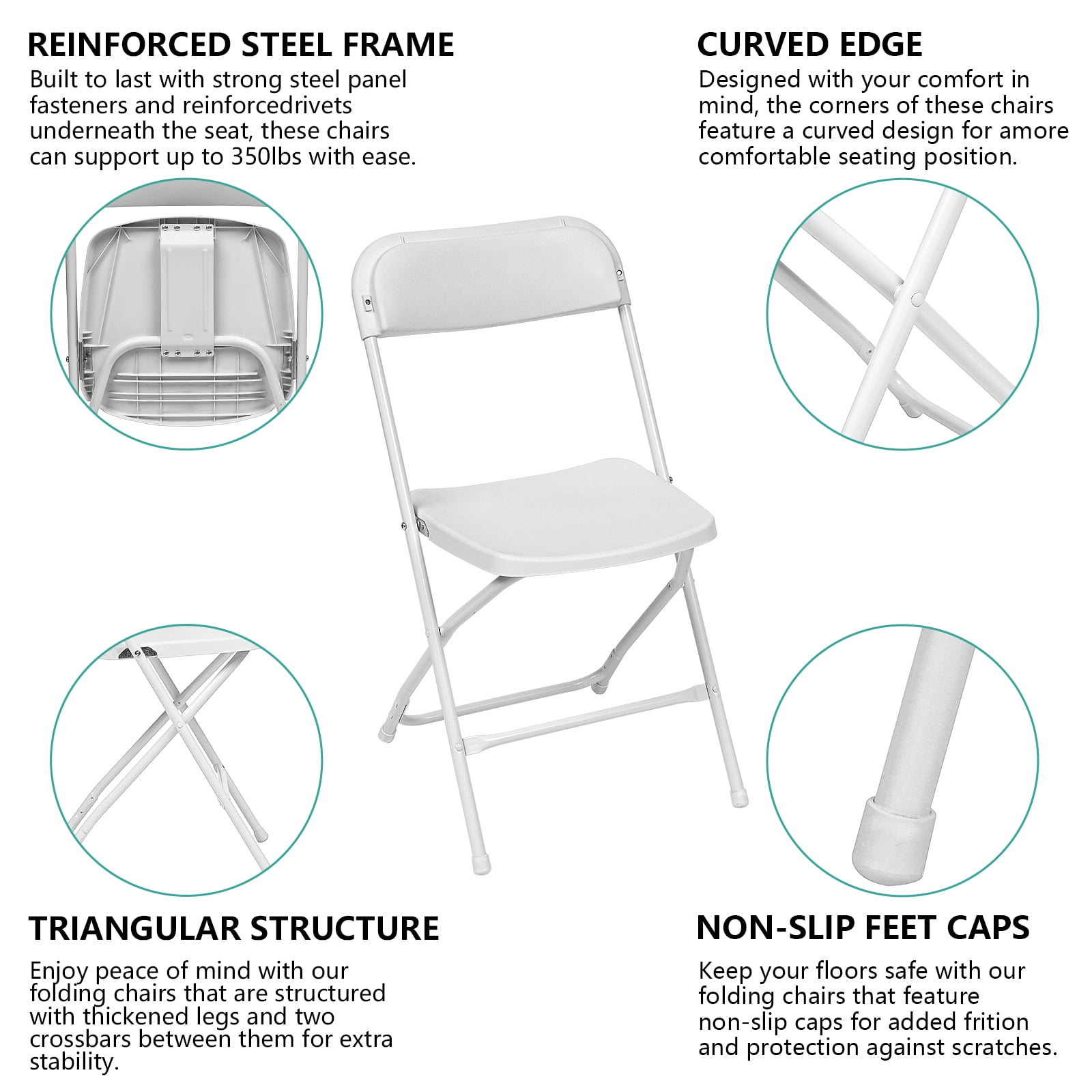 Anti-Skid, Floor-Safe Feet: Protects floors, enhances safety. Durable HDPE Design: Eco-friendly, 350lbs capacity. Aesthetically Pleasing: White, steel-framed elegance. Ergonomic Comfort: Supports back, relieves pressure. Portable and Lightweight: Easy to move and use for adult. Space-Efficient Folding: Quick setup, simple storage. No Assembly Needed: Ready-to-use, hassle-free.