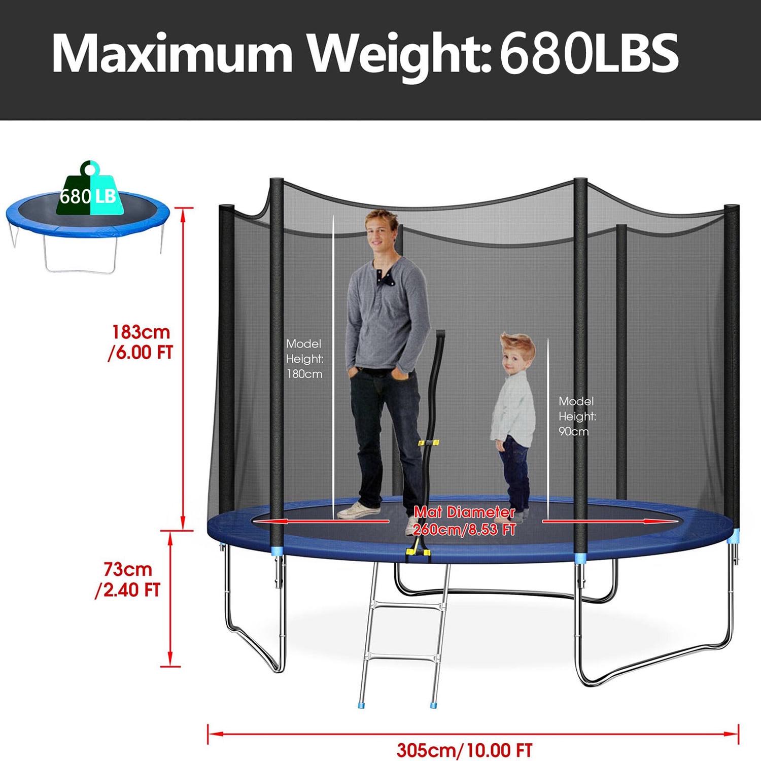 – The maximum recommended weight for trampoline is 680 lbs, which can accommodate 3-4 small partners at the same time.