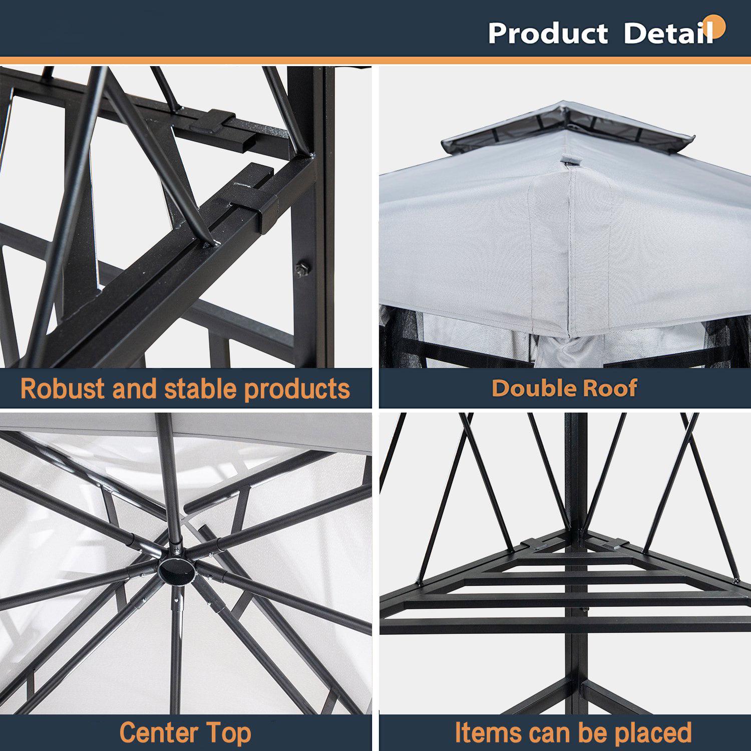 [Multiple removable side walls]: This pavilion is characterized by a mesh side wall with zipper. The high-quality mesh wall protects you from the sun, rain and insects. Enjoy outdoor activities easily from your private pavilion, while still having sufficient airflow and visibility provided by these mesh sidewalls, contact with nature and enjoy outdoor scenery