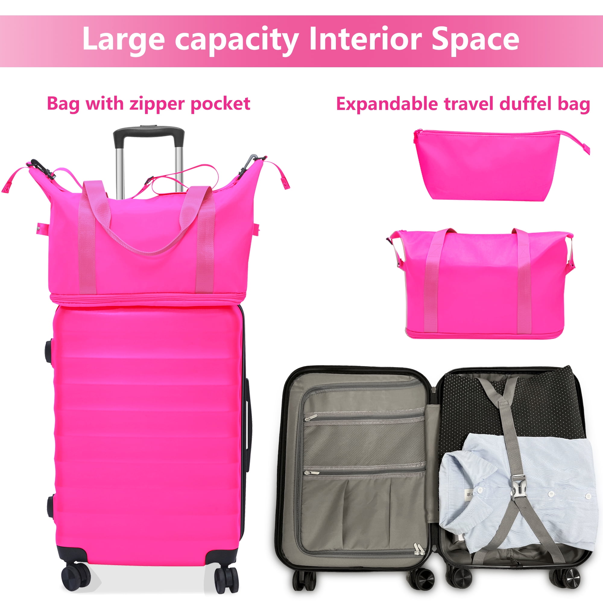 3 piece set offers a includes a 20’’ luggage, a travel duffel bag and a toiletry bag. Fully equipped for all your travel needs. Mounted TSA-approved lock, and fully-lined interior divider with organization pockets, keep your belongings secured and organized in the luggage. Crafted with ABS for durability and versatility, the luggage is lightweight and built to last. Slide or glide with the retractable handle and four multi-directional spinner wheels that move at your pace. The duffel bag, backpakck and toiletry bag are all made of polyester fabric which is mild water-resistant. The duffel bag and backpack are both designed with the back sleeve, so you can conveniently attach them to the retractable luggage handle. There are multiple functional pockets in the backpack, making it versatile for different needs of travel. Due to differences in monitors/screens – Actual product color may appear slightly different than shown on the site