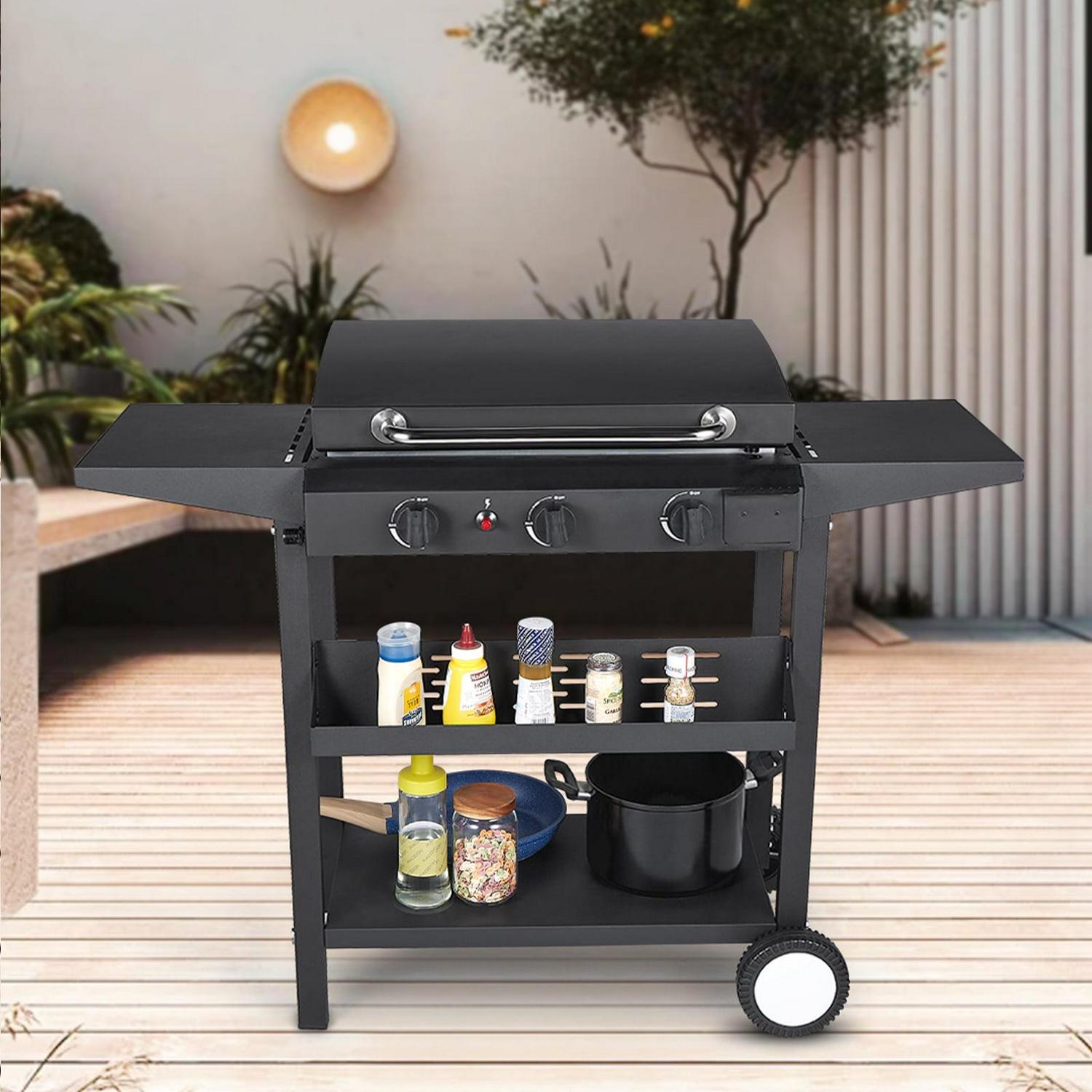 3 control knobs allow you to adjust the temperature of different heating zones. 2 side table and bottom shelf offer sufficient storage space for you. It s ideal for cooking eggs, pancakes, bacon, steak, potatoes and other grilled food. You can use it in patio, garden, backyard, etc.