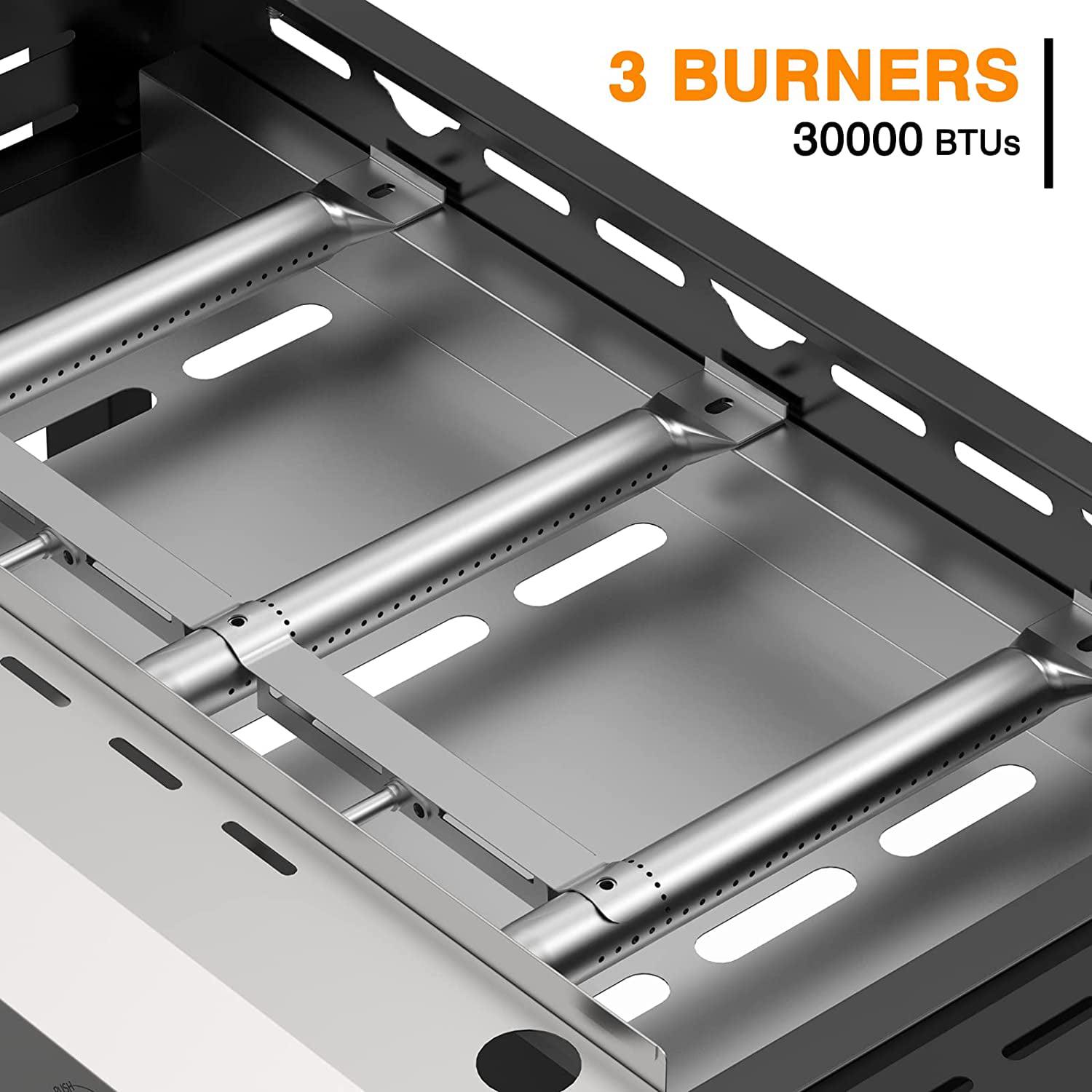 – STAINLESS STEEL BURNERS: This propane gas grill has 3 Stainless Steel burners, can put out 32,700 BTU-per-hour with integrated piezoelectric ignition system, quick start up with the push &turn of a control knob