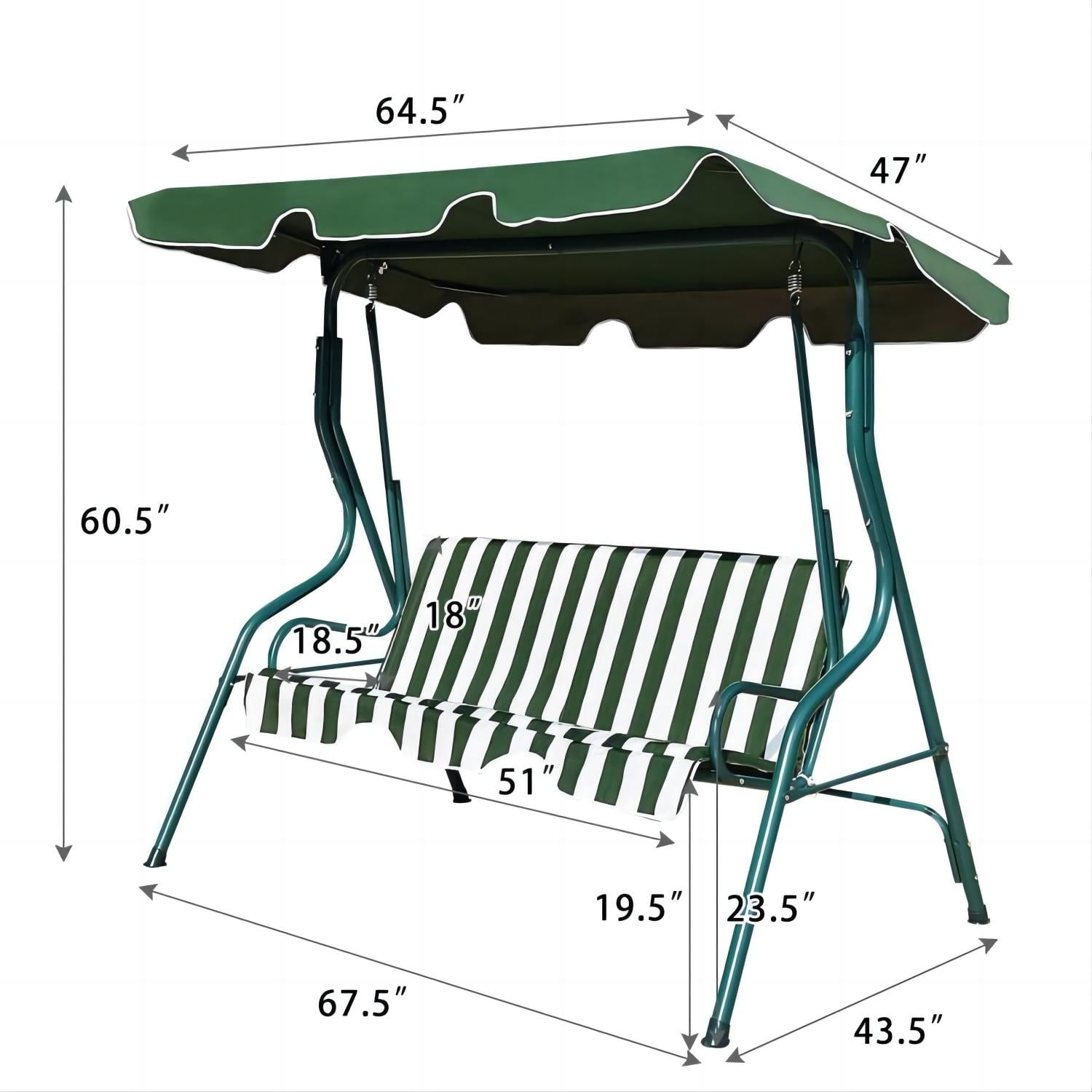 Our three seats swing chair will be an excellent addition to any outdoor living space, such as garden, yard, balcony and pool side. This swing chair provides three comfortable seats and you can enjoy the outdoor beautiful scenery with your partner. Made of tough steel material, the whole set is durable. If you are looking for such a swing. Do not hesitate to buy one to enjoy your outdoor scenery. Brand new and high quality Providing three comfortable seats With a waterproof top canopy, protecting you from ultraviolet ray and drizzle Black steel frame, durable and sturdy Add comfort With seat and back cushion Assembly needed and hardware included Specifications Color: Green Material: Steel pipe + polyester cloth + oxford cloth Overall dimension: 67.5″ x 43.3″ x 60.5″(L x W x H) Size of top canopy: 64.5″ x 47.0″(L x W) Size of seat: 51.0″ x 18.5″(L x W) Size of back: 51.0″ x 18.0″(L x W) Distance from seat to floor: 19.5″ Distance from floor to armrest: 23.5″ Weight capacity: 550 lbs Product weight: 39 lbs