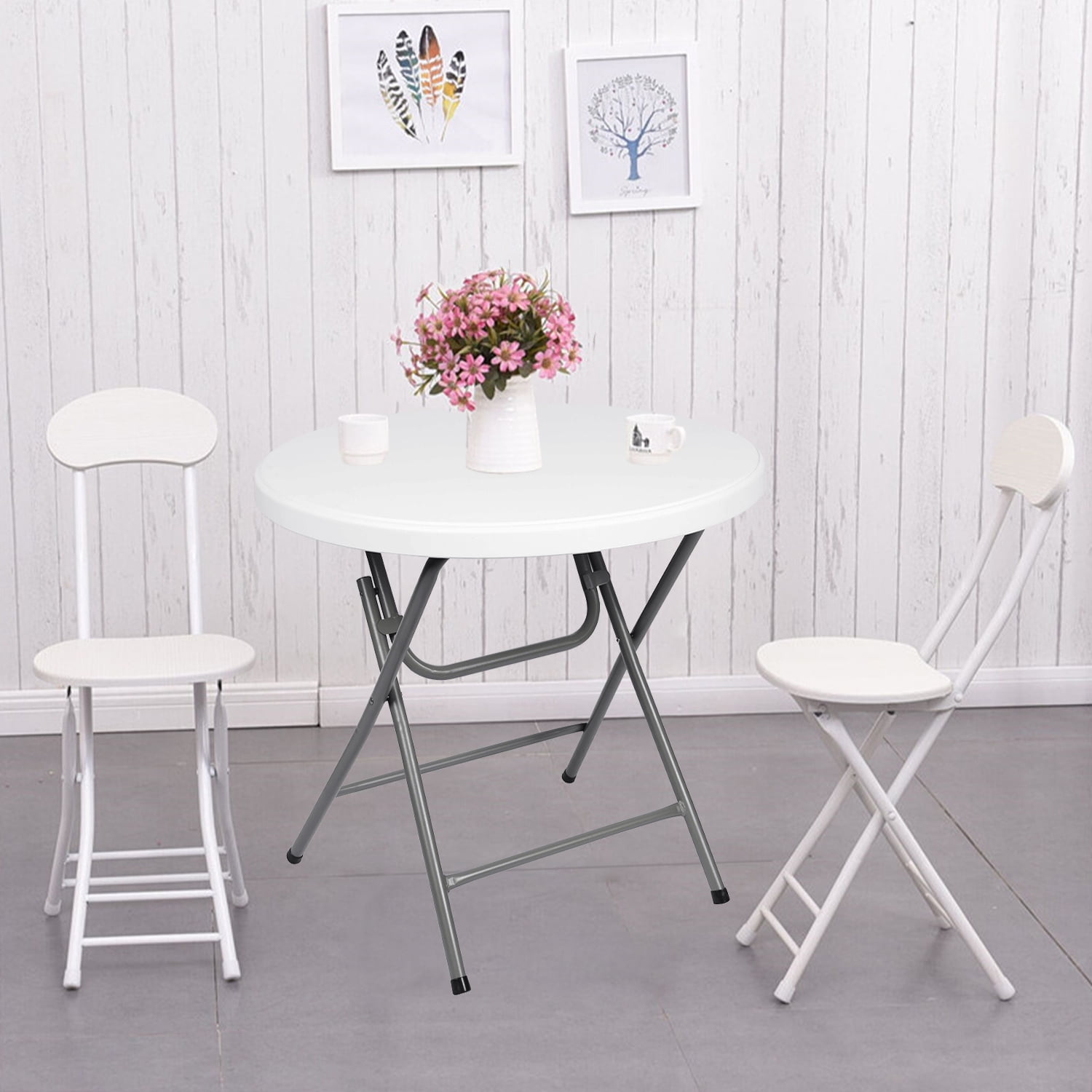 Features: Material is sturdy when in use Convenient design to fold and unfold Seats up to 3-4 Adults It’s perfect for offices, schools, gardens, guards and more 110 lbs Static Load Capacity Single side pull clasp lock to prevent automatic folding Specifications: Material: HDPE & Steel Color: White Table Top and Gray Plastic-Sprayed Steel Pipe Dimension: 32in x 32in x 29in (L x W x H) Weight: 15 lbs Load Capacity: 110 lbs Package Includes: 1 x 32in Round Folding Table(Fully Assembled)