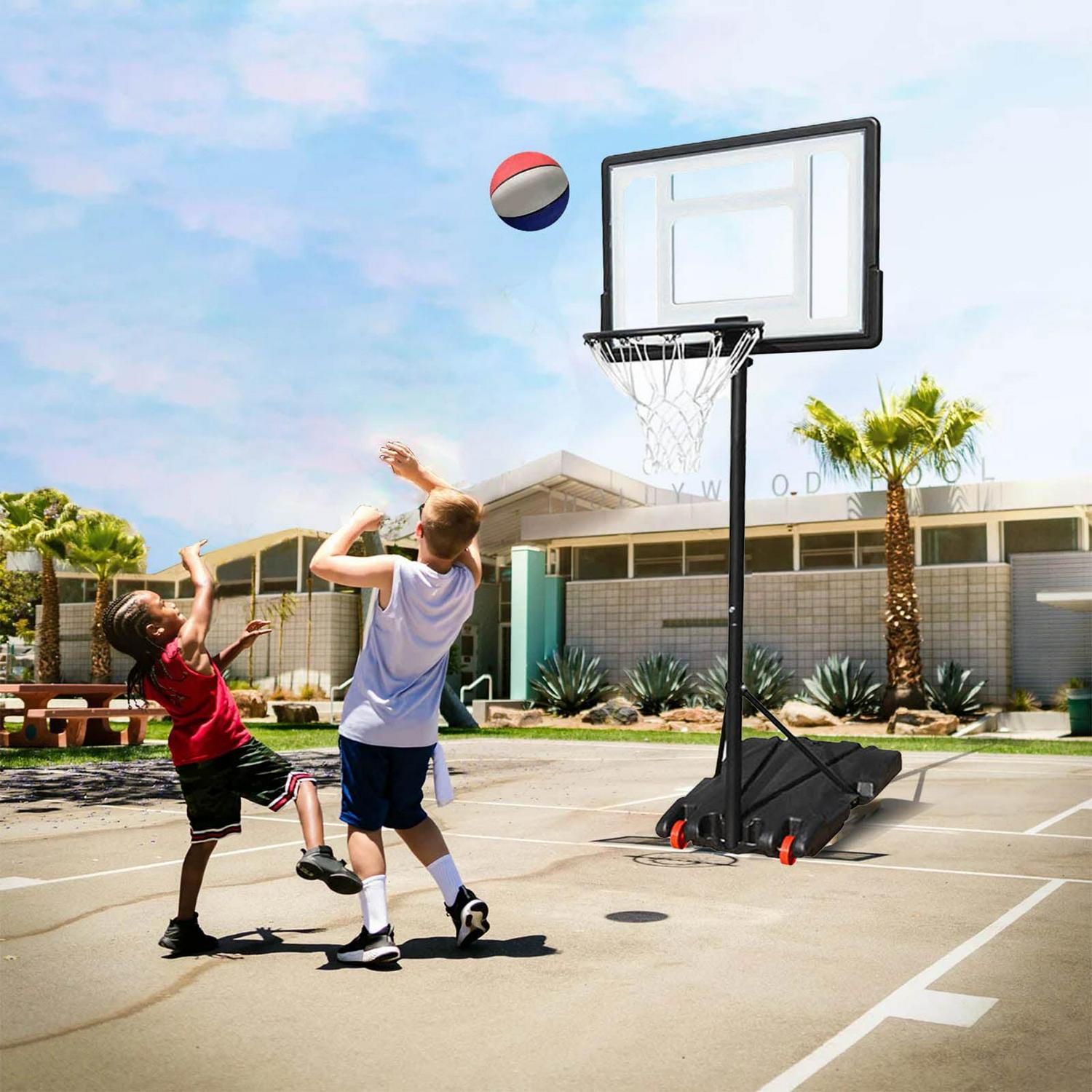 – Upgraded Durable Material Designed with a sturdy steel pole for superior strength and a high-strength & wind-protected PVC backboard, this basketball goal is impact-resistant and shatterproof enough for the most competitive games. Using high strength HDPE blow molding base and durability all-weather nylon net, this hoop will definitly last all seasons.