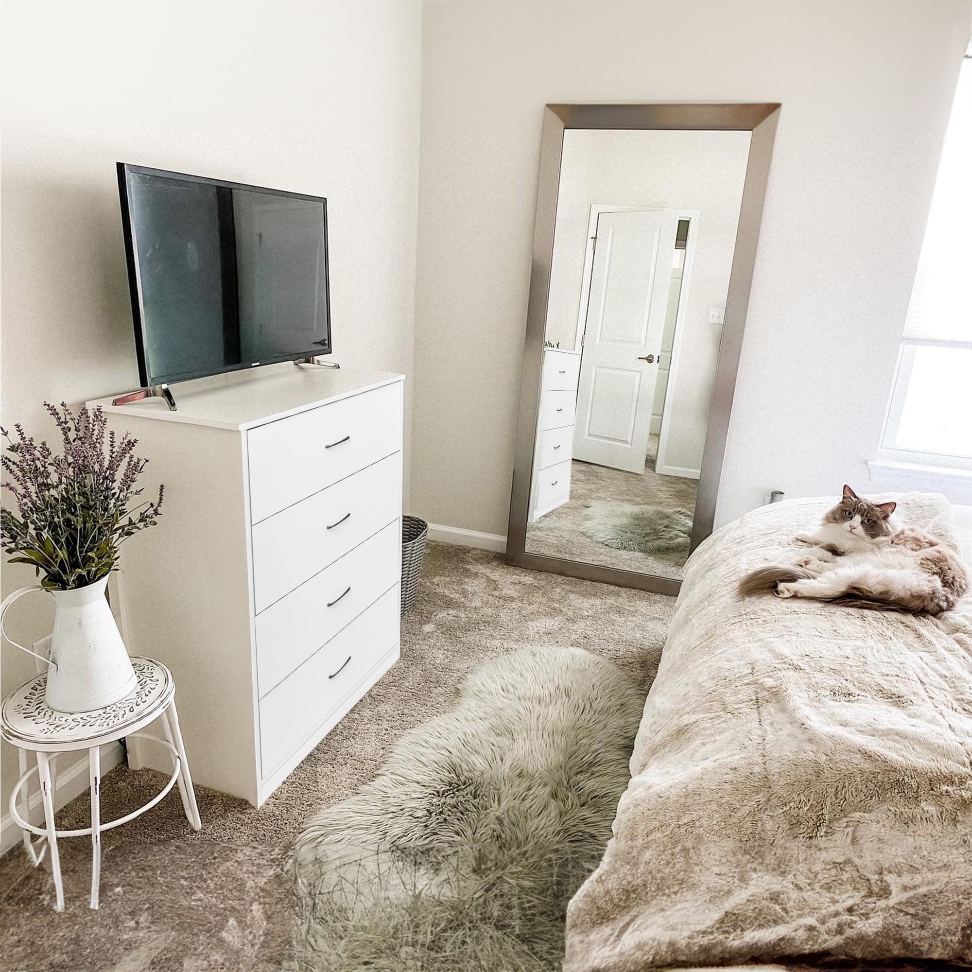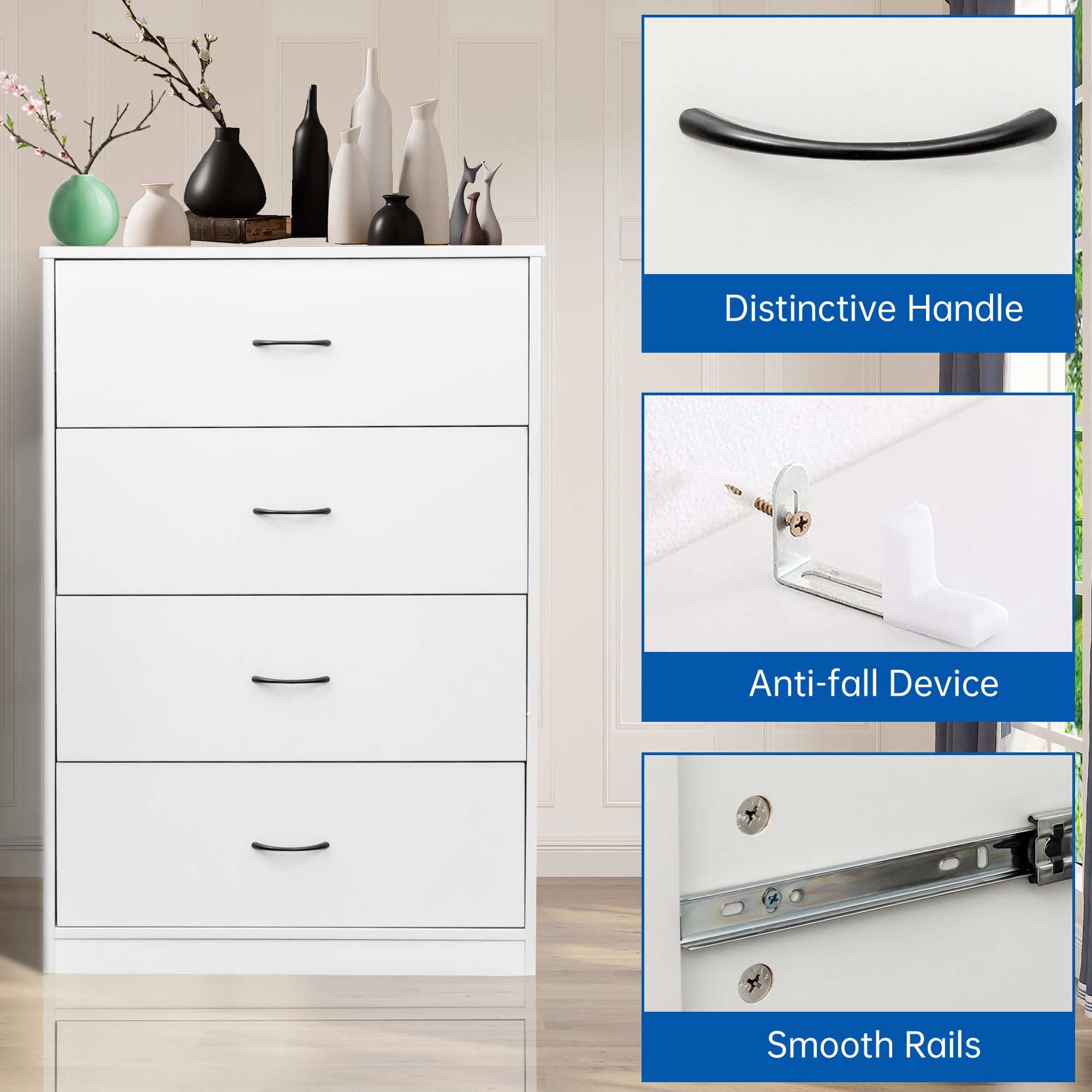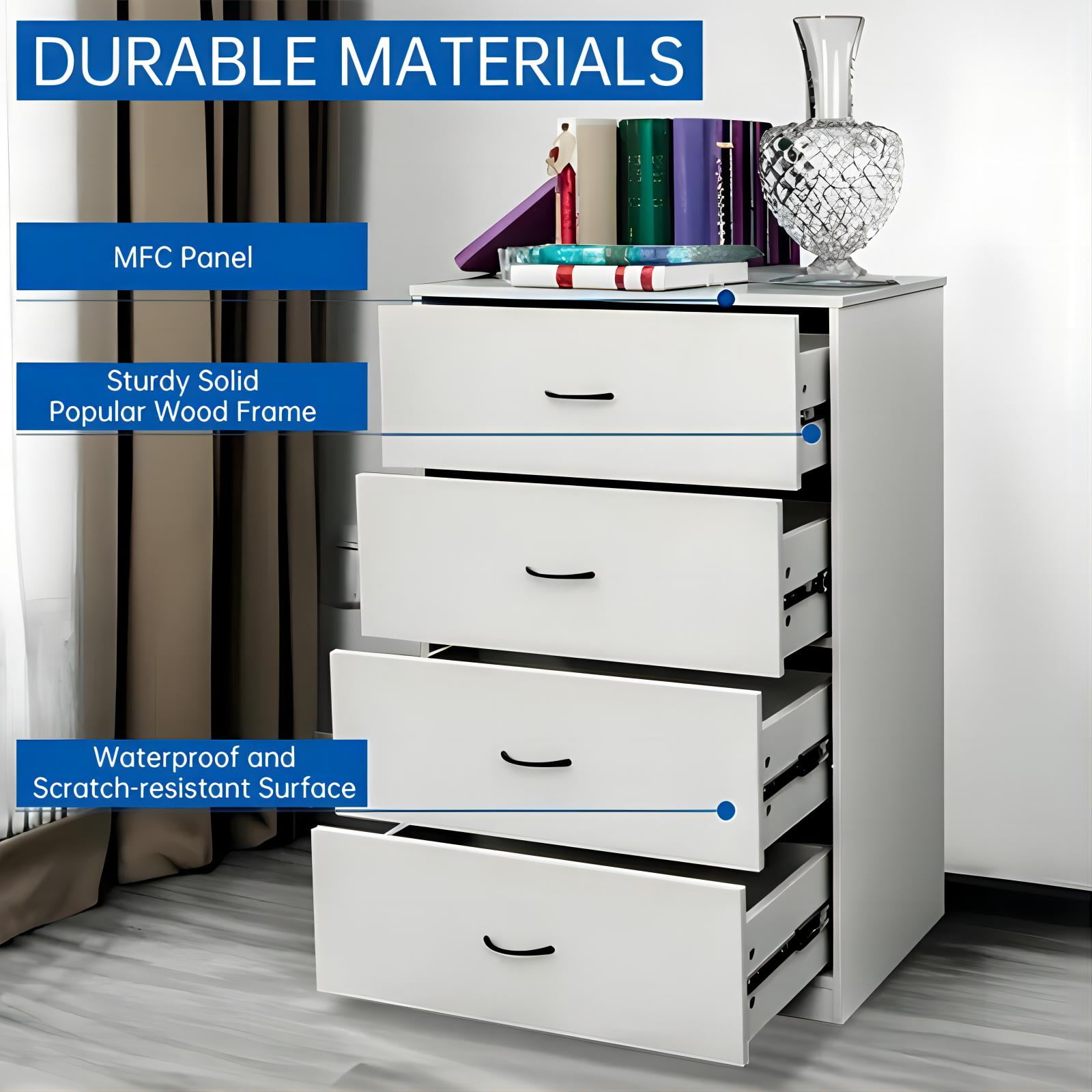 Chest of 4 Large Drawers – Large storage space. Modern Light Gray Finish Dresser – Fashion home decoration. Sturdy and Durable – Large bearing capacity. Space-saving dresser for Bedroom. Anti-falling Design – Stable and safe. Easy to assemble.