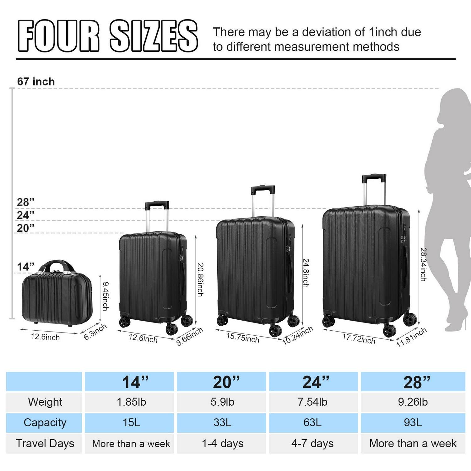 – 4 Piece Suitcase Sets The 14 inch handbag can store some daily necessities such as cosmetics, water glasses, etc. which is easy to access at any time.20 & 24inch luggage is perfect for business and personal travel.