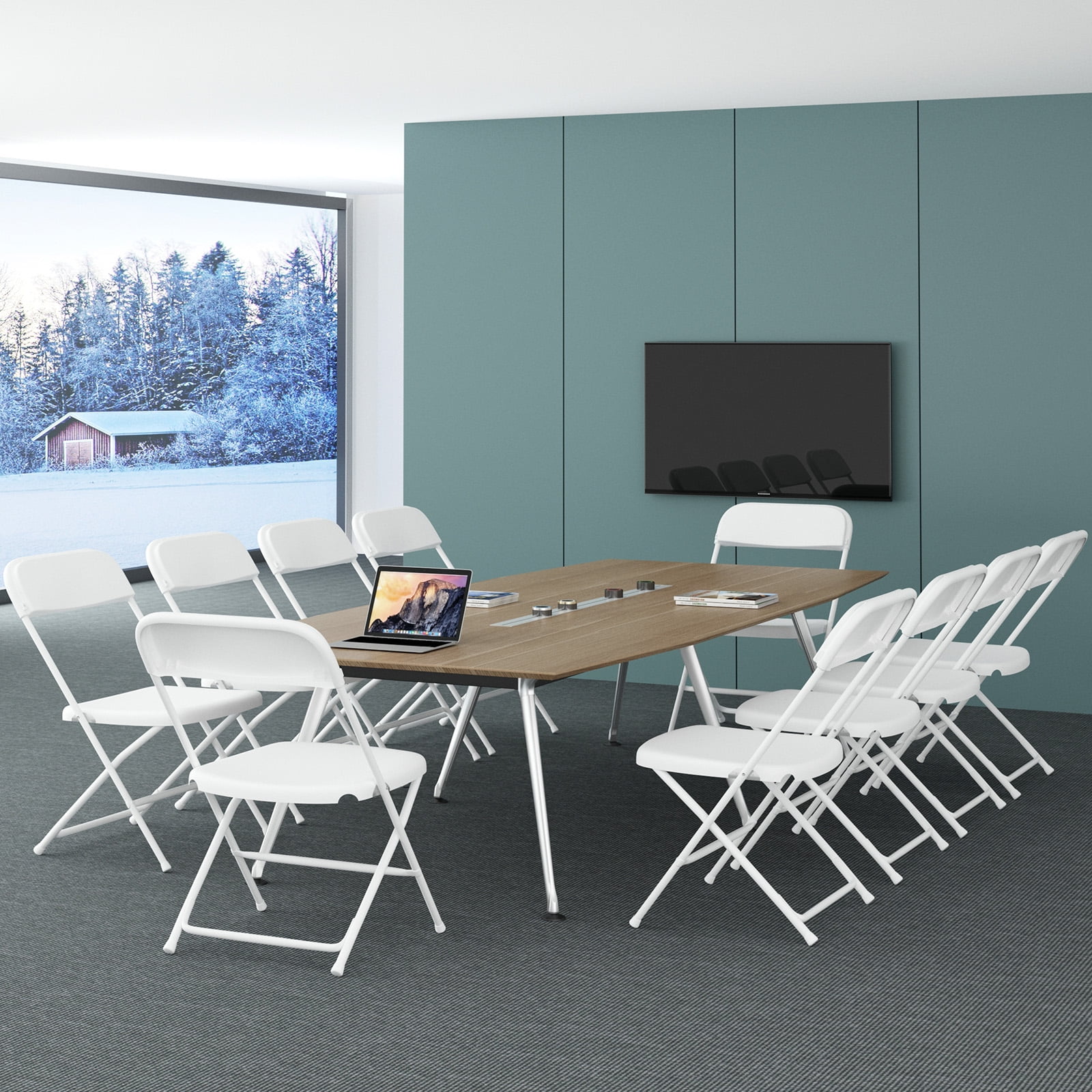Ideal for Any Event: Our folding chairs are perfect for conferences, parties, and commercial events; easily portable for both indoor and outdoor use with no assembly required, making them a practical choice for any occasion. Anti-Skid Design: Equipped with rubber feet, these white folding chairs prevent floor damage and ensure stability, minimizing scuffing and keeping the chair securely in place. Durable and Attractive: Crafted for long-term use, our chairs feature a thick HDPE seat and back with a white-coated, sturdy frame, supporting up to 350lbs and complementing any decor. Comfortable Seating Experience: Ergonomically designed, these adult folding chairs provide strong back support and relieve spinal pressure, ensuring comfort during long events. Portable and Space-Saving: These lightweight sillas para fiestas require no assembly, fold and unfold in seconds, and can be easily stored away, saving valuable space and offering convenience.Perfect for Any Event: Versatile, indoor/outdoor use.