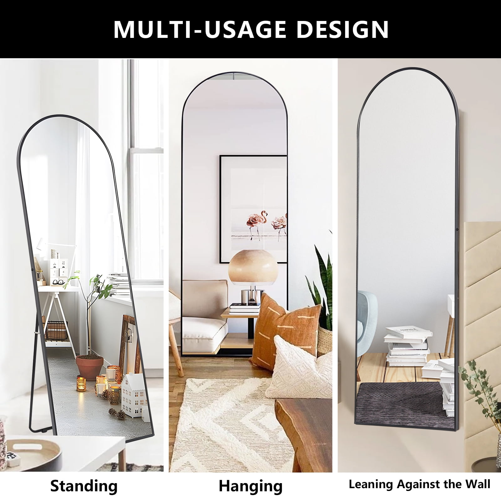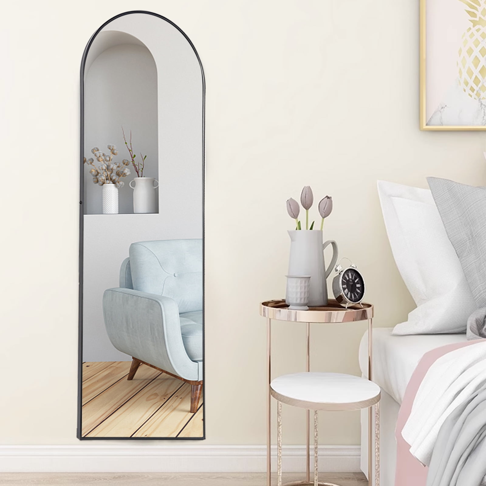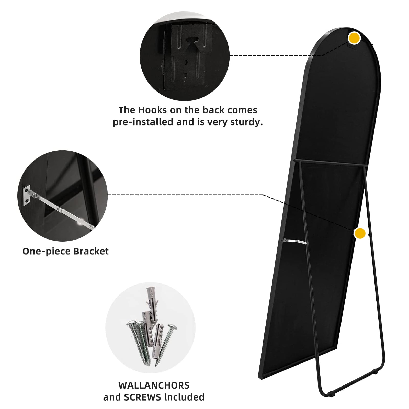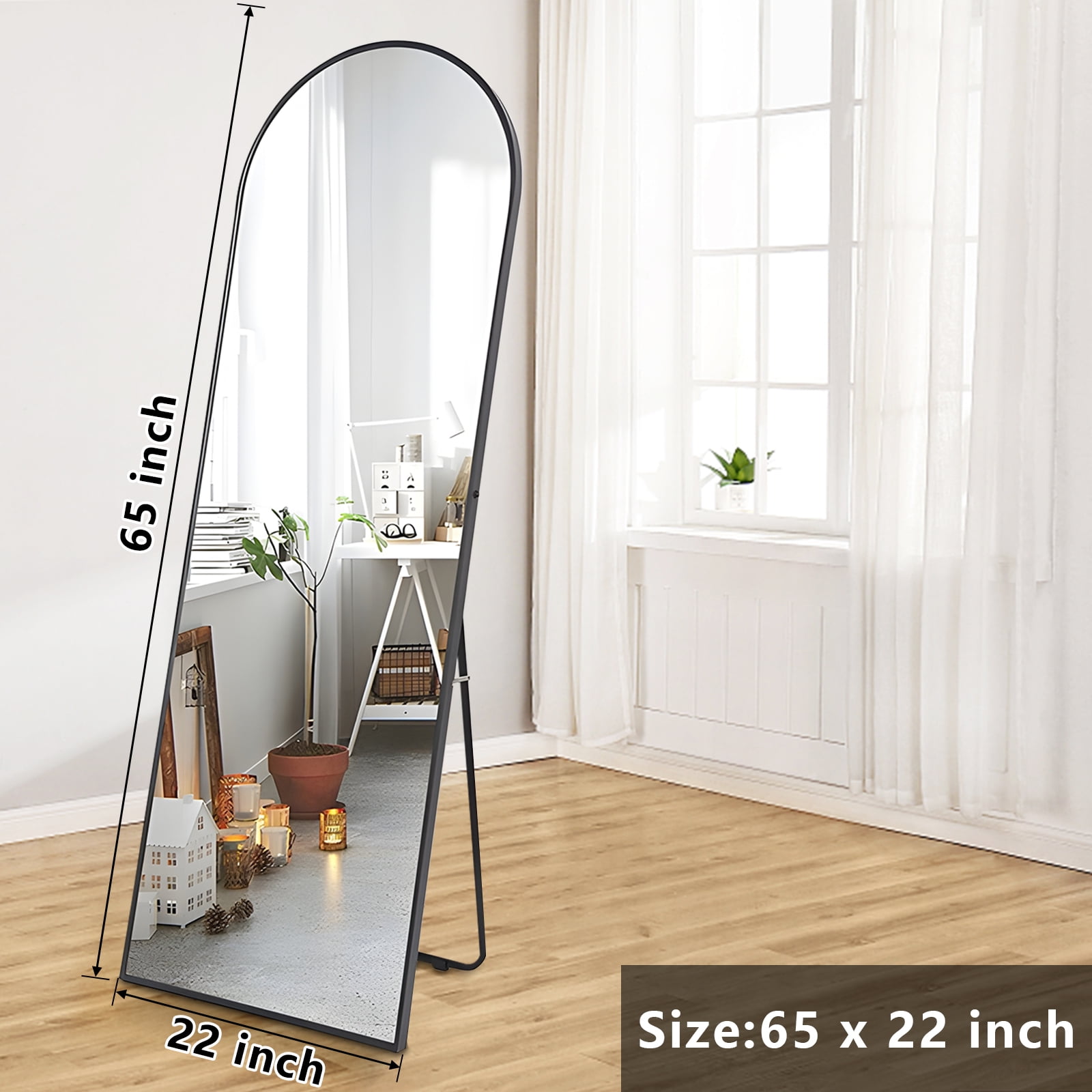 About this item 90% Glass, 10% Alloy Classic&Necessary Mirror: Our arched full length mirror is 65×22 size, free-standing, and easy to hang, making them the perfect addition to any room in your home. Choose from either a black or gold metal frame to match your decor, and enjoy a clear, crisp reflection in our vanity mirrors. Easy to Install: This floor mirror comes with a reinforced stand on the back, fully assembled and ready for use when unpacked. Bonus wall hardware and screws that can be hung with stable structures. Drill screws into the wall and chose two holes to hang the mirror on the screws to complete the installation. High Quality: The clear reflection in our mirrors allows for easy grooming and makeup application. No color or distortion, reflect and brighten your room with our wall-mounted mirror. Versatile & Functional: This full length mirror is suitable for any space that needs a mirror, a walk-in closet mirror that could be settled behind the door or in the closet, a vanity mirror that could be warm and inviting in living space, a hallway mirror that could check your outfit, etc. Timeless Stunning: We collaborated with various culture-based designers to create a diversified choice of your house improvement and furnishing styles. Perfect choice that would stay with you throughout the trends of home interiors.