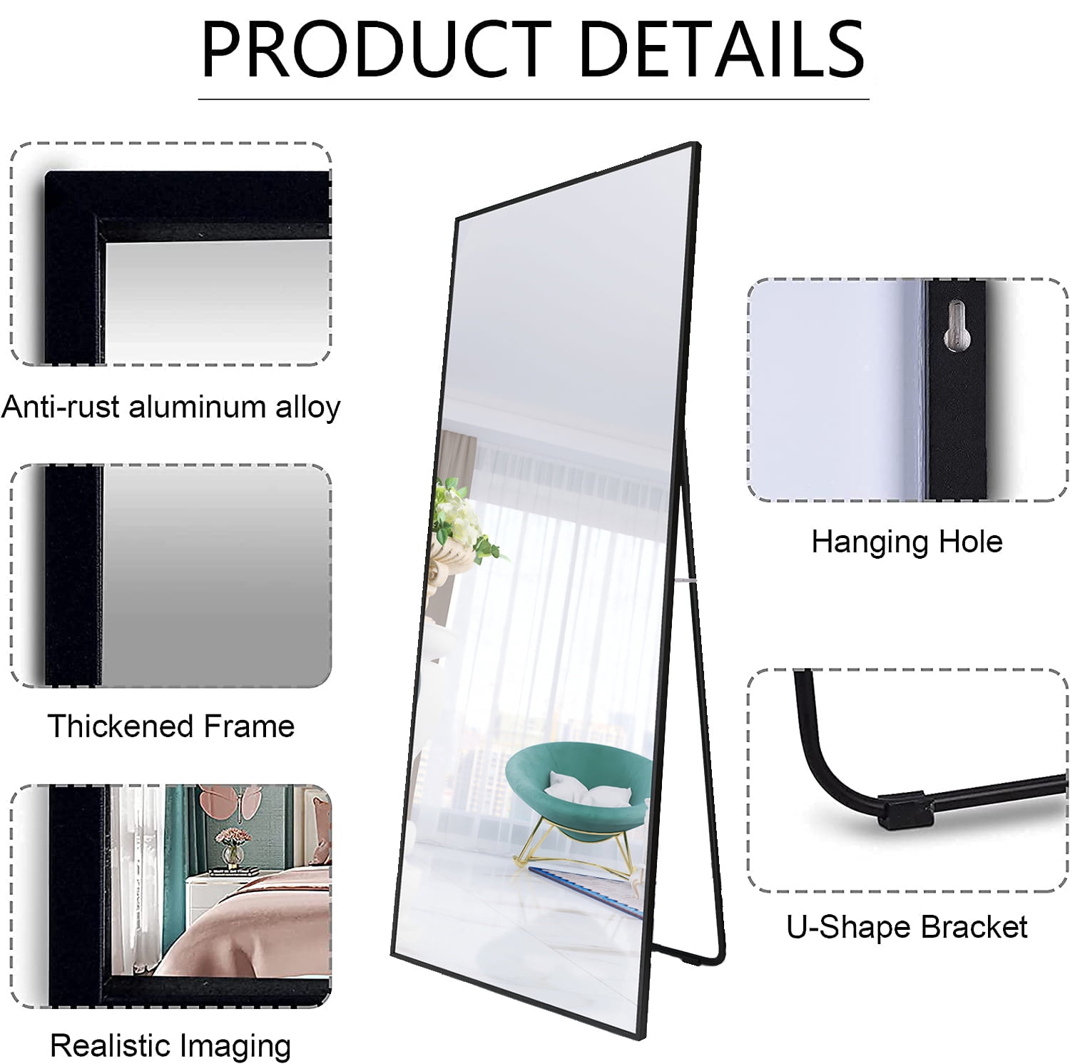 SUGIFT 65″x22″ Black Rectangular Full Length Floor Mirror with Stand Aluminum Alloy Frame Whether you want to get ready for an occasion or for everyday routine, a full length floor mirror will let you see yourself from head to toe and you see something special every time. Full length floor mirrors are exquisitely designed to enhance the decor of you room, to give it a touch of opulence. There are available in a variety of styles an color options to choose from. Product Description: Size: Standard full-size mirror, 22 x 65 Inches (Deviation may exist as the dimensions are measured manually) Material: Float glass & Aluminum Alloy Color select: Gold Features: 1.Absolutely safety floor mirror with explosion-proof membrane and scatter prevention. 2.Multi protective layers, offers longer service life than normal lens. 3.Invisible Slots on the back, enable to hang the mirror on the wall. Equipped with floor stand, you can easily move it to anywhere.