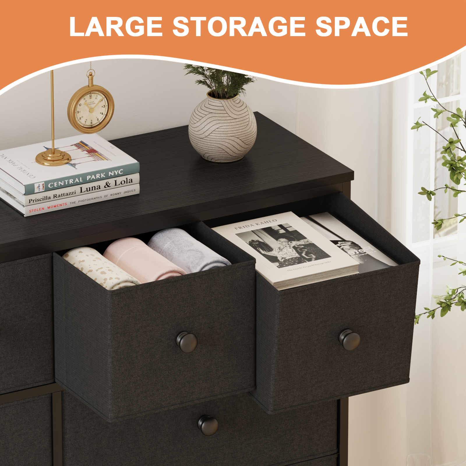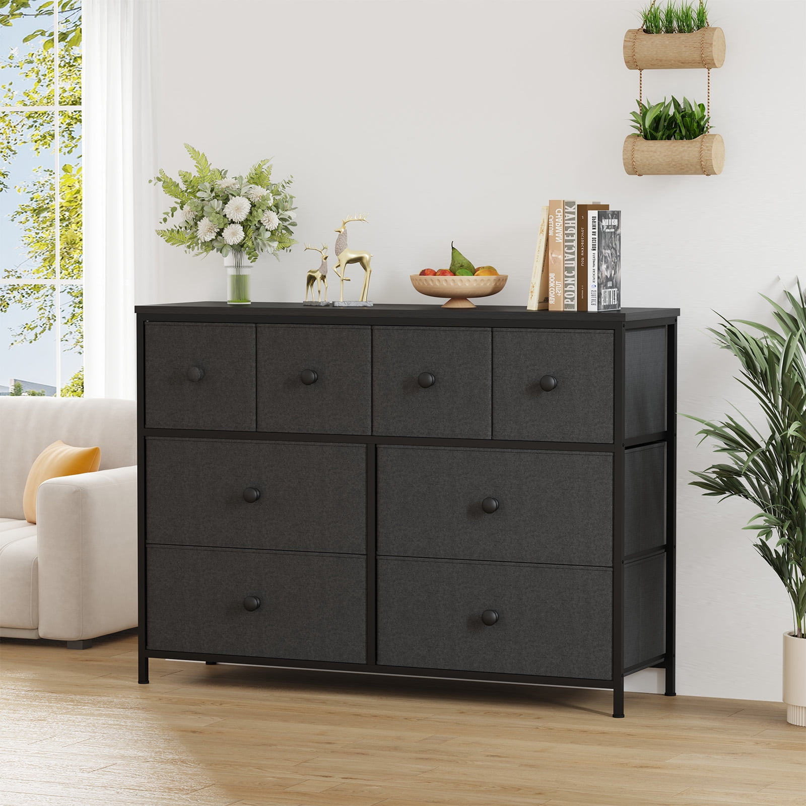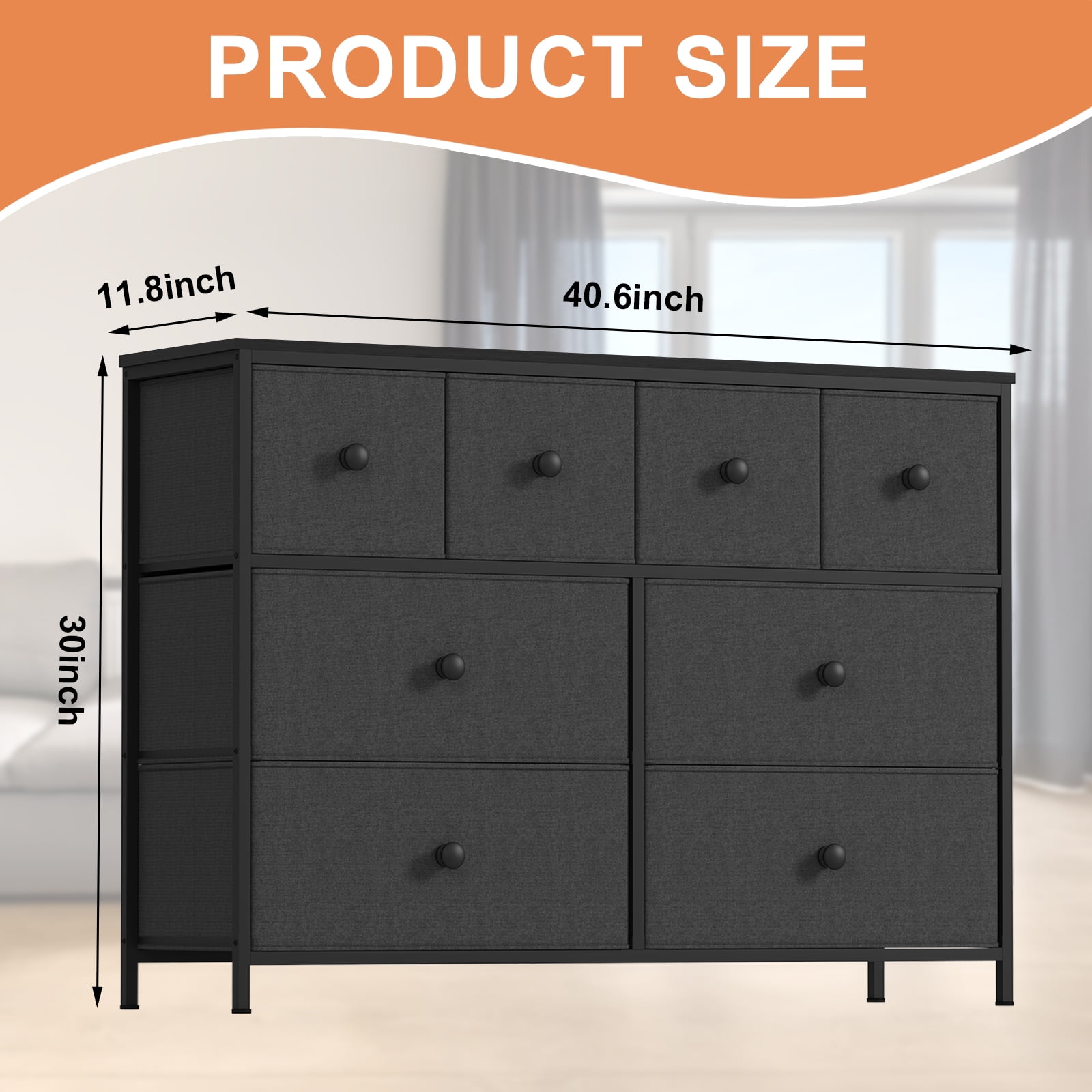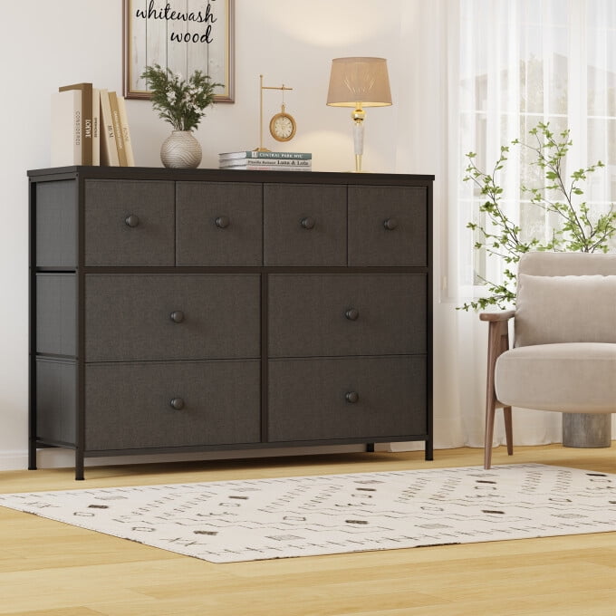 Organize your essentials in the SUGIFT 8-Drawer Dresser! Sleek and minimalist, this piece of furniture features a faux wood top and sturdy steel frame. Each drawer pulls out to organize all your clothes, linens and more. Place anywhere in your bedroom, office or college dorm to stay organized. The lightweight frame makes it easy to transport and when not in use, simply fold the fabric drawers flat for storage. Multipurpose Dresser: This chest of drawers is suitable for living rooms, closets, bedrooms, nurseries, hallways and entryways. The wooden top can hold a lamp, vase or other decorative items. Spacious Storage: 8 deep foldable drawers are spacious and offer endless organizational possibilities. The wood tops can hold items you want to display or keep, such as table lamps, photos …… Sturdy and Durable: The bedroom dresser can also be used as a TV stand to hold a small TV; features a sturdy steel frame, water-resistant top, and high-grade fabric drawers for longevity. Sleek Design: Simple pulls help smooth opening and closing of drawers; 4 adjustable feet protect floors from scratches and are designed for uneven surfaces. Overall Size: Spacious chest of drawers measures 40.5″ L x 11.8″ W x 30″ H. The bedroom dresser comes with detailed instructions and all the hardware needed, making it very easy to assemble. Specification: Material: Fabric, MDF, Alloy Steel Product Dimensions: 38.9″D x 11.8″W x 39.4″H Number of Drawers: 8 Color: Black Style: Rustic Mounting Type: Freestanding Room Type: Living Room, Bedroom, Hallway, Nursery, Kid’s Room Product Care Instructions: Wipe with a Dry Cloth Assembly Required: Yes Model Name: Dresser Size Overall Size: 40.5″L x 11.8″ W x 30″H.