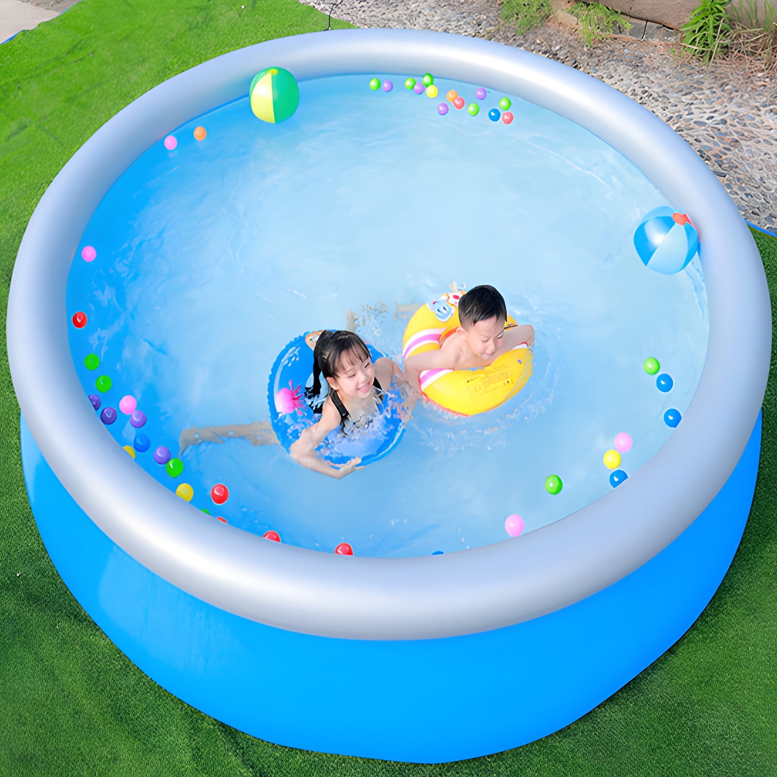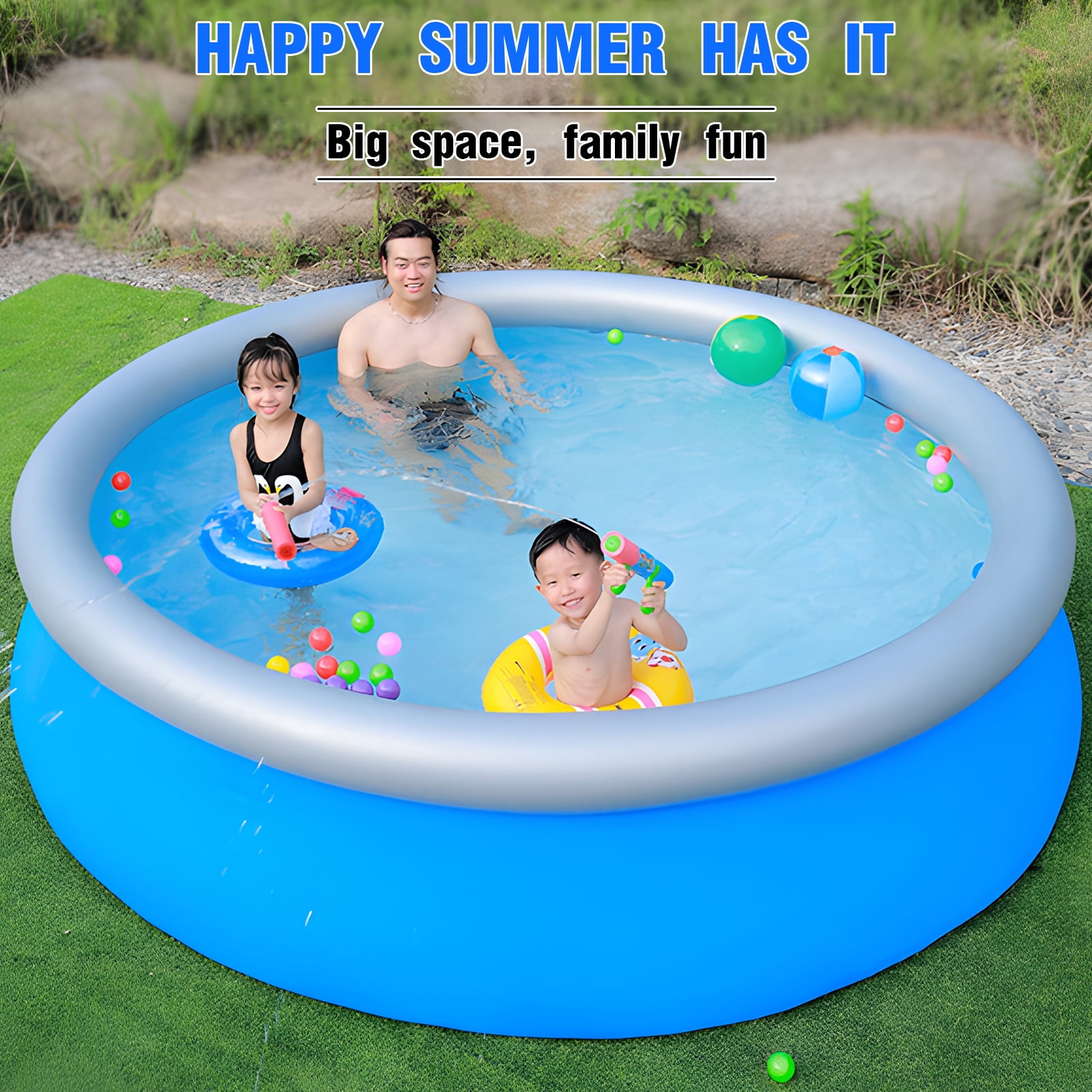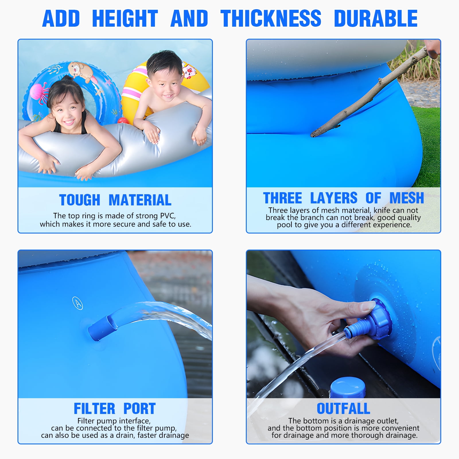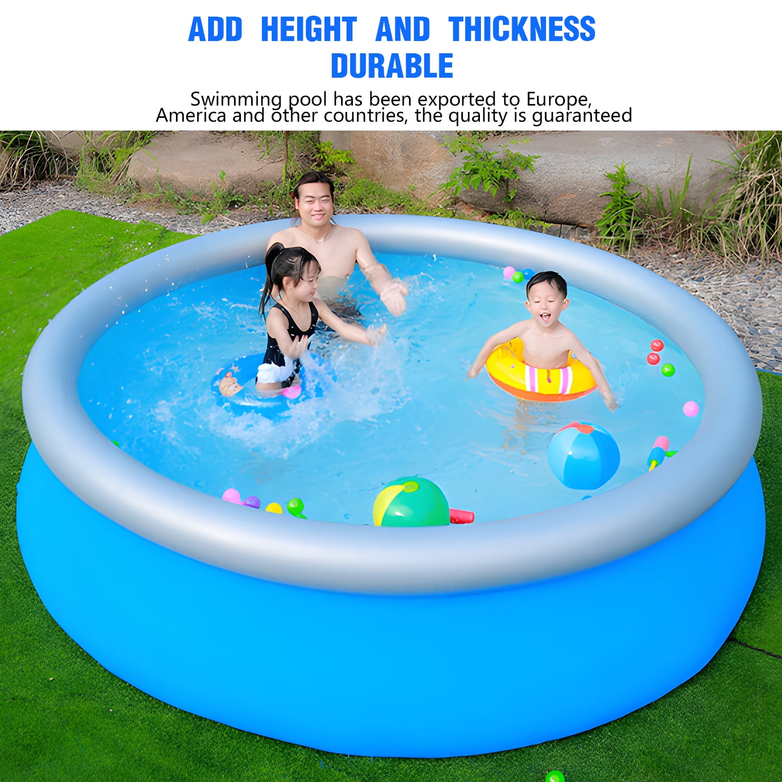 FAMILY INFLATABLE SWIMMING POOL: The inflatable swimming pool can accommodate 2 adults and 3-5 children. The inflatable pool has a large capacity for you to enjoy a splashy pool party in your backyard! DURABLE AND LONG LIFE: The inflatable swimming pool is made of 0.4mm ultra-durable eco-friendly PVC material. 50% thicker than other pools on the market, reducing the risk of punctures. Helps to prolong the life of the pool and your fun time. SAFE AND SOFT INFLATABLE POOL: Our inflatable pool is made of PVC. The bottom of the inflatable pool is super soft and inflatable, providing extra cushioning between the ground and your child for added protection while playing. EASY AND QUICK INSTALLATION: It takes about 3-4 minutes to inflate the adult swimming pool with an electric pump (not included), fill the pool with water and you are ready to enjoy your own pool time. The pool has a built-in drain plug for easy draining and deflating, so it can be easily folded and carried. Be sure to have this family pool in your backyard for summer enjoyment!