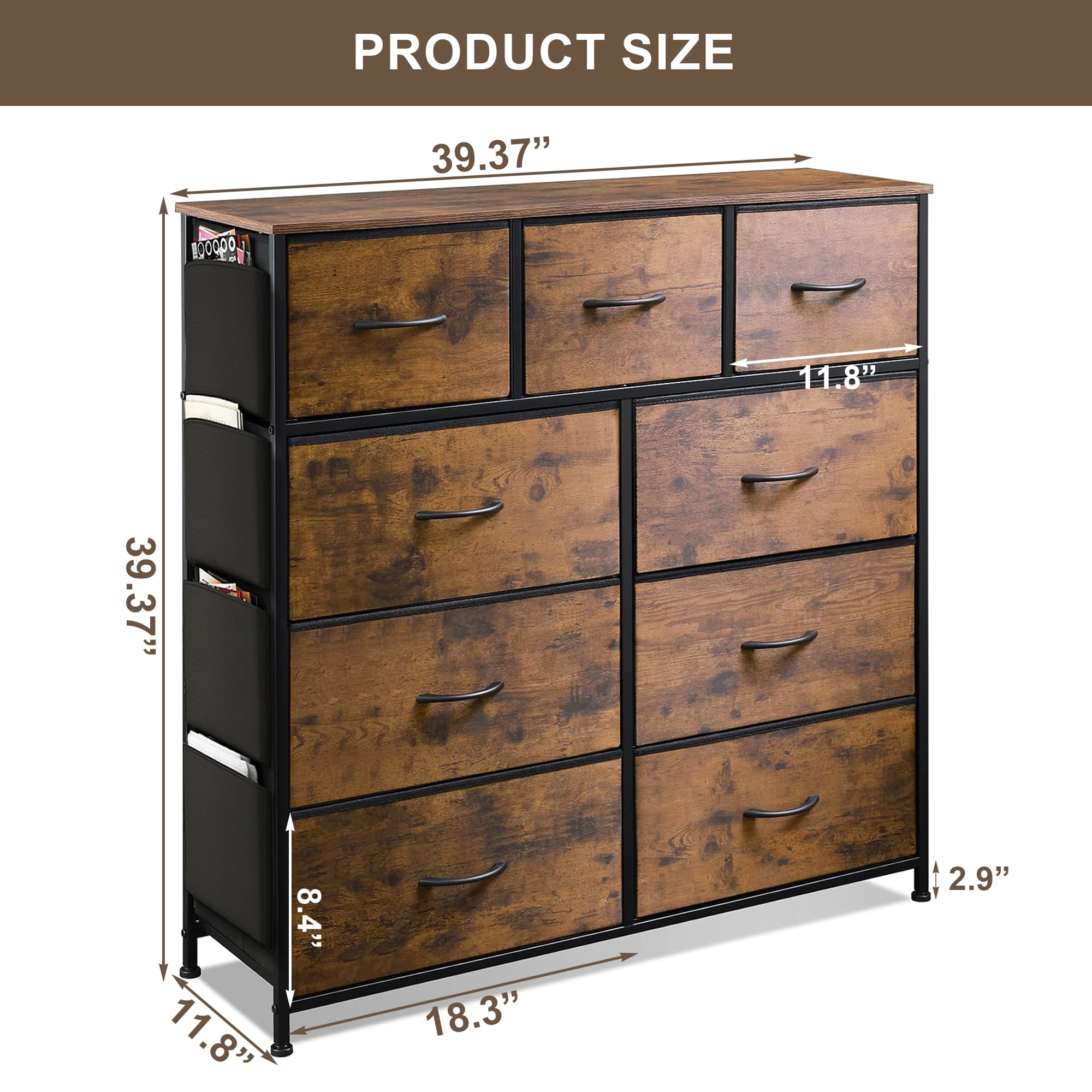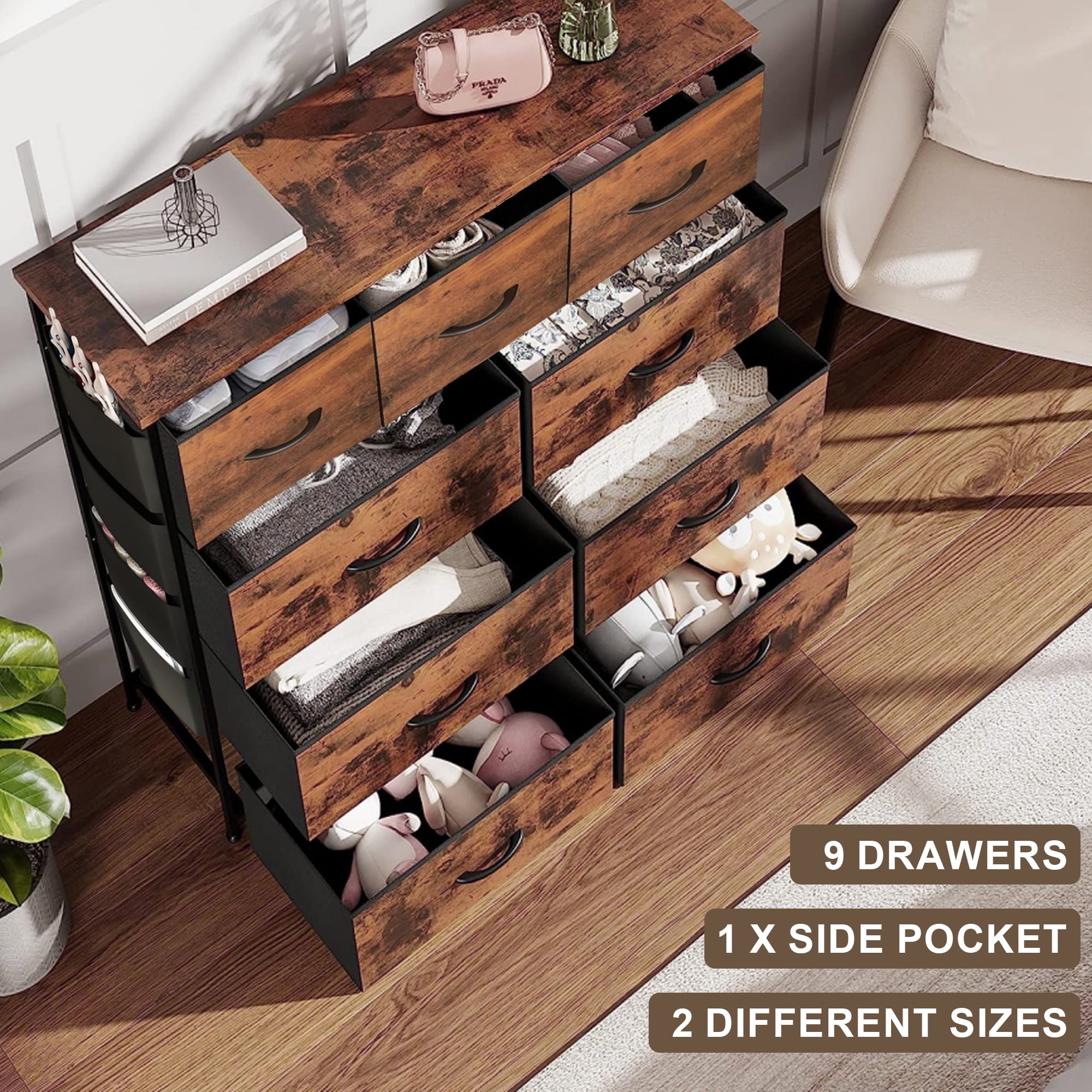 SUGIFT 9 Drawer Dresser, Chest of Drawers for Bedroom , Fabric Dresser with Side Pockets for Closet, Brown