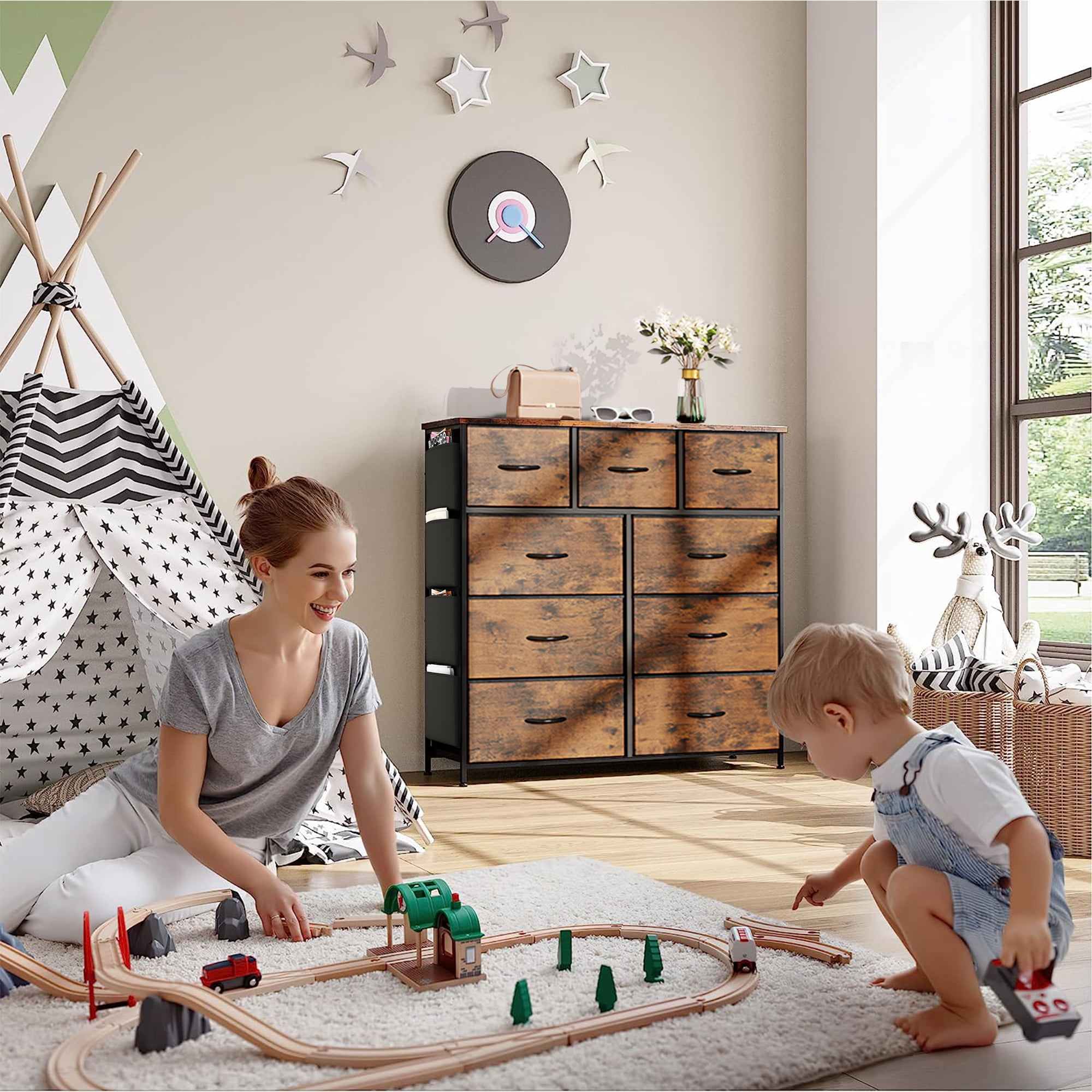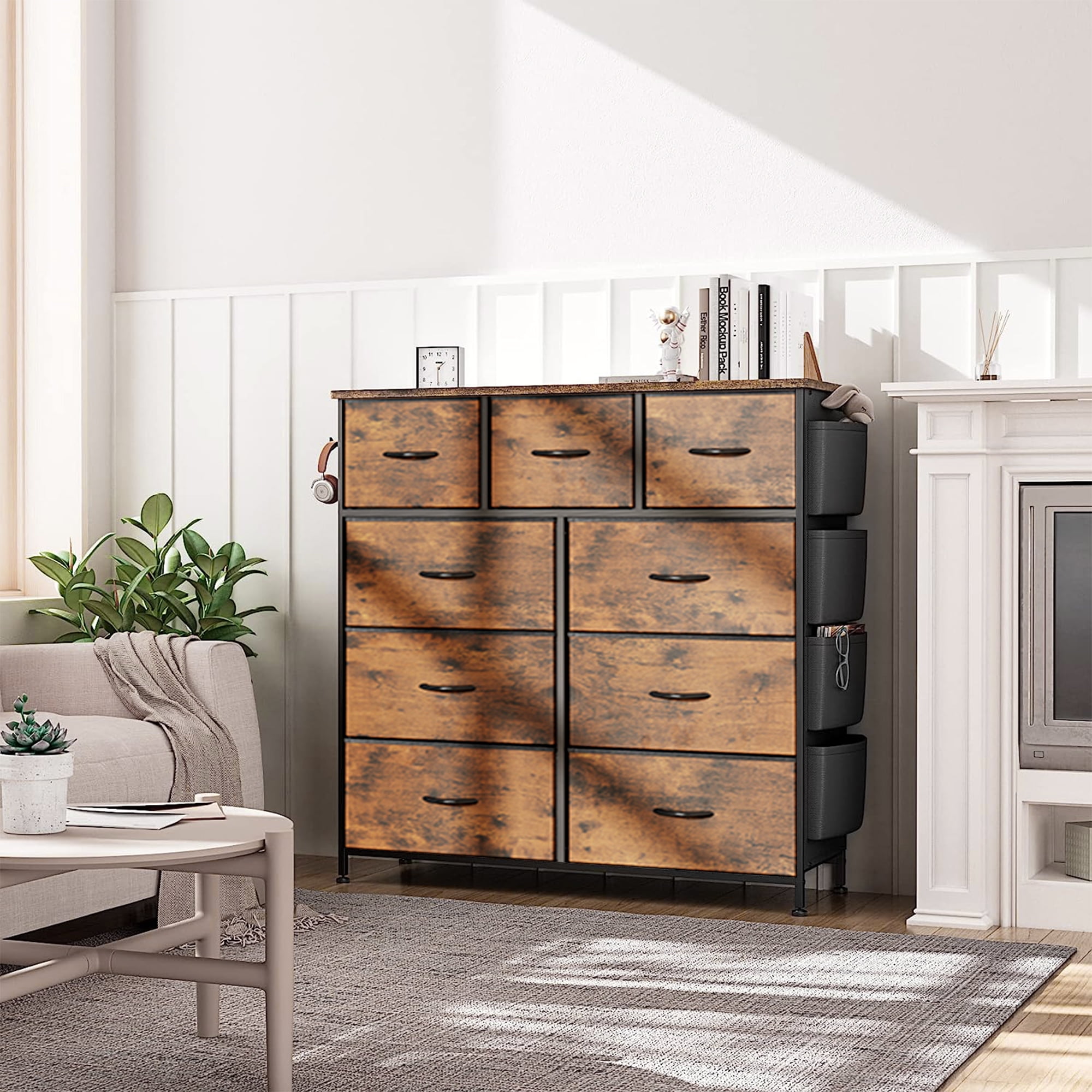 9 DRAWER DRESSER & AMPLE STORAGE SPACE: Our bedroom fabric dresser offers 10 separate collapsible drawers, including 6 large and 3 medium ones. Satisfy your organizational cravings with endless possibilities. The sturdy wood top acts as a convenient surface for easy access to your frequently used items. HIGH QUALITY & STABLE STRUCTURE: This tower chest of drawers is made of sturdy steel frame, MDF wooden waterproof countertop and high-grade non-woven breathable fabric, which offers reliable strength and stability, Meanwhile, the back bars upgraded the structural stability again! EASY TO ASSEMBLE & FRIENDLY CUSTOMER SERVICE: The package contains all tools and accessories for a swift 20-minute assembly, guided by detailed instructions. For any concerns, our friendly customer service stands ready to assist. Your email will receive a response within 24 hours, ensuring your satisfaction. UPGRADED DESIGN &SIDE POCKETS & HOOKS: Compared with others’ closet dressers,, our design includes 4 side pockets and 2 side hooks. These added features provide extra room for slender items and convenient hanging space for umbrellas, shopping bags, and small essentials. GET RID OF CLUTTER: This drawer dresser is your ultimate tidy companion. A seamless fit with contemporary decor, it enhances any space, whether it’s your bedroom, entryway, hallway, nursery, closet, or living room. Its compatibility with other storage furniture makes it a perfect addition.