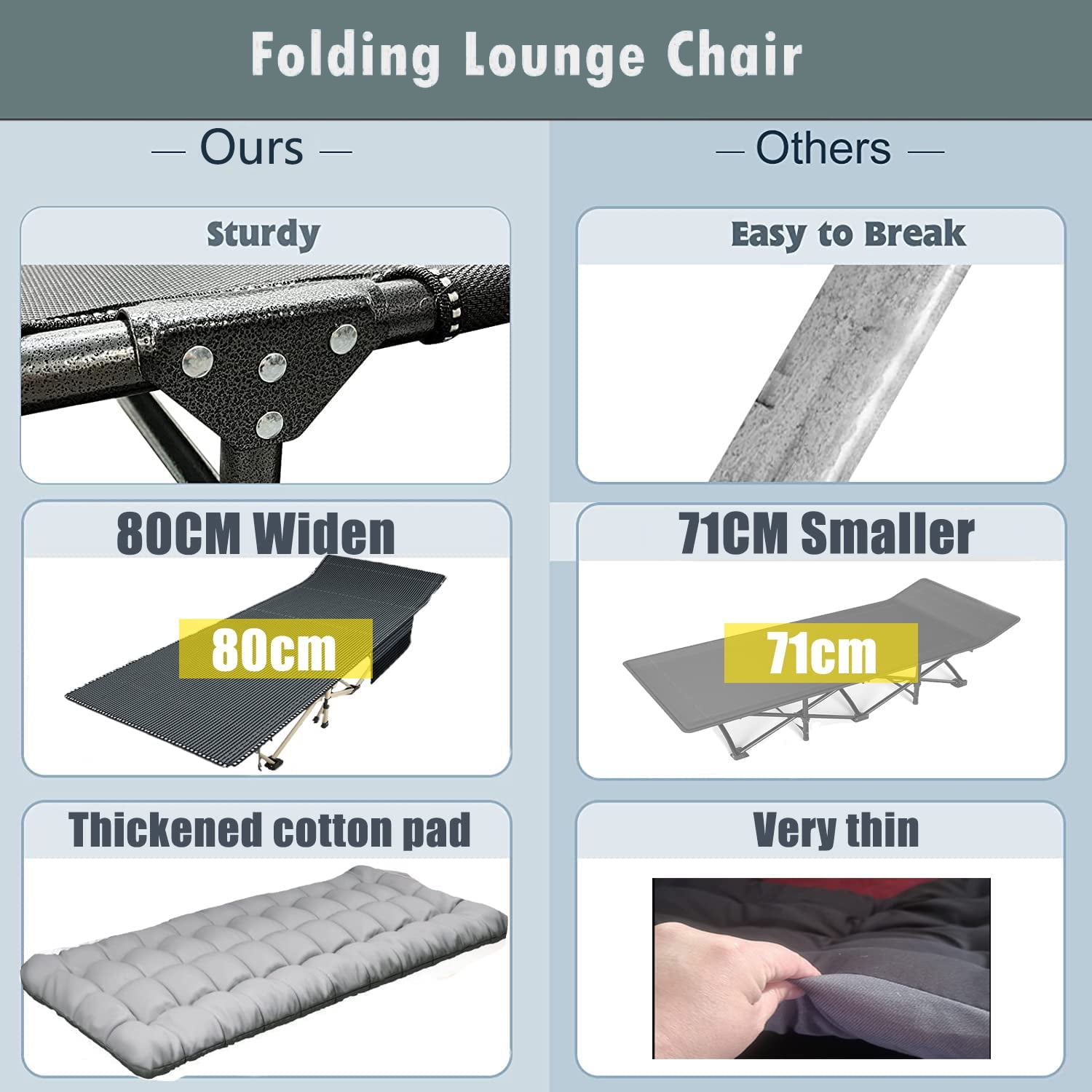 Highlights: High-quality raw materials – more durable and better load-bearing. Triangular reinforced structure – even force, stable, won’t topple over. Upgraded steel tubing – 1 inch wide widened square tube with high load-bearing capacity Side storage design – convenient to place small items such as cell phones when resting Ergonomic design – neck and back support Portable storage – lighter weight and smaller size when put away Specification: Material: 600D Oxford Cloth &Stainless Steel Size: 74.8*28*14.6 inch (L*W*H) Folding Size: 6.7*6.7*41.3 inch (L*W*H) Weight: 17 lb Weight Support: 600 lb