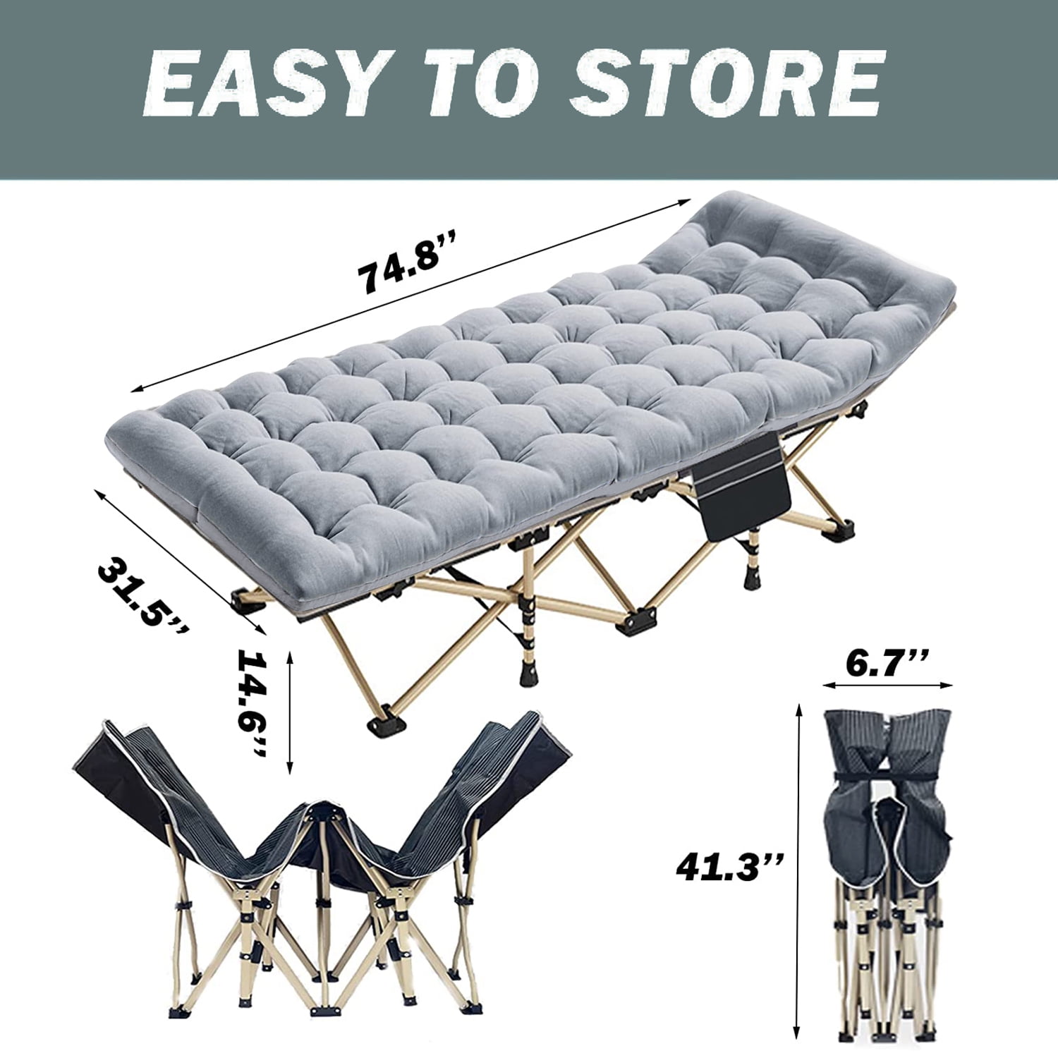 Features: WIDE RANGE OF APPLICATIONS: Great folding bed, outdoor bed, camping cot with mattress, suitable for hiking, camping, travel, hunting or as an easy bed for office; also perfect temporary bed for guests visiting. HIGH QUALITY MATERIALS: Our adult camping beds are made of square rustproof steel frame, durable thick tube and 600D oxford fabric. Compared to other products, our raw materials are of higher quality and the camping bed can support up to 600 lbs. FREE INSTALLATION: Our folding beds do not require any installation and can be opened or closed in seconds. COMPACT DESIGN: The folding bed is designed to save space and it is easy to carry and store. This folding camping bed is perfect for outdoor and indoor use, such as home, office, park, beach… REMOVABLE PAD: This camping bed can sleep on a high quality mattresses. The mattress is a soft, removable pad for extra comfort and warmth while sleeping.