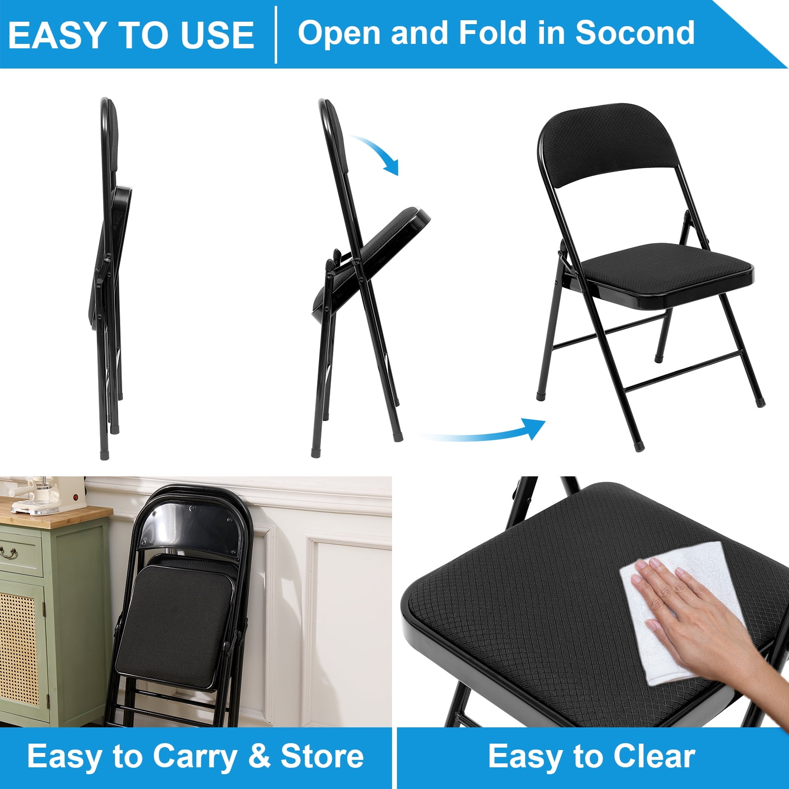 SUGIFT Fabric Padded Folding Chair Portable Dining Chairs 6 Pack, Black