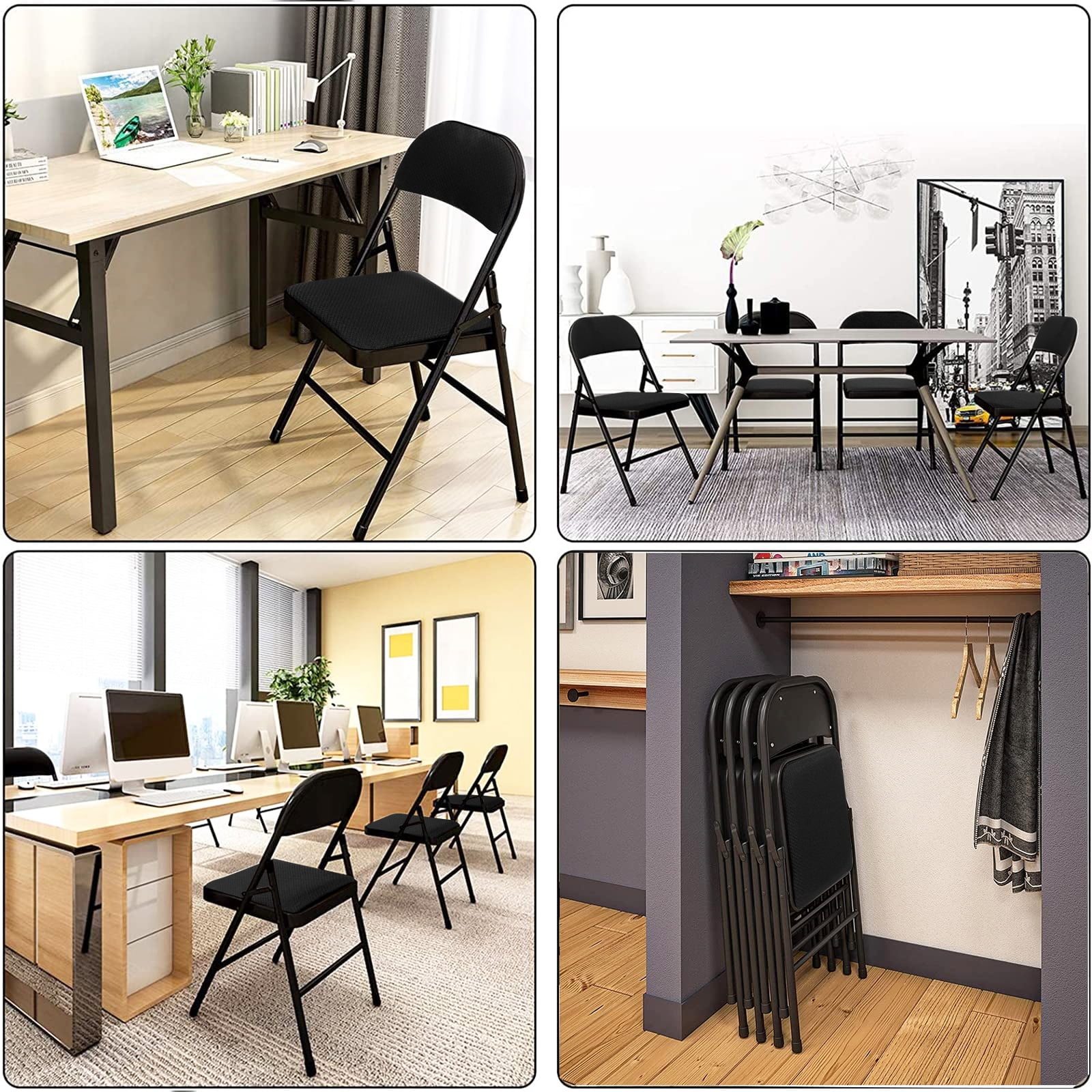 [STABLE AND STURD]: Our padded folding chair feature a sturdy steel frame with a padded seat. The triangle structure and non-slip pads ensure stability and durability, both indoors and outdoors, without leaving scratches on the floor. [SPECIFICATIONS]: Dimensions of each folding chair padded are 18″D x 18″W x 31″H. This folding chairs set of 6 is reliable and sturdy, perfect for bedrooms, dorm rooms, apartments, lounging, and gardens. The black folding chairs come pre-assembled and can be used right away. They feature a classic “Y-frame” design with double-riveted leg cross braces and double hinges for added stability. [EASY TO FOLD & NO NEED TO INSTALL]: Our folding chairs with padded seats package includes a 6-pack of chairs that fold up easily for convenient storage. The all-steel structure with double hinges and welded cross braces supports up to 330 lbs. When not in use, the folding padded chairs can be folded flat. Hinges on each side provide extra stability. [NON-SLIP FOOT PADS]: The padded folding chairs 6 pack have non-slip foot pads that prevent floor scratches and keep the chair in place. The 15.75″ x 15.75″ large chair cushion ensures comfortable seating, improving study and Adult work efficiency. [COMFORTABLE FOLDING CHAIR & HIGH-QUALITY SERVICE]: Our metal folding chairs set of 6 are made with high-quality Fabric and thick foam padding, reducing back pressure and leg pain during long periods of sitting. They provide comfortable seating for work or study throughout the day. If you have any questions, please contact us for a satisfactory solution.