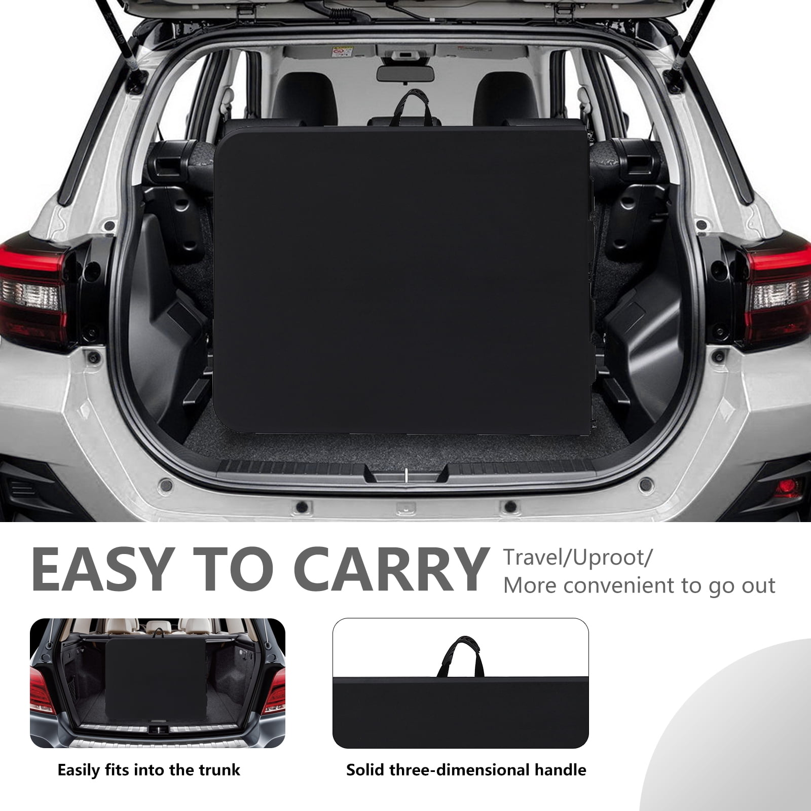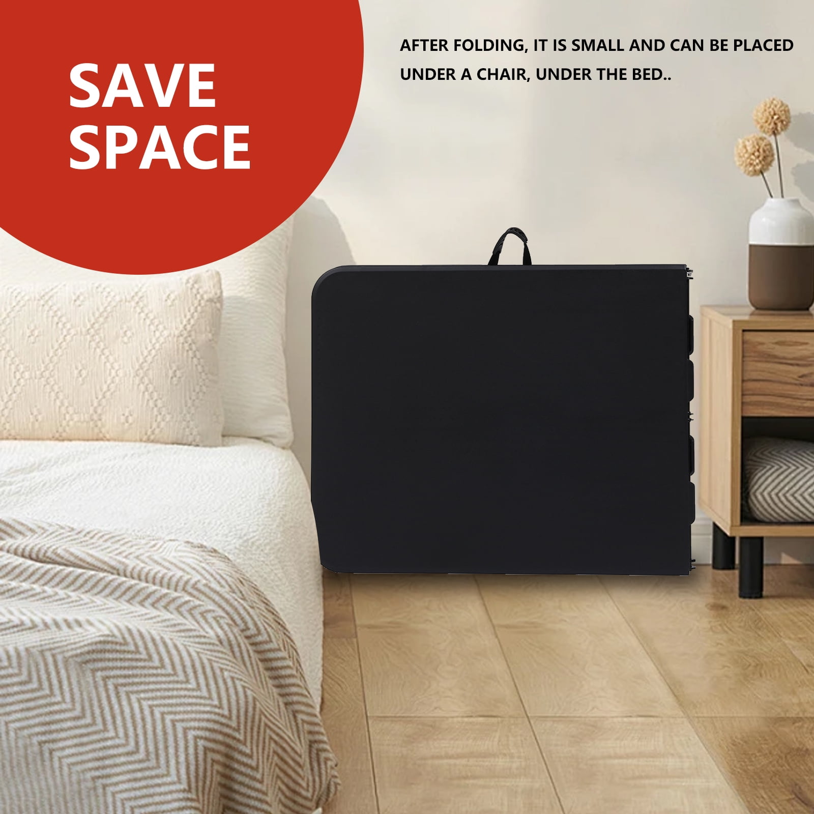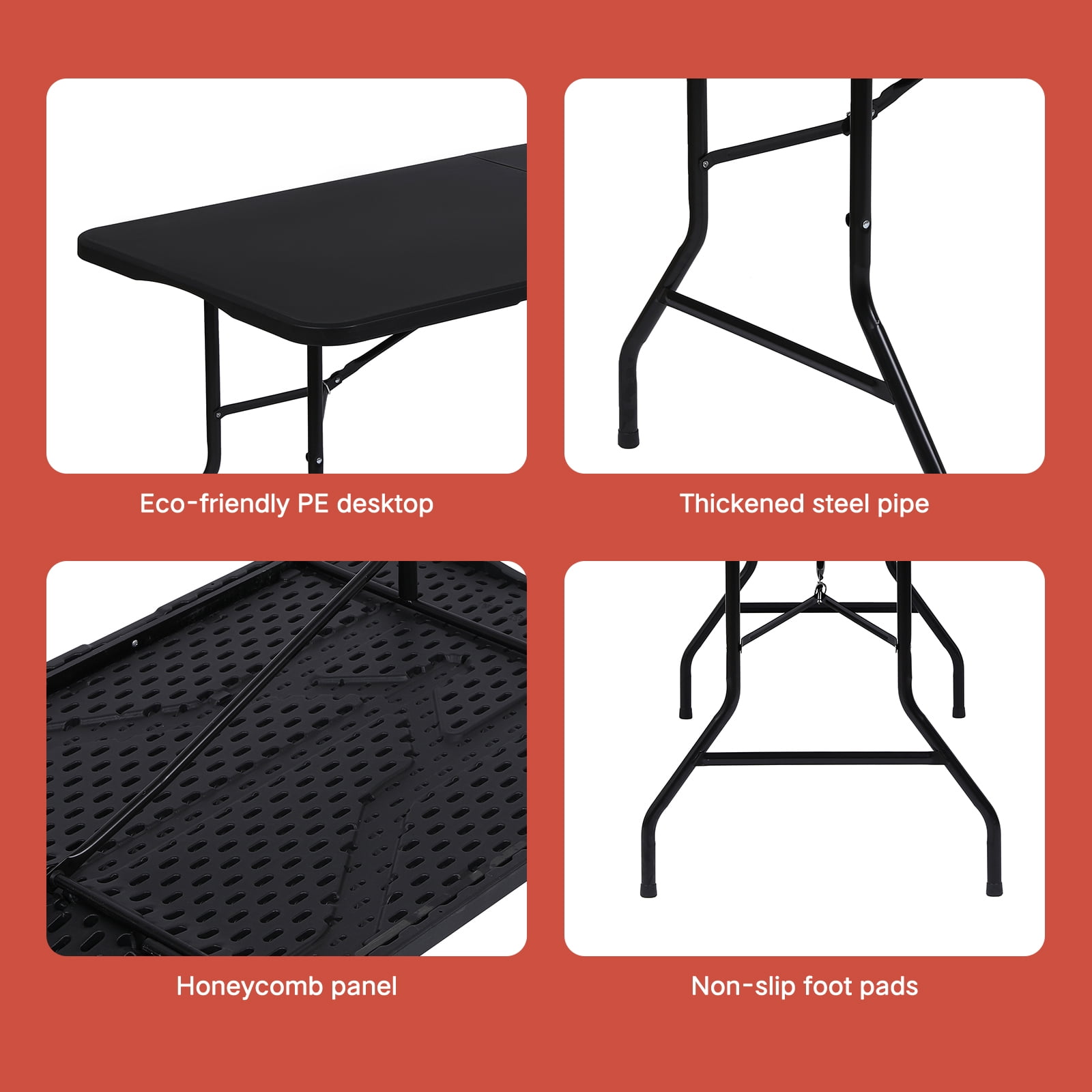 This table is perfect for everything from weddings, baby showers and banquets to game nights with family and friends The versatility of this piece makes it perfect for any occasion. This table can be used for gatherings, arts and crafts or dinner events and is a wise investment for any catering or hospitality business. When no longer in use, fold the legs in and store away. About this item 【Portable】 Foldable design of the folding table includes a side lock and handle, making the the camping table easy to take on the go or store away in a compact space when not in use the plastic table. 【Take The folding table to Anywhere】camping table comes with a handle, great for commercial use, parties, backyard events, traveling, family exercises, etc. You can take the plastic table to everywhere you want. 【Sturdy Support】 The folding table with Powder-coated steel legs, the camping table frame joint locks, and non-slip rubber feet help to keep the plastic table in place during every event. 【Easy to fold up and be stored away】You can fold the folding table up and easily store behind your dresser, Then the camping table are outta sight, and easy to grab the plastic table when needed. 【No assemble needed】The folding table come fully assembled and folded of the camping table.You only need open the box,take out of the plastic table.Then you can use it. Specifications: Color: Black Material: HDPE, Steel Pipe Desktop Thickness: 1.75″ Seating Capacity: 8 Adults Product Expansion Size: 72″ x 29″ x 29″ (L x W x H) Folding State Size: 36″ x 29″ x 2.76″(L x W x H) Weight: 23.2lbs Capacity: 330 lbs