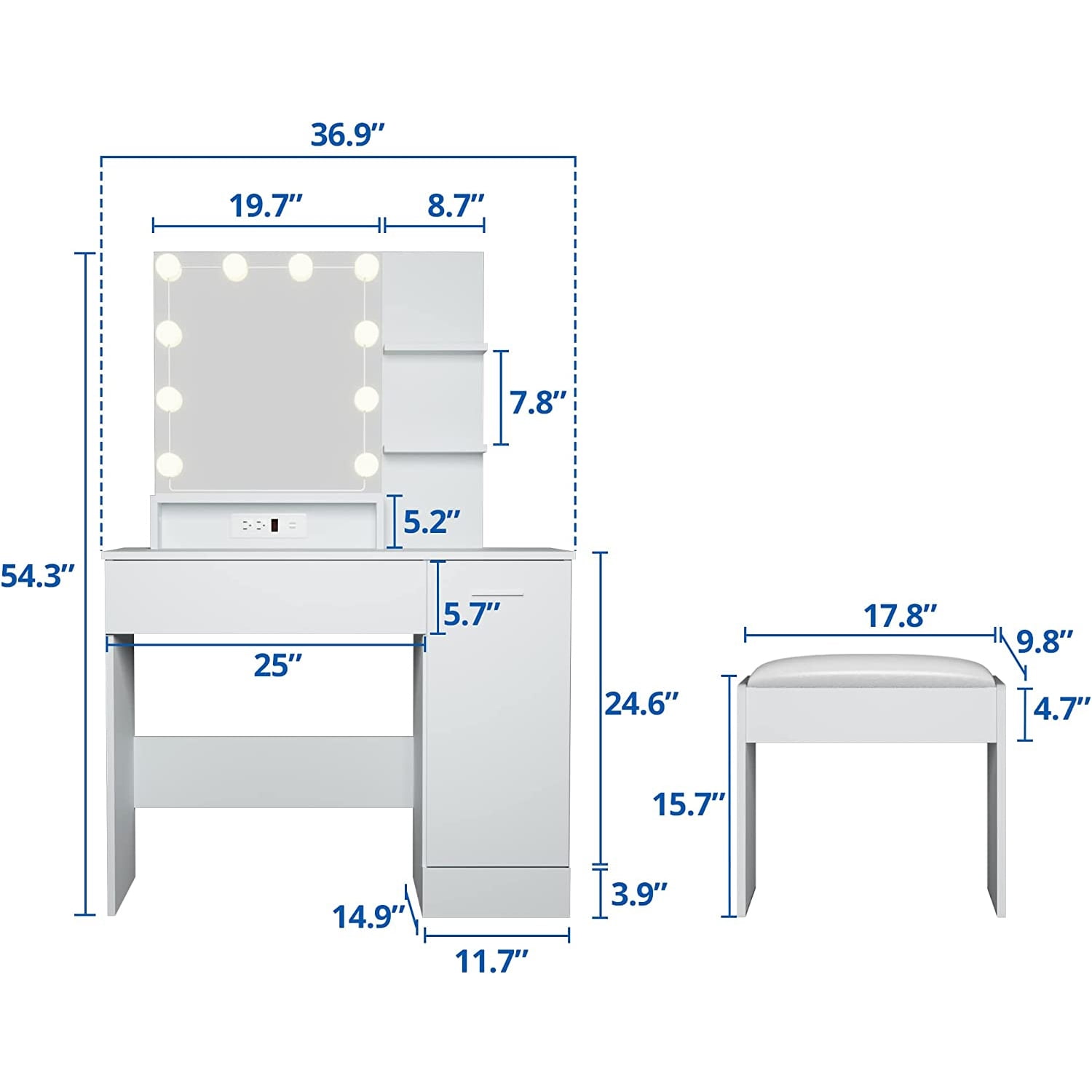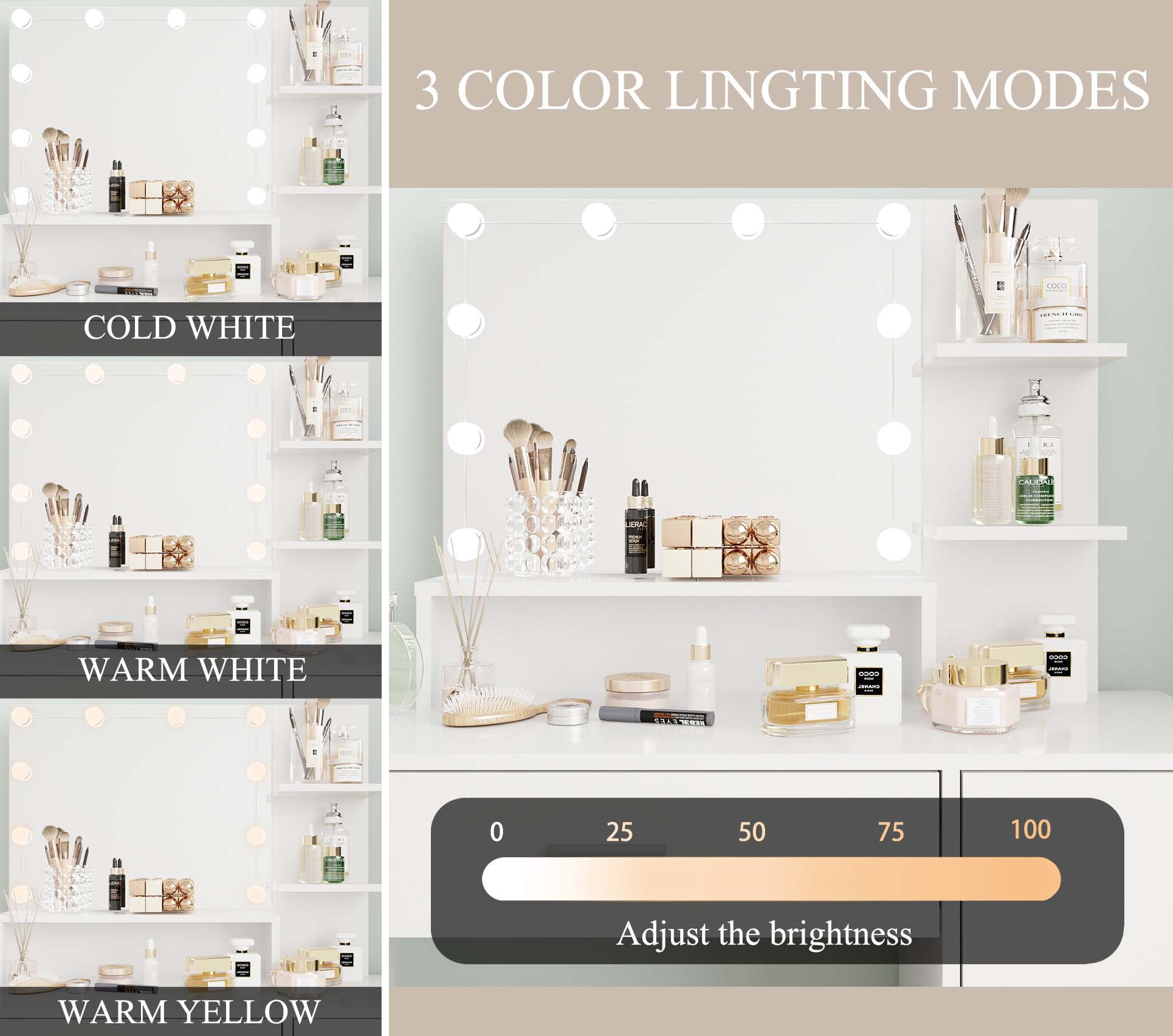 The SUGIFT Makeup Vanity with Mirror is a modern and stylish addition to any bedroom. This makeup table set features a vanity desk with a large mirror and lights, offering the perfect space for getting ready in the morning or before a night out. The white vanity is sleek and elegant, adding a touch of sophistication to your room decor. This vanity set is designed for convenience and functionality. It comes with one big drawer and one cabinet, providing ample storage for all your beauty essentials, such as makeup, skincare products, and accessories. Additionally, there are four shelves that offer extra space for organizing your belongings. One of the standout features of this makeup vanity set is the built-in lighting options. With three different lighting modes and adjustable brightness, you can effortlessly create the perfect ambiance and ensure optimal lighting for applying makeup. Whether you prefer a soft glow or a bright light, this vanity set can cater to your needs. The SUGIFT Makeup Vanity with Mirror is not only practical but also visually appealing. Its clean lines and minimalist design make it suitable for various interior styles, from contemporary to classic. The sturdy construction ensures durability and longevity, making it a worthwhile investment for your beauty routine. If you’re looking for a functional and aesthetically pleasing vanity set, look no further than the SUGIFT Makeup Vanity with Mirror. It combines style, storage, and customizable lighting options, allowing you to transform your daily beauty routine into a luxurious experience.