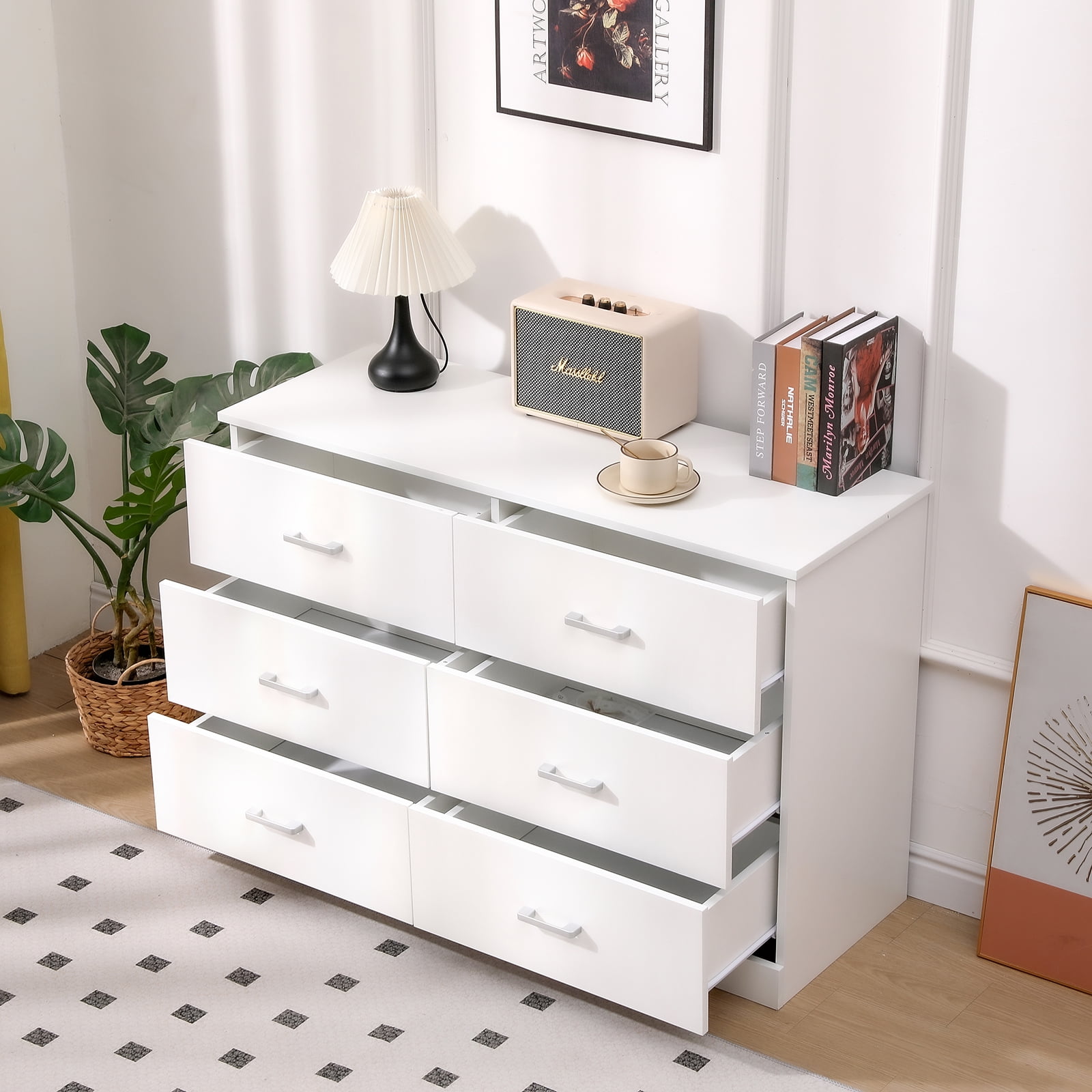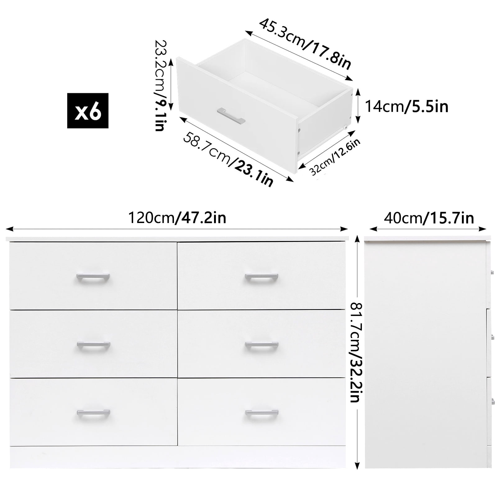 Material: MDF Wood Color: White Dimensions: (47.2 x 15.7 x 32.2)” (L x W x H) Number of Drawers: 6 Pcs Recommended Room: Family Room, Bedroom, Living Room, Home Office,Entryway Recommended Location: Indoor
