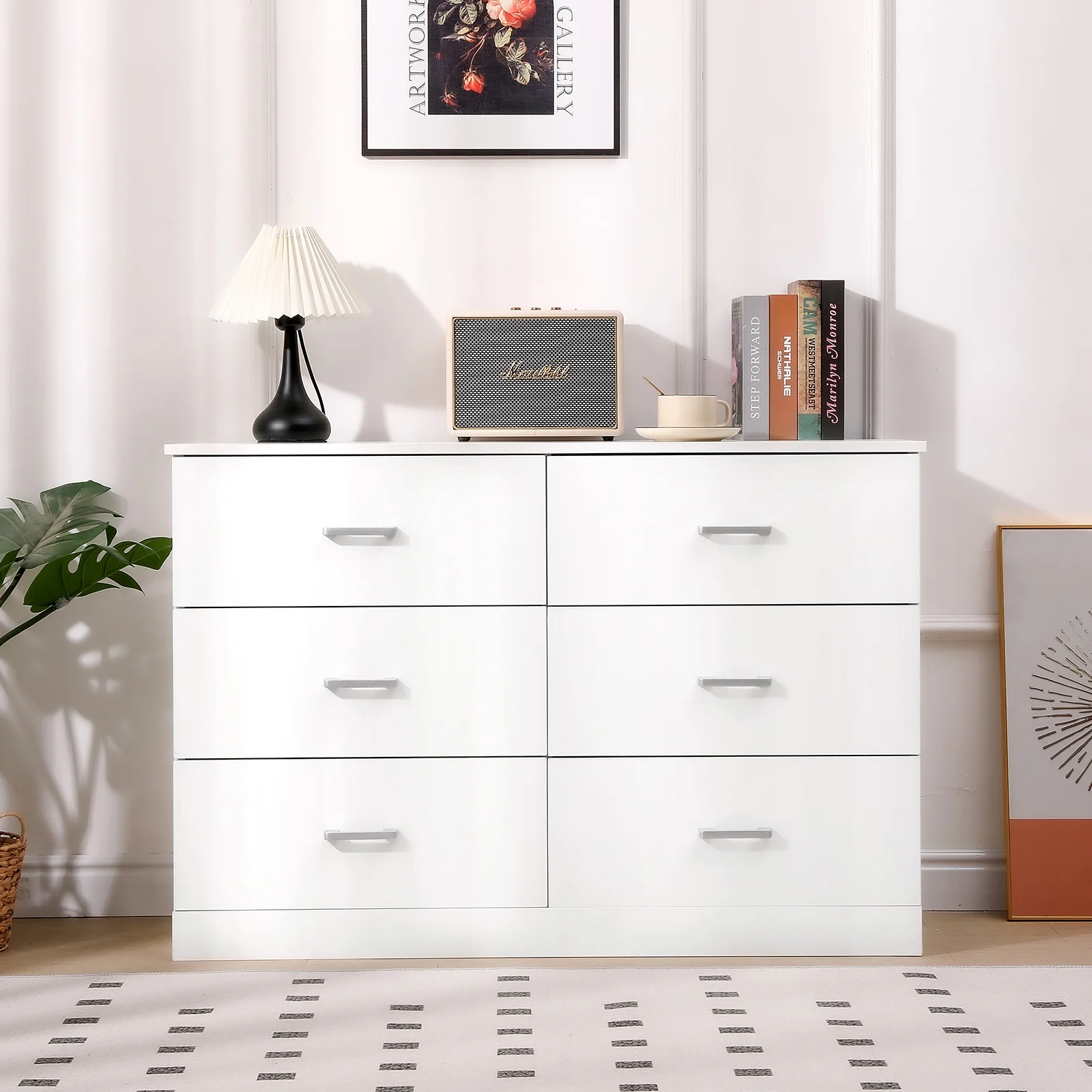 The SUGIFT Modern 6 Drawer Wood Dresser is an elegant and practical addition to any bedroom, living room, or hallway. This dresser features a sleek and contemporary design that effortlessly blends with various decor styles. Crafted from high-quality wood, this dresser guarantees durability and longevity. With its spacious six drawers, this dresser provides ample storage space for a variety of items. From clothing and accessories to household essentials, this dresser keeps everything organized and easily accessible. The wide drawers offer enough room to accommodate larger items, making it perfect for storing bulkier clothing items or blankets. The dresser’s white finish adds a touch of sophistication and brightness to any space. It effortlessly complements existing furniture and brings a fresh and modern look to the room. Additionally, the combination of white and gold handles adds a stylish and luxurious touch to this piece. Designed with functionality in mind, this dresser is equipped with metal handles that ensure comfortable grip and easy opening and closing of the drawers. The sturdy construction of this dresser ensures stability, while the smooth gliding mechanism of the drawers allows for effortless operation. Whether placed in a bedroom, living room, or hallway, the SUGIFT Modern 6 Drawer Wood Dresser is a versatile storage solution that combines style and functionality. Its white color scheme, wooden construction, and gold accents make it a standout piece in any space. Upgrade your home organization with this beautiful and practical dresser.