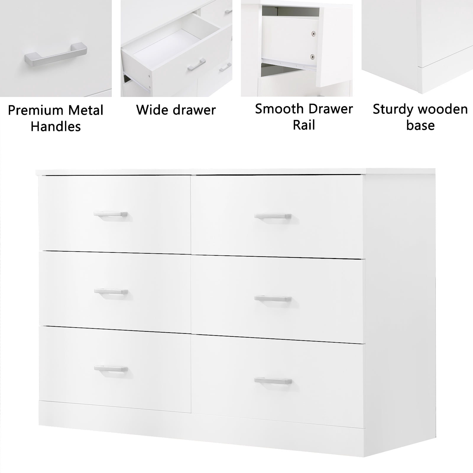 SUGIFT Modern 6 Drawer Wood Dresser Wood Lateral Chest of Drawers Storage Organizer with Wide Drawers & Metal Handles for Bedroom/Living Room/Hallway