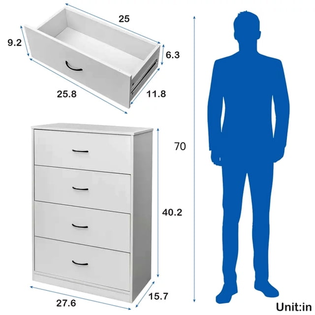 Storage when you bring home this unique chest of drawers. 4 wide drawers can organize anything from shirts, socks and hats to diaper and toys, this wood dresser will meet all your storage needs.This dresser chest need not be limited to the bedroom. You can put it in your entryway underneath a mirror, or use it in your living room or closet to showcase your decorative taste. It makes a versatile addition to any loft apartment.The dresser with 4 drawers is a contemporary take on a simple look, finished knobs added to the chic design for a fashionable cabinet, it’s stunning! Constructed of high-grade MDF, premium metal slides that can be pushed and pulled smoothly, the White dresser meets your pursuit of quality. The surface is coated with environmentally friendly paint, which is waterproof and easy to clean.The package includes clear instructions and marked parts that you can quickly install this storage chest. And please contact us if you have any questions.