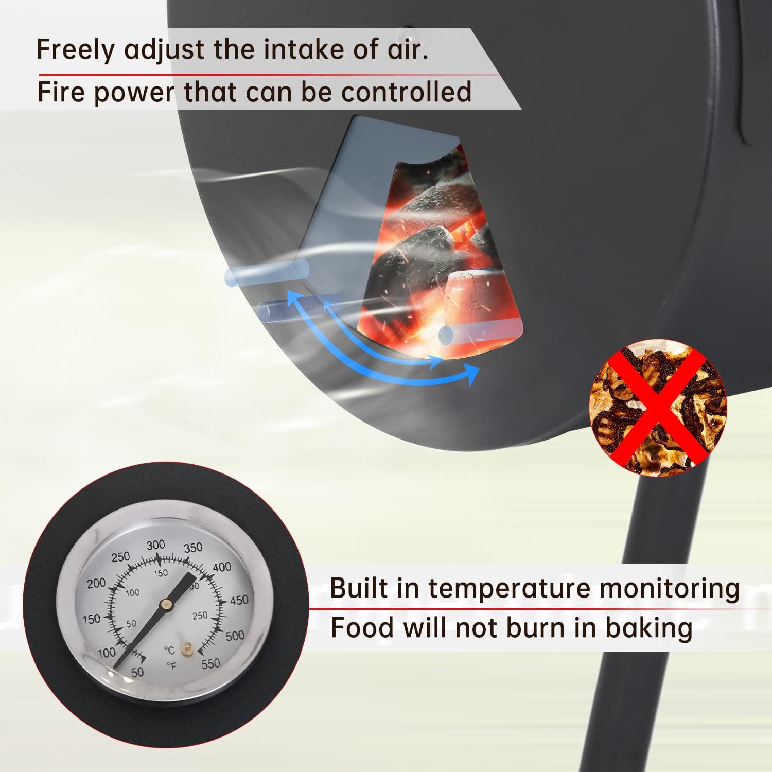 – Safe Use: The top lid is assembled with a thermometer which is easy for you to read the temperature. Wooden handles effectively prevent you from being burnt. The front wood shelf is designed for putting grilling tools or spices on it and is easy to reach.