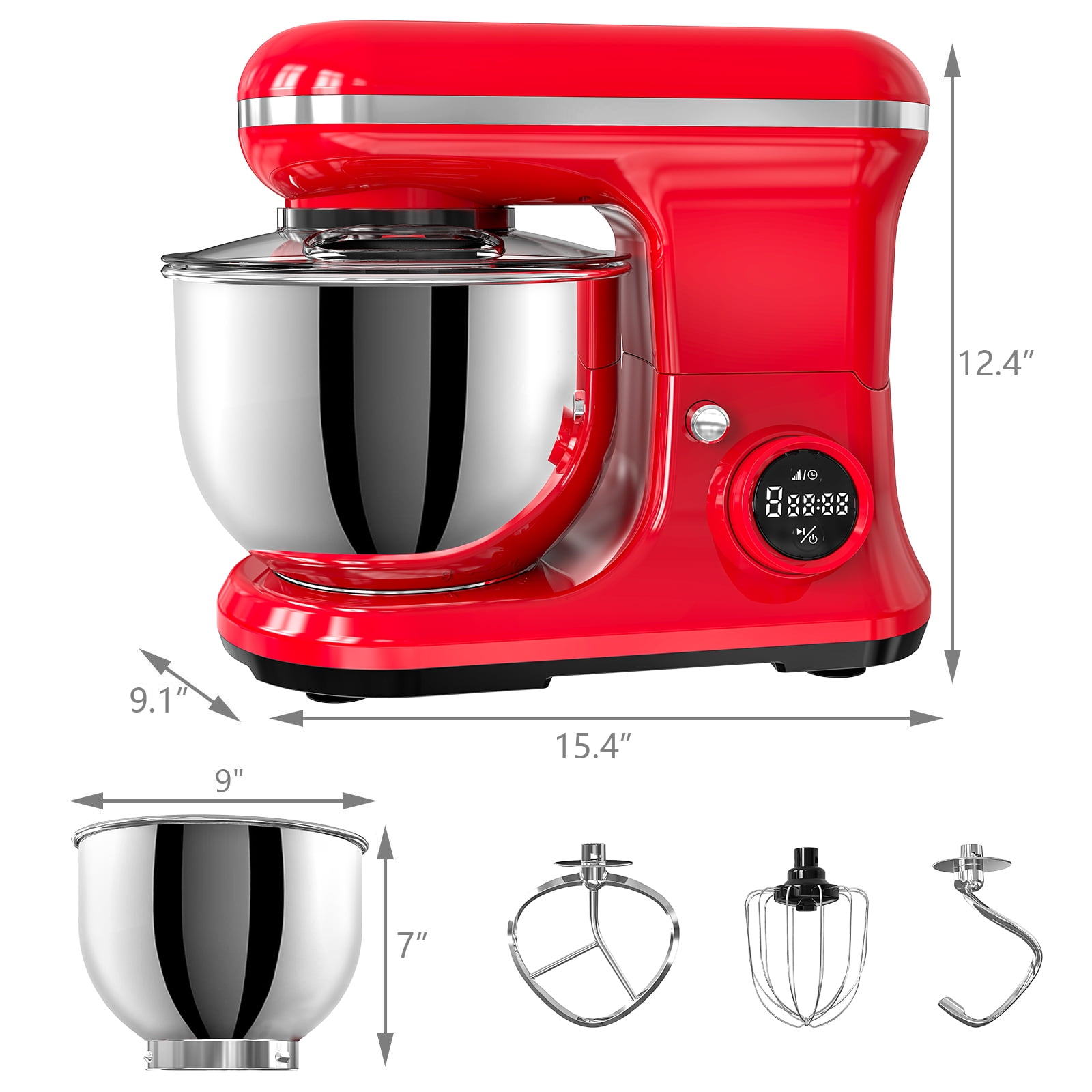 Introducing the 5.3Qt Electric Food Mixer, a versatile kitchen companion designed to elevate your cooking experience. With a powerful motor and a spacious 5.3-quart stainless steel bowl, this mixer effortlessly handles everything from dough kneading to delicate cake mixing. Its intuitive controls offer precise speed settings, ensuring thorough blending and whipping. Sleek in design and equipped with multiple attachments, including a whisk, dough hook, and beater, it simplifies meal preparation from start to finish. Ideal for both amateur cooks and culinary enthusiasts alike, the 5.3Qt Electric Food Mixer combines efficiency with ease, making it a must-have in every modern kitchen. Specification Color: Red Material: ABS + Stainless Steel + Rubber Product Dimensions: 9.1” x 15.4” x 12.4” (L x W x H) Mixing Bowl Size: 9” x 7” (φx H) Mixing Bowl Capacity: 5.3 Quart Net Weight: 9 lbs Voltage: 120V/60Hz Power: 500W Package includes: 1 x Stand Mixer 1 x User Guide 1 x Dough Hook 1 x Beater 1 x Whisk 1 x Mixing Bowl