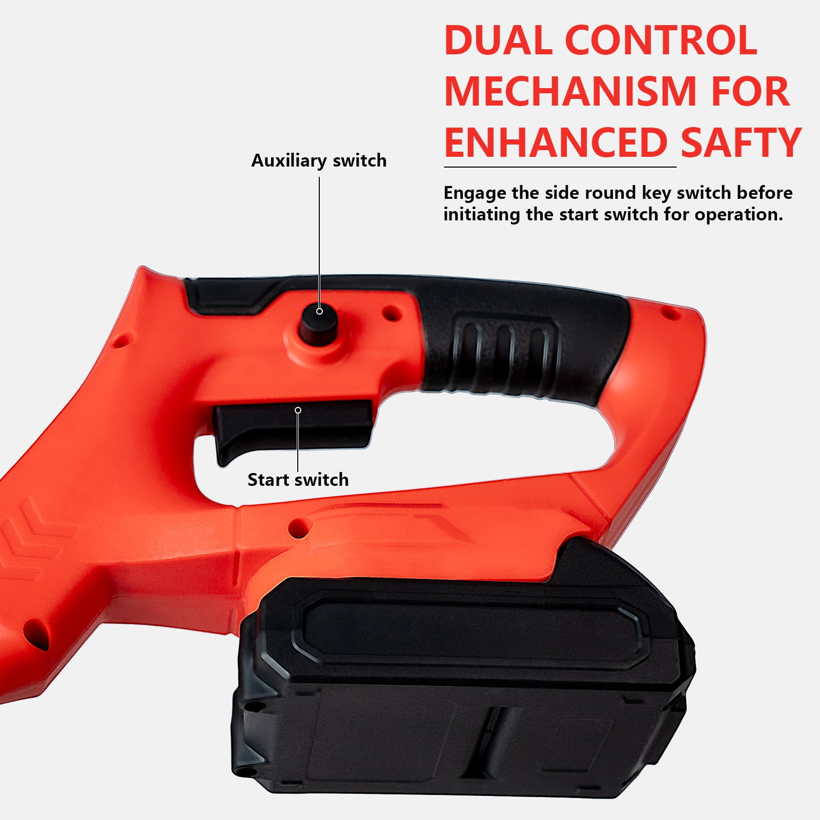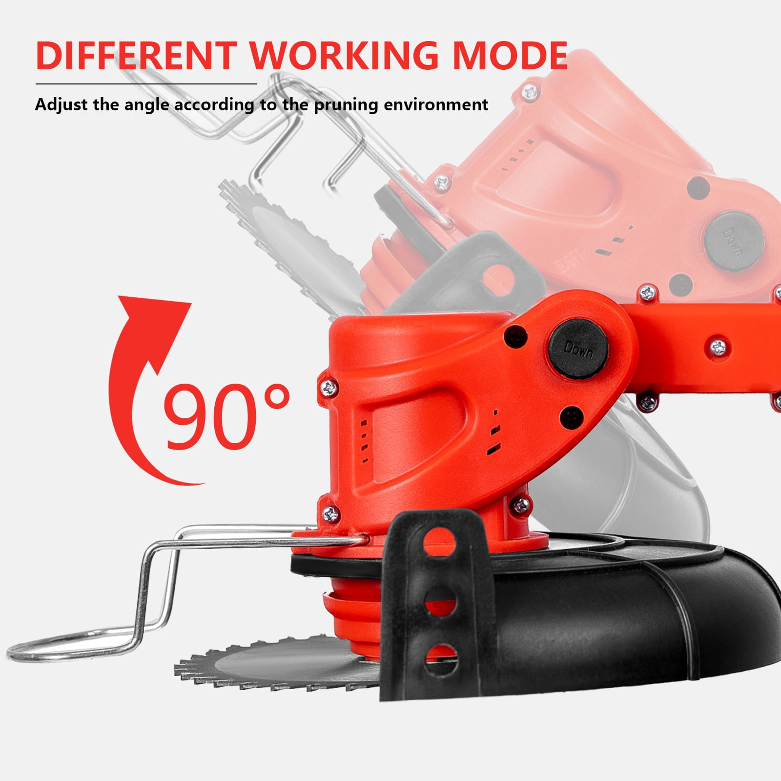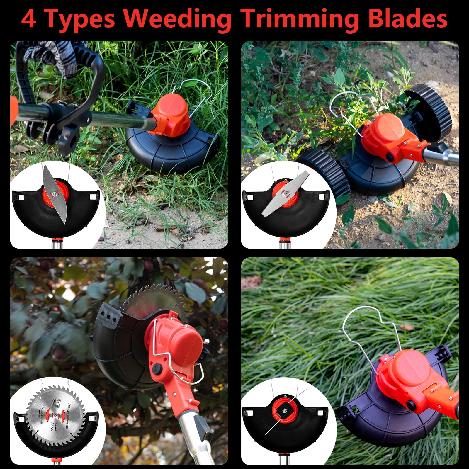 Powerful Weed Wacker Cordless: Electric weed wacker with 800W high power pure copper motor. 10000 rpm no-load speed, achieve large operations under small machines. The Weed Trimmer battery powered is multiple functions in one: grass trimmer, lawn edger, small mower, easy for different cutting jobs, not limited by wires, you can mow anywhere. Multifunctional Brush Cutter: Weed Wacker Cordless there are 3 kinds of blades, which can easily cope with different scenarios. ①Metal blade suitable for cutting thick weeds and hedges; ②Saw blade suitable for pruning branches or bushes; ③Plastic blades are only suitable for cutting tender grass;④Alloy blade suitable for pruning bushes. Your garden grass is very lush, it is recommended to use a metal blade directly. (To avoid damage to the blade, please choose the correct blade when weeding). 21V Battery Weed Wacker: This electric grass trimmer include 2pcs high capacity battery 2.0Ah battery and fast charger that can provide super use life (1-2hour). so you can trim more weeds in yard. Quieter, safer, more environmentally friendly and portable than gas or corded string trimmer, you can saves resources and money.( Battery time varies with the thickness of the vegetation). Safety Design & More Reliable: Our cordless weed wacker battery operated has passed the professional design and safety test. Double-switch safety lock function, which can effectively avoid the danger caused by accidental activation. The anti-collision metal pole can protection flowers or ornamental plants while weeding. Lightweight & Easy To Use: The cordless weed trimmer just 4 pounds, comes with a wheel, lightweight and easy to use for women, children and the elderly. stringless brush cutter has a adjustable telescopic pole can adjust the length from 37-49inches. Provide the required length for all heights people without bending over, head angle is adjustable from 0-90°, whether it is sloped or in a narrow space, ensures effortless care for every nook and cranny. Kind tips: Please charge it for the first use. After use, please detach the battery promptly and clean the remaining weeds on the machine head to help extend the service life of the machine. package included: 1x Battery powered weed eater 2x Circular saw blade 10x Plastic blades 10x Steel wire haymaking rope 2x 21V 2.0Ah Li-ion Battery 2x S Metal Blade 2x Alloy Blade 1x goggles 1x charger 1x Pair Gloves 1x User Manual