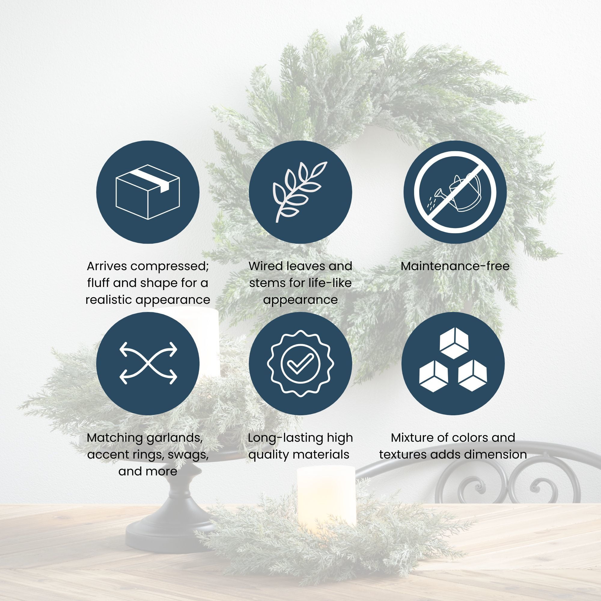 Bring the beauty of the outdoors inside with this life-like faux wreath Hang from your door, mantel, wall, or simply use as a centerpiece to add some vitality to any room Uniquely designed with individually wired, bendable branches to reshape and fluff to match image Bring this wreath out year after year, as it will stay vibrant with no maintenance required Easy maintenance, wipe clean with a cloth if dusty