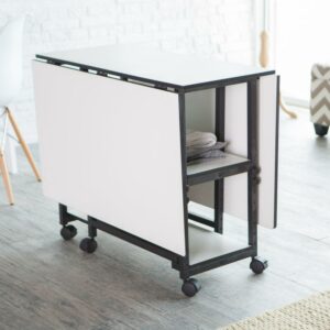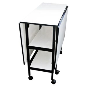 The Sullivans USA home hobby adjustable height foldable table is designed to make craft time more enjoyable. It enables you to sit or stand while you work and the height can be adjusted from 29 to 38 or at intervals in between. The Sullivans adjustable home hobby table is constructed of heavy-duty tubular steel and is made to last. It features two integrated shelves to keep supplies and tools close at hand. The durable, laminated surface protects from damage and dust. Fold-down one wing of the adjustable height craft table to create a smaller working surface. When you re through, the metal frame collapses to a slim profile and easily rolls away on tough, locking casters.