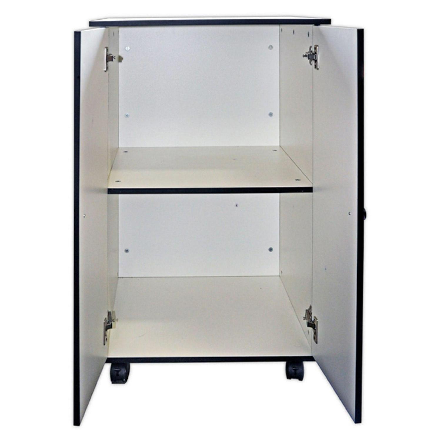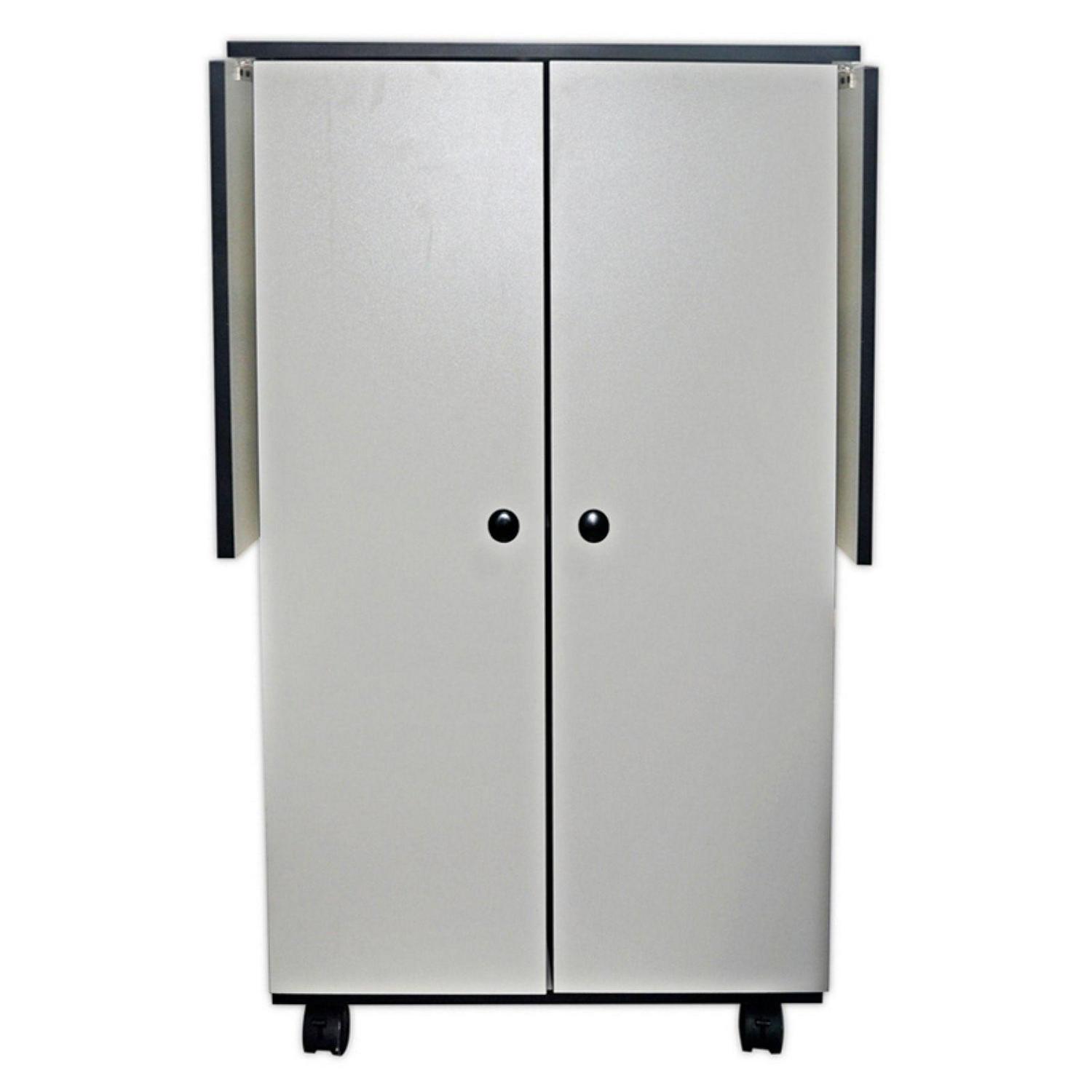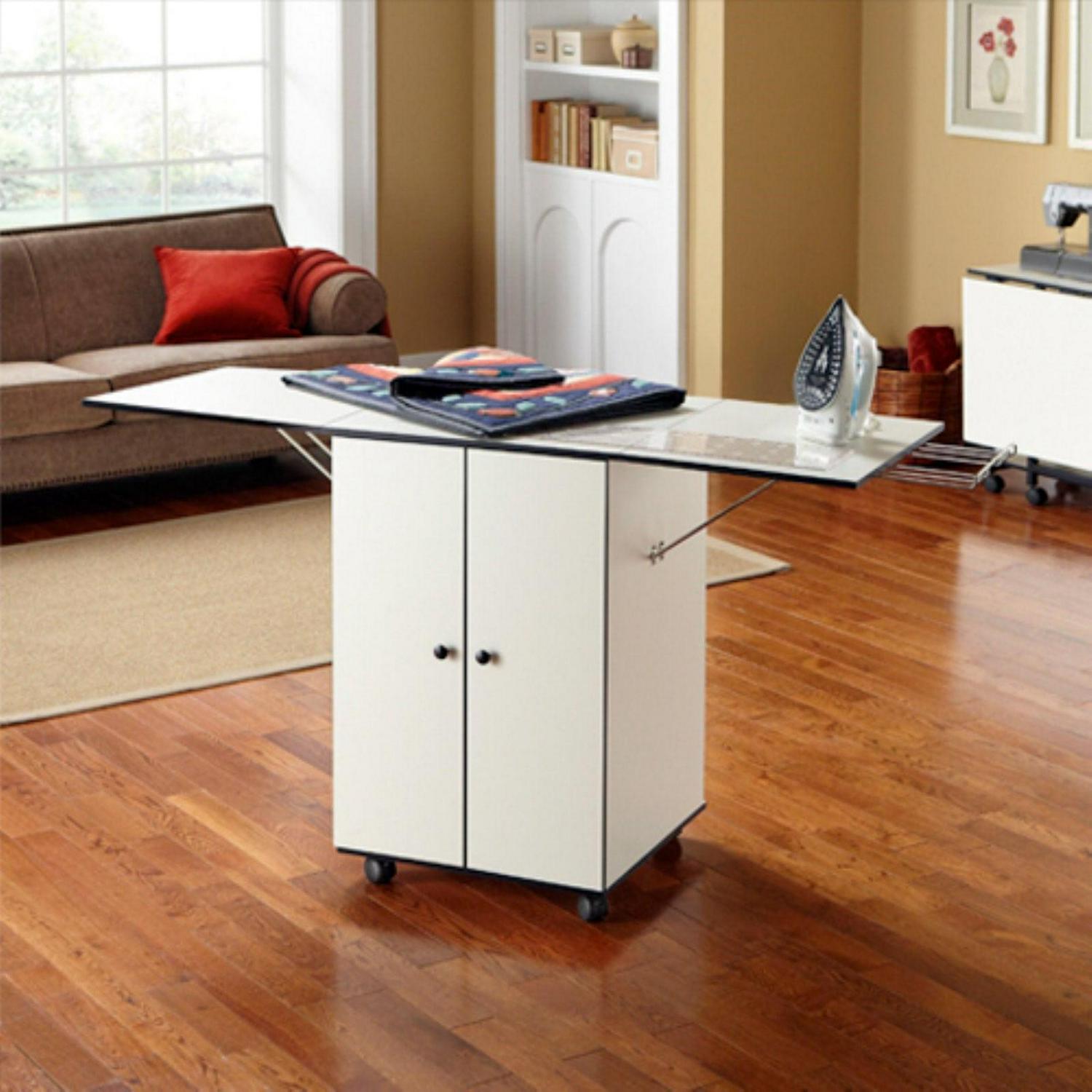 At just about counter height, the Sullivans Ironing Center is as versatile as it is useful. It features a durable, fully laminated work surface. Inside the double-door cabinet are two shelves for storage. Always keep your supplies nearby. These shelves are great for holding materials and tools. An included 100% cotton ironing cover protects the surface and fabrics from damage. Also included is a handy retractable iron caddy. Keep your iron nearby yet safely out of the way. When not in use, the Ironing Center features two fold down ends to save on space. The base sits on rolling casters so it is easy to move as needed.