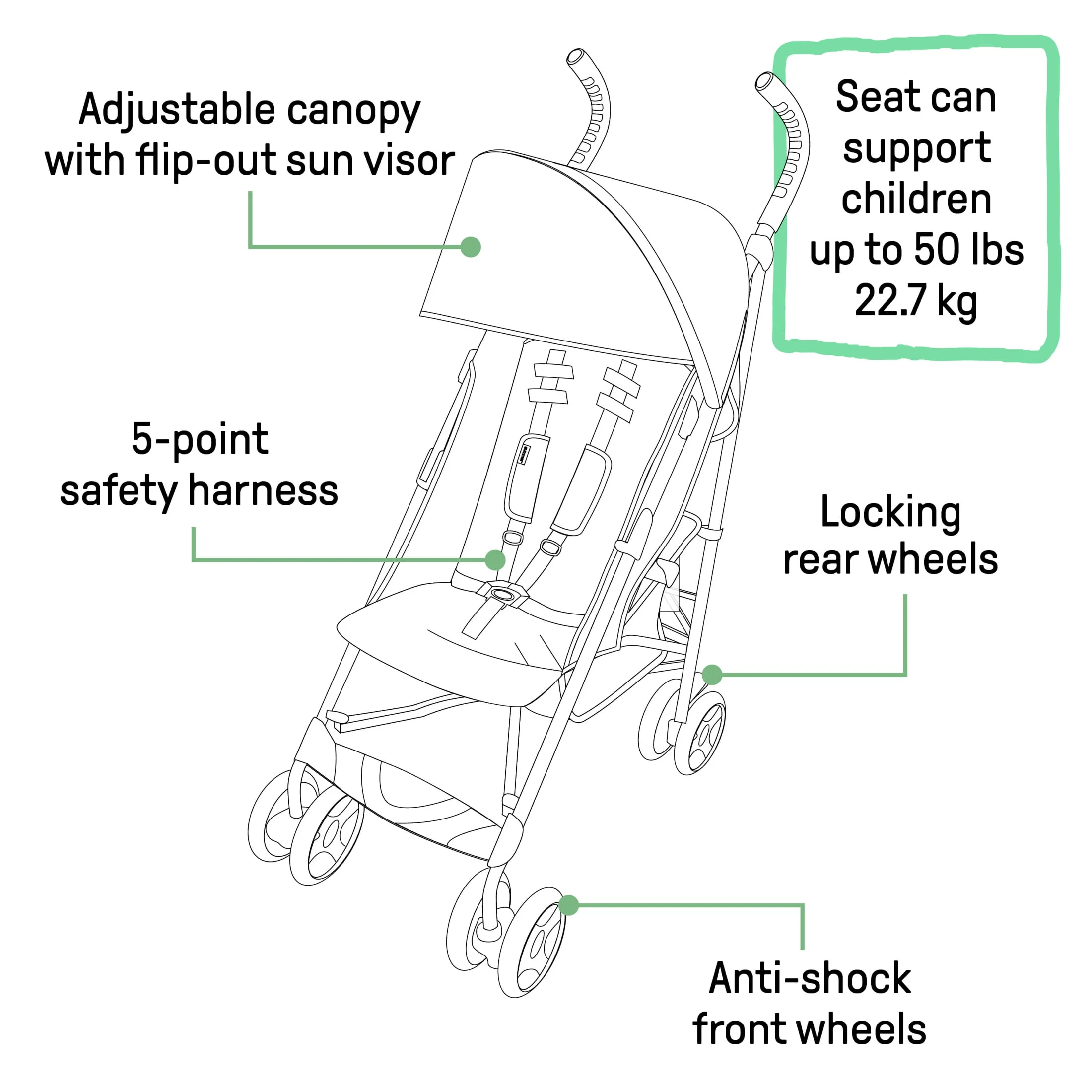A lightweight stroller makes any outing a little easier! The Summer by Ingenuity 3Dlite ST Convenience Stroller has a durable steel frame that weighs just 15 pounds and has a large seat area, plus anti-shock front wheels and lockable rear wheels. FOR TRAVEL AND EVERYDAY: Whether youÕre traveling or just on the go running everyday errands, having a lightweight, compact stroller is a must! With this one easy to use stroller, youÕll have both an everyday and travel stroller option. MULTI-POSITION RECLINE: Keep your little one comfortable and safe at all times with the multi-position recline and 5 point safety harness. Maximum weight and height of child for this toddler stroller: 50 pounds and 43 inches COMPACT FOLD: The easy compact fold and auto lock make it simple to store this lightweight umbrella stroller and bring it with you to go! Plus, the adjustable and removable canopy with flip out sun visor is perfect for sunny days. EXTRA STORAGE: With plenty of storage in this stroller, you wonÕt have to leave anything at home. It includes an extra-large storage basket, rear storage pocket and cup holder. DonÕt overload storage basket: maximum of 10 lbs.