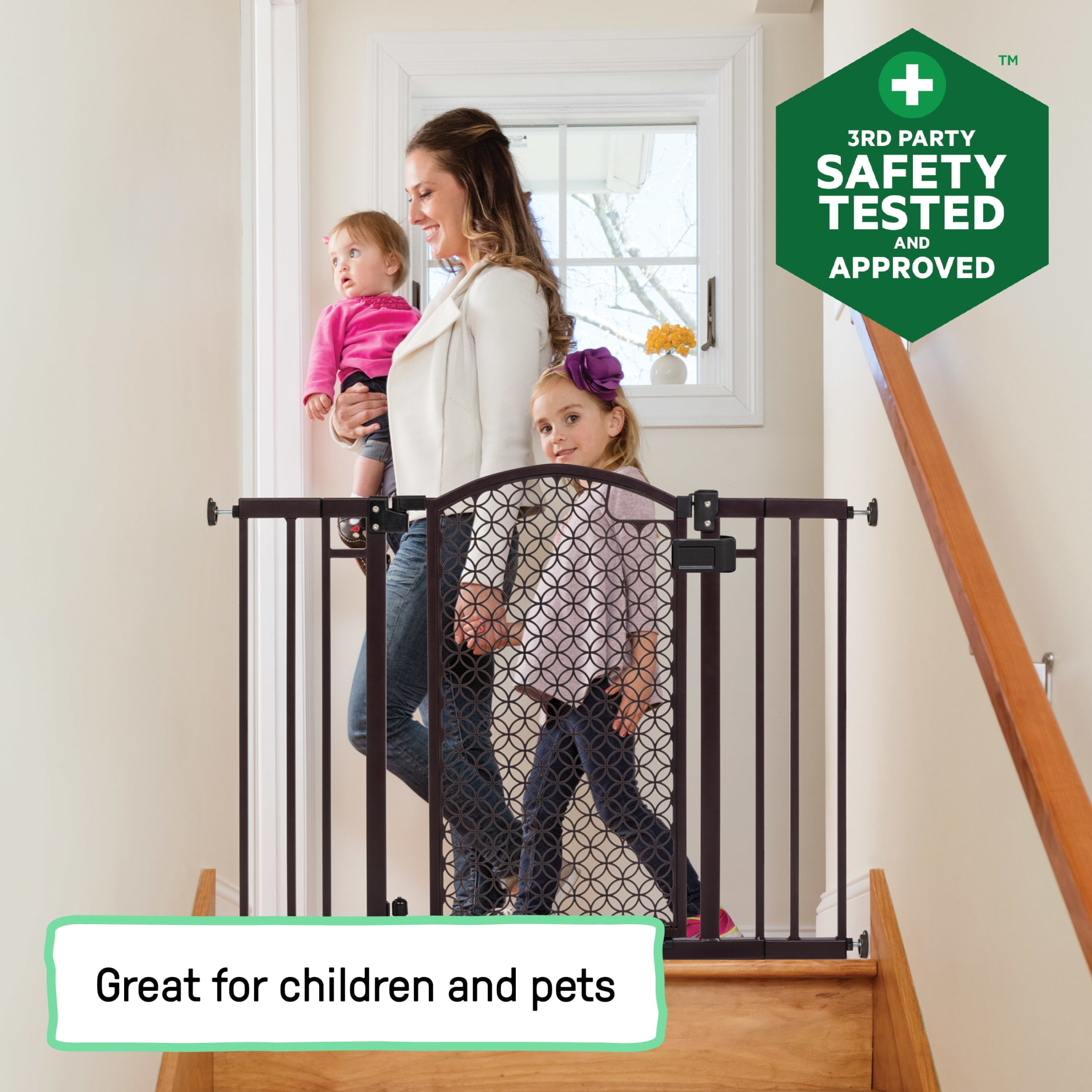 Child proof your home in style with the Summer Infant Modern Home Decorative Walk-Thru Baby Gate. Made of durable steel with a bronze finish and a decorative arched doorway, this baby gate will complement any home décor. Have added peace of mind knowing that this sleek gate accommodates both doorway and stairway installation. Easily install this baby gate on stairways with the included kit, or by using the no drill doorway mount for in-between doorways. Tools are required for hardware mounting. This 30” tall baby gate fits openings up to 28” to 42” wide making it the ideal gate for toddlers and small pets.