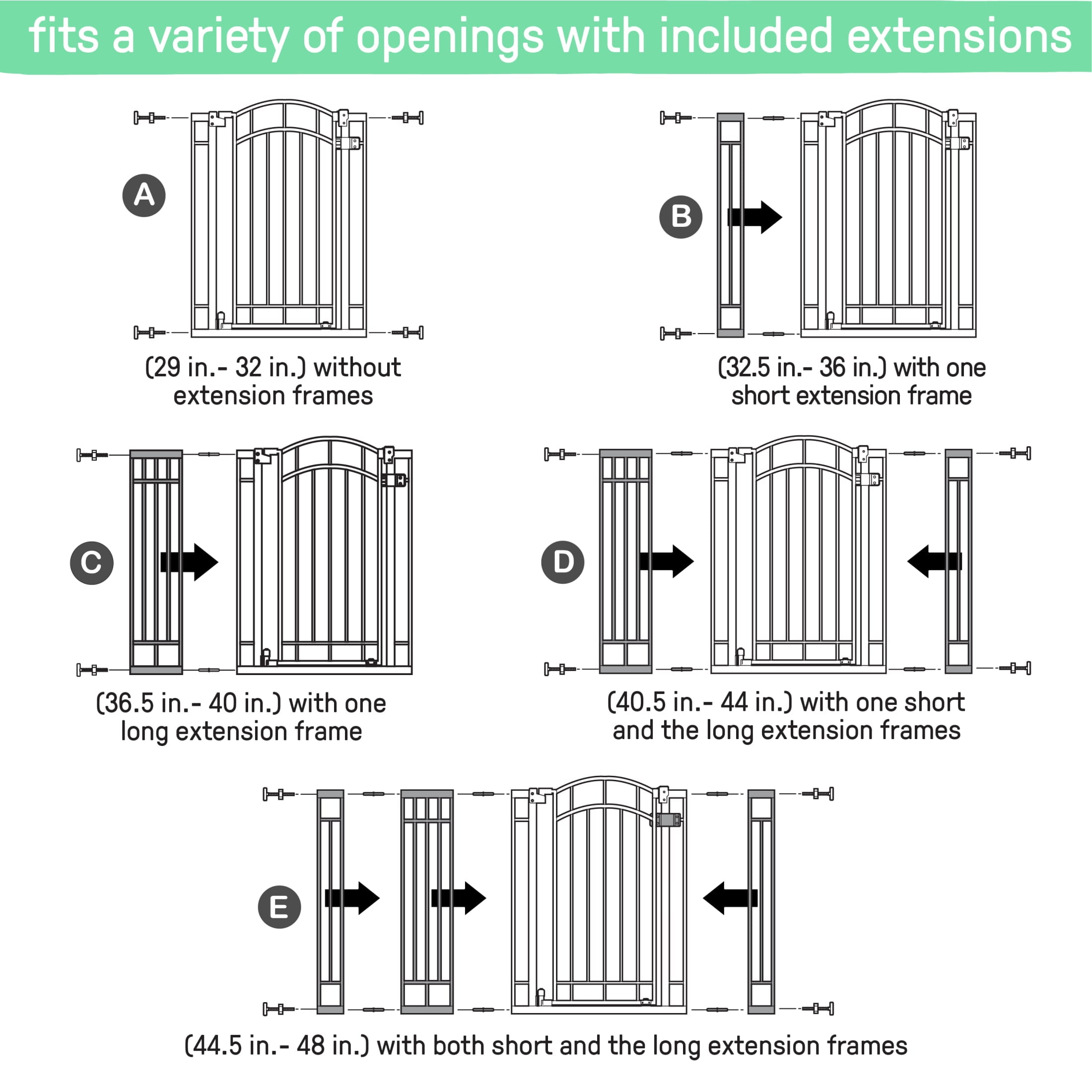 The Summer by Ingenuity Doorway 48W Series Baby and Pet Gate fits openings 29-48″ and is 36″ tall (including arch); featured in USA Today’s “Best Baby Gates of 2023″ list Fits in doorways or hallways with no-drill pressure mount system to help prevent damage; fits at top or bottom of stairs, on walls or flat banisters, with included hardware kit (required for stair use) 19″ wide door can swing both ways; door conveniently stays open when engaged more than 90 degrees and auto-closes at less than 90; stopper prevents door from swinging over top of stairs Door locks securely to keep children & pets contained with narrowly spaced bars; adults can open door with one hand by engaging the latch and pulling up on the door Gate door will appear off-center until mounted and tightened; will not fit an opening 32-32.5″, 36-36.5″, 40-40.5″, 44-44.5” due to extension sizing and configurations; 3rd party safety tested and approved