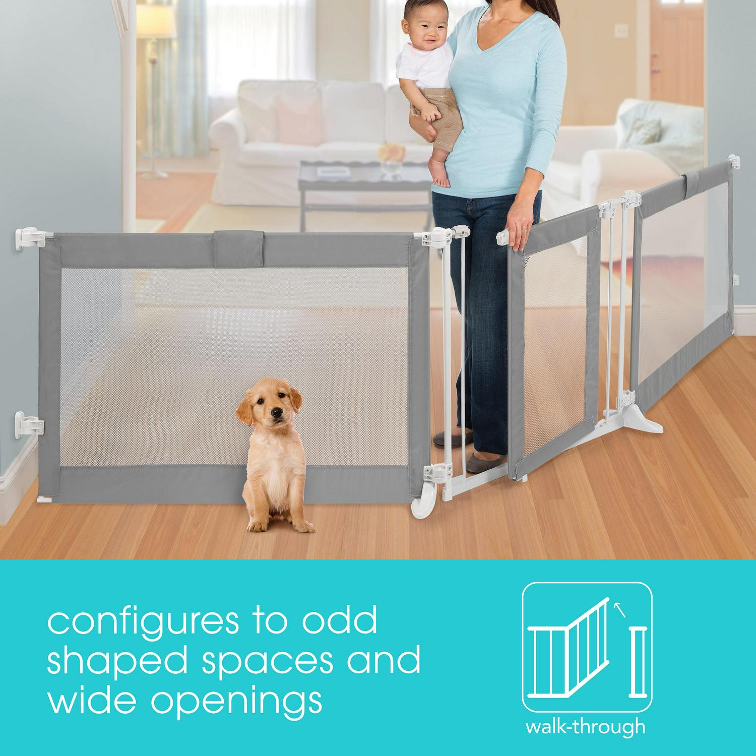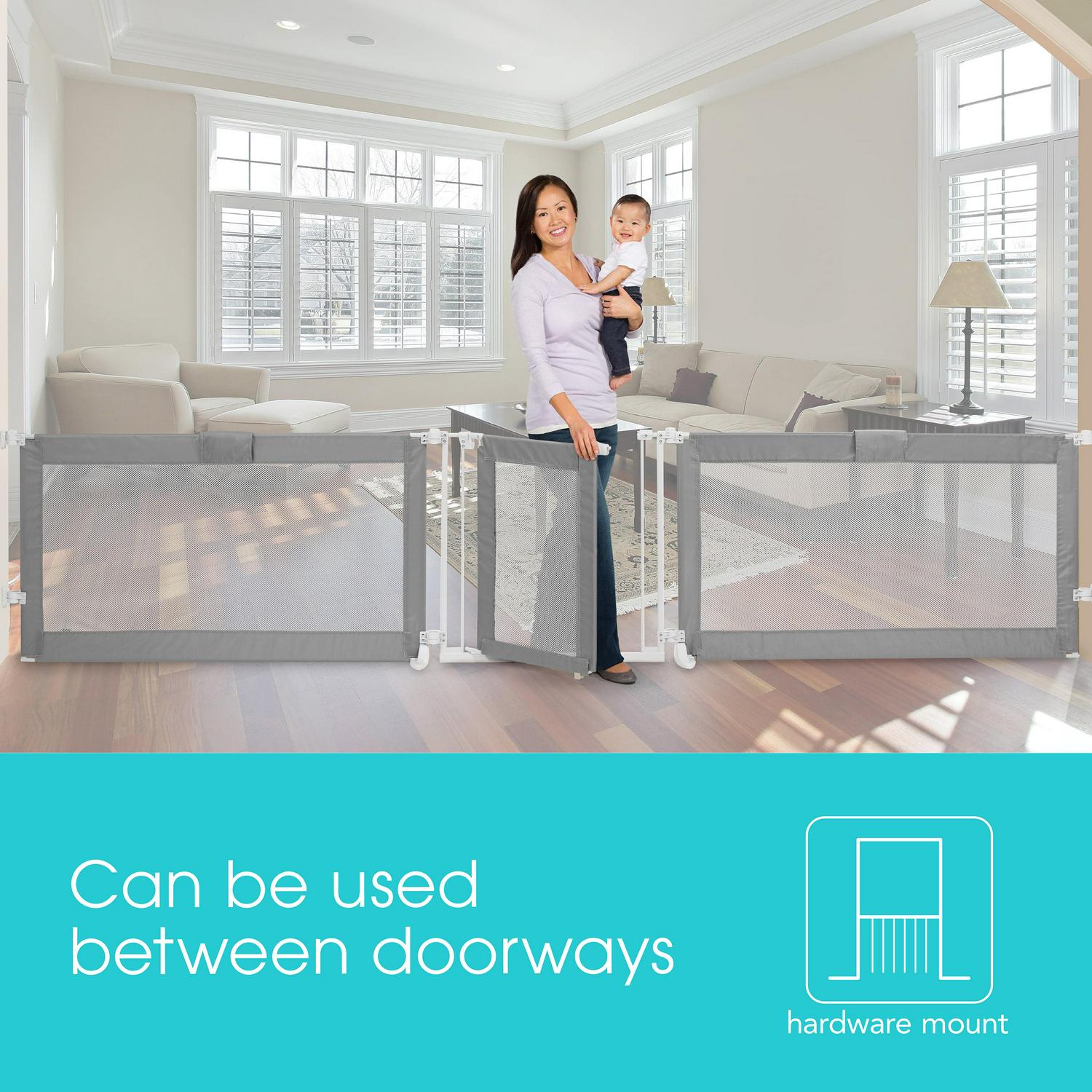 Child proof your home in style with the Summer Custom Fit Walk-Thru Extra Wide Baby Gate. Made with stylish grey mesh, this baby gate will complement any home décor. Have added peace of mind knowing that this sleek gate accommodates extra-wide doorways and wide spaces. Plus, Purchase multiples and configure them together to create a free standing playard. The hardware mounted installation keeps gate securely in place. Tools are required for hardware mounting. This stylish, extra wide gate can be used with either 2 or 3 panels and accommodates openings from 65 to 143 wide, allowing parents to configure the gate in odd shaped spaces, extra wide openings and even to create play areas in corners of the home. Standing at 30 tall, it is ideal for use with toddlers and small pets.