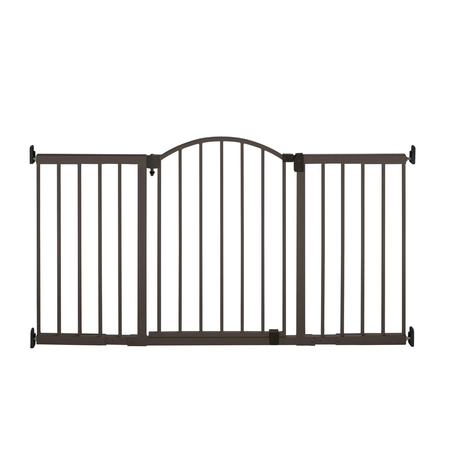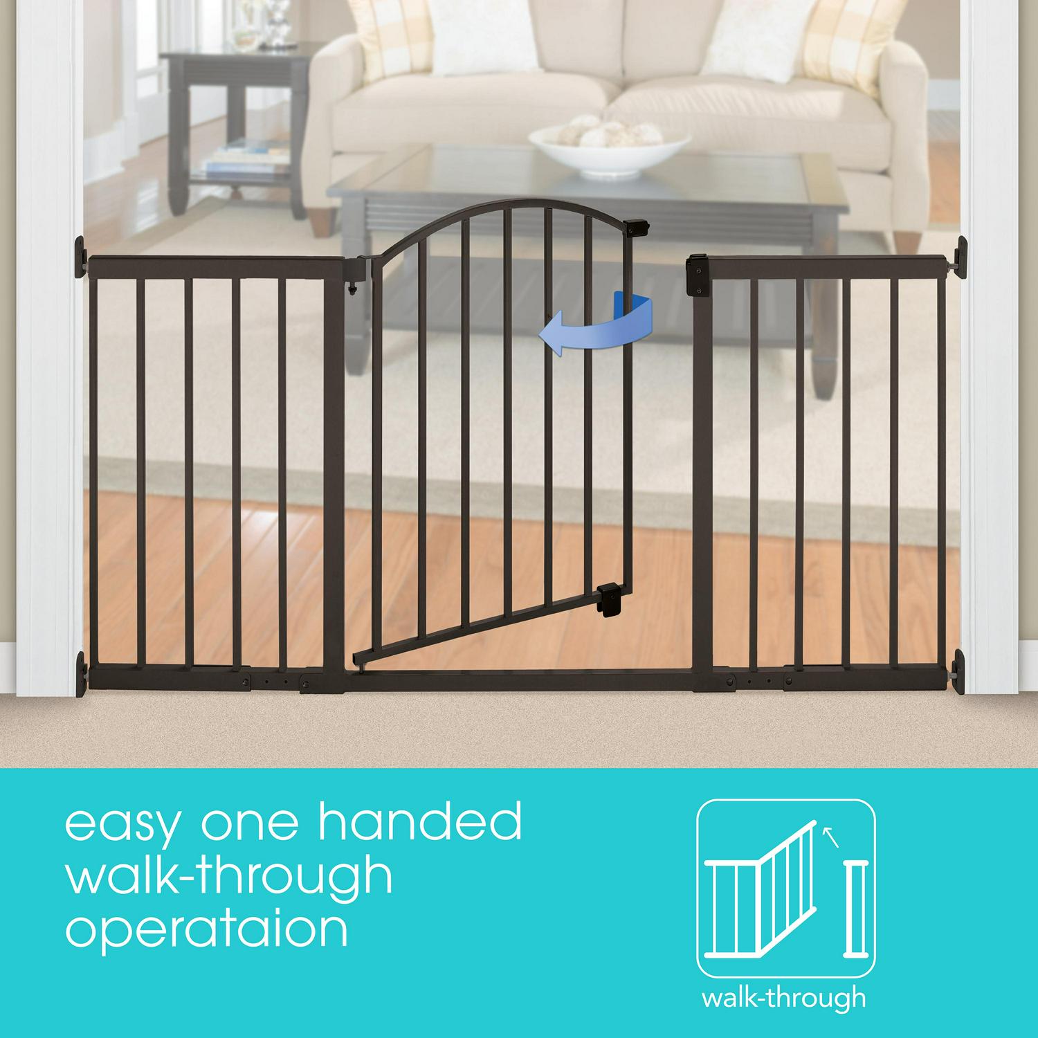 Child proof your home in style with the Summer Metal Expansion 6-Foot-Wide Extra Tall Walk-Thru Baby Gate. The stylish bronze metal frame of this baby gate will complement any home décor and is perfect for extra-wide doorways. Ideal for toddlers and pets, this 36 extra tall baby gate can fit openings anywhere from 44 to 72 wide. When used between rooms, this extra tall and wide safety gate has a simple, one-handed walk-thru door allowing parents to move easily from room to room. Plus, the soft scratch guard on the bottom rail prevents the gate from scratching hardwood floors. Easily install this baby gate on stairways with the included kit. Tools are required for hardware mounting.