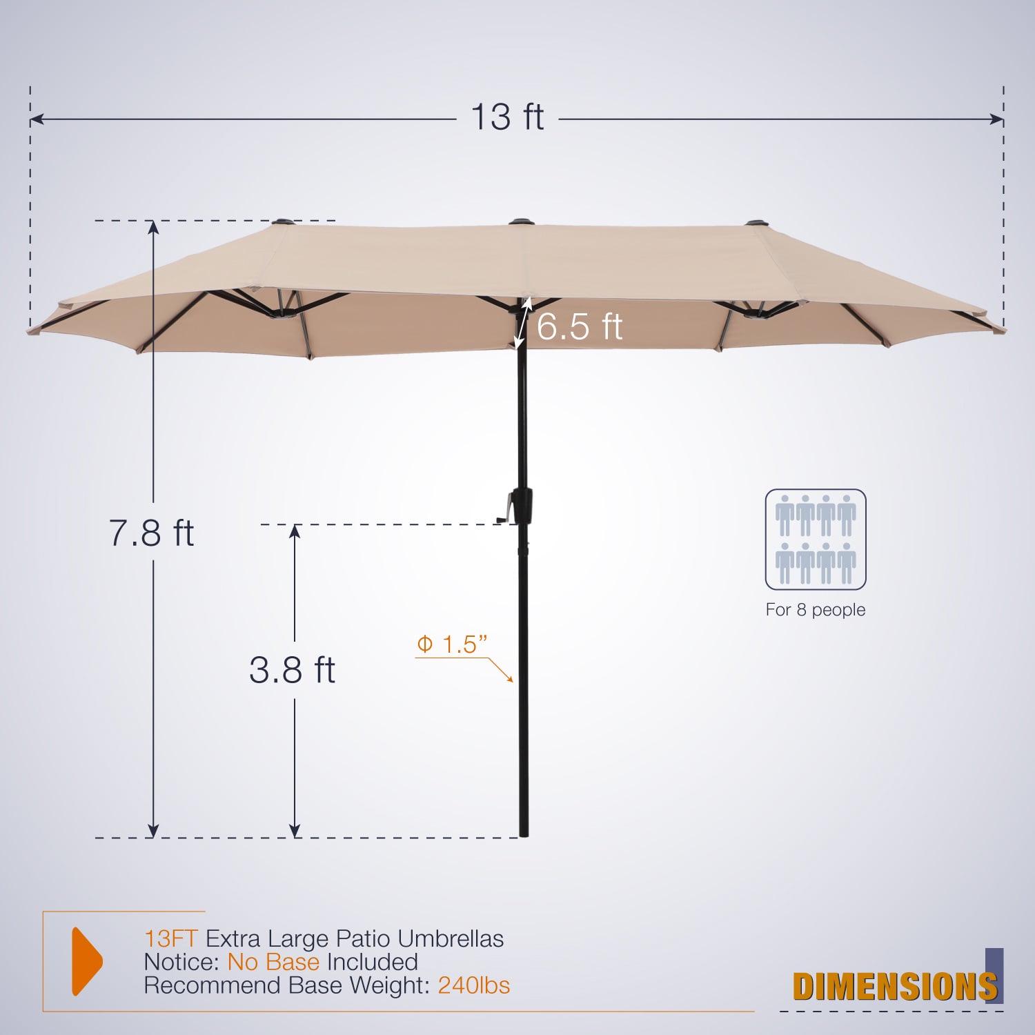 Summit Living 13 ft Large Patio Umbrella Double sided Outdoor Market Umbrella. Constructed with the rust-free Steel pole and 12 heavy-duty steel ribs, this umbrella has a good strength and durability, Made with high-grade 180g polyester fabric, this canopy can block out 99% UV rays, a smooth-turning crank make you easy to open or close the umbrella .You can enjoy the weekend with your friends, family or customs under the patio umbrella.