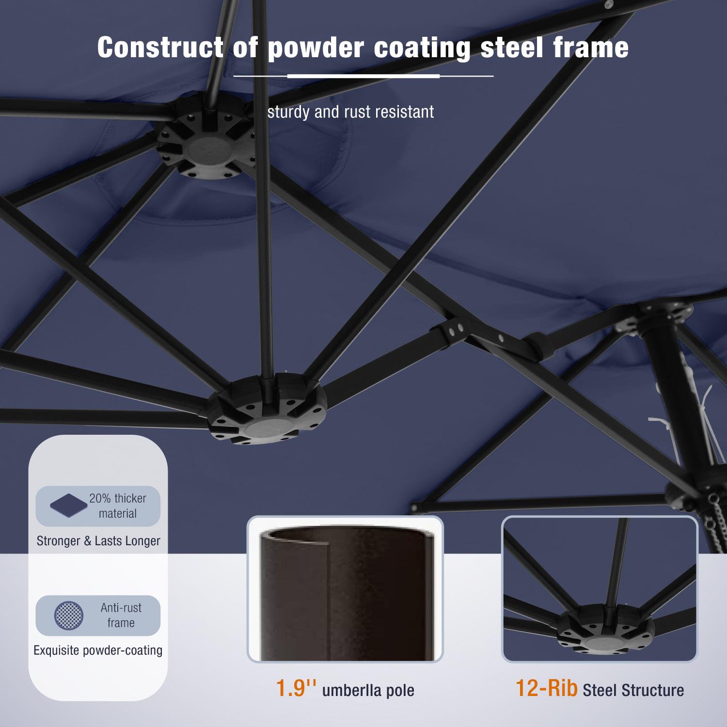 – Durable Structure This frame of this patio umbrella is made of thick steel with powder coating, which is anti-rust and great for outdoor use. Moreover, 12 steel ribs provide optimal support for the large double-sided canopy. Even better, safe latch design for better-fixed canopy.