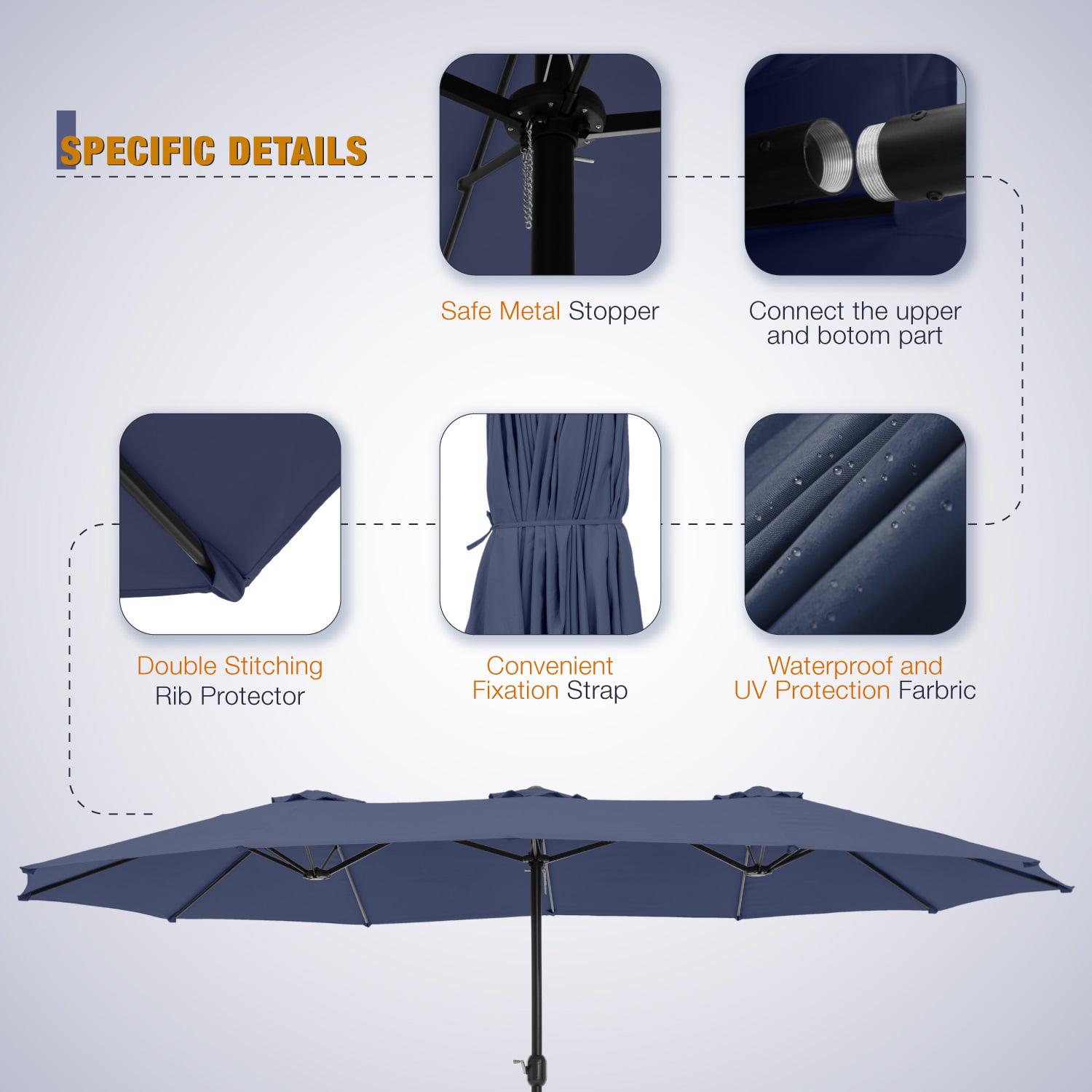 – Large Patio Umbrella This 15ft patio umbrella features a double-sided design, which gives you maximum shelter that brings you double shades for your outside enjoyment. Additionally, this patio umbrella with large shade is great for garden, backyard, poolside and beach.