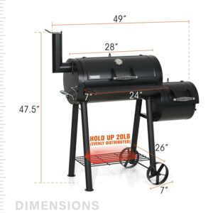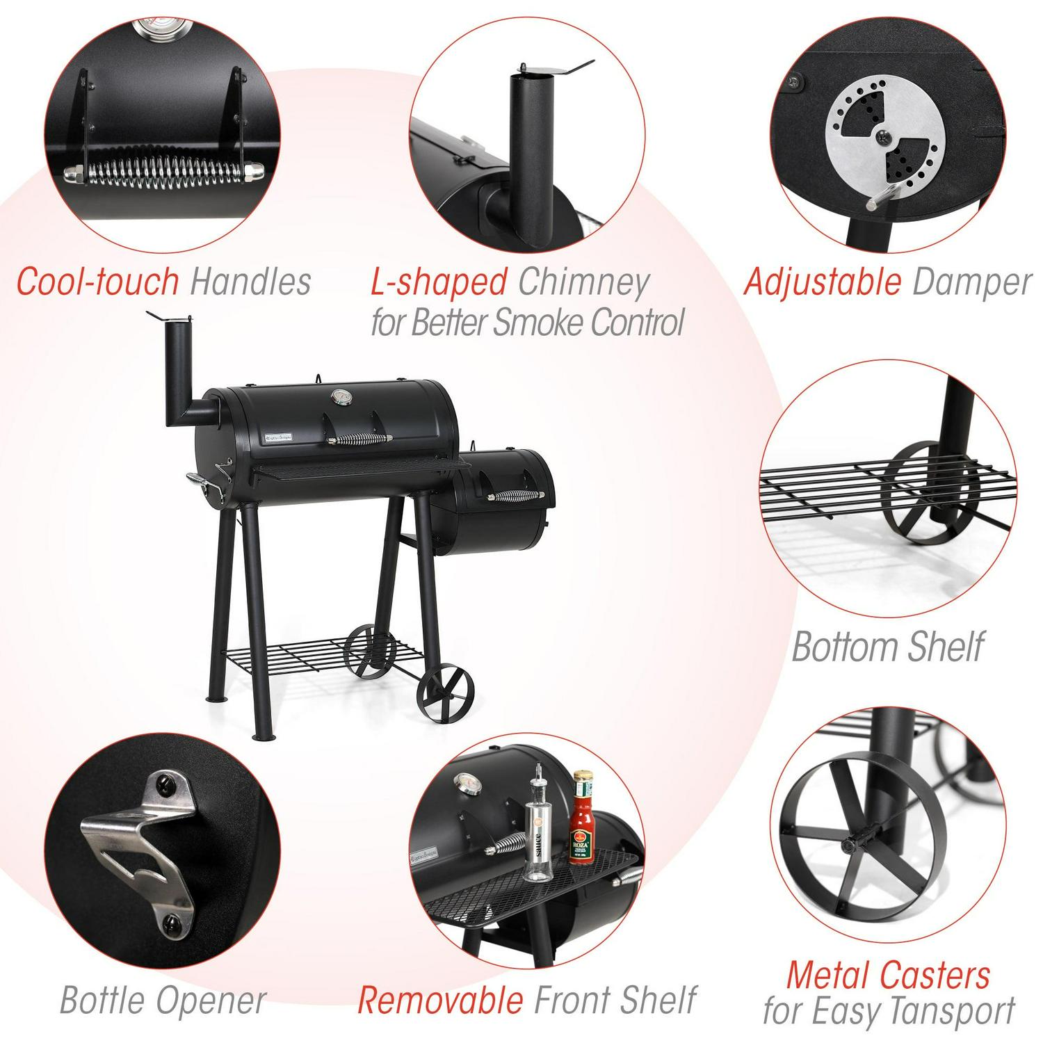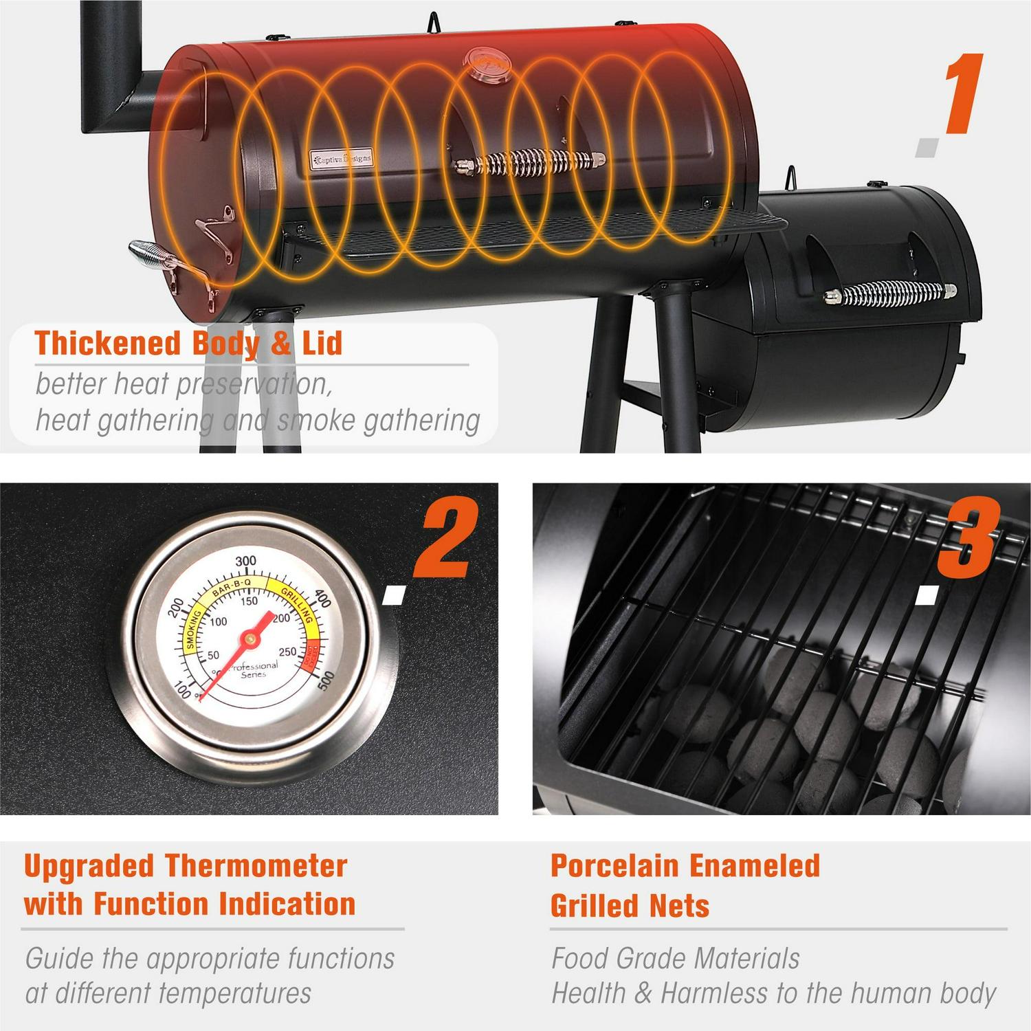 – Offset design keeps direct heat away from the food, allowing for slow cooking.Seamlessly attached to the main body for good circulation of heat and smoke. And it can also provide additional grilling or smoking cooking space.