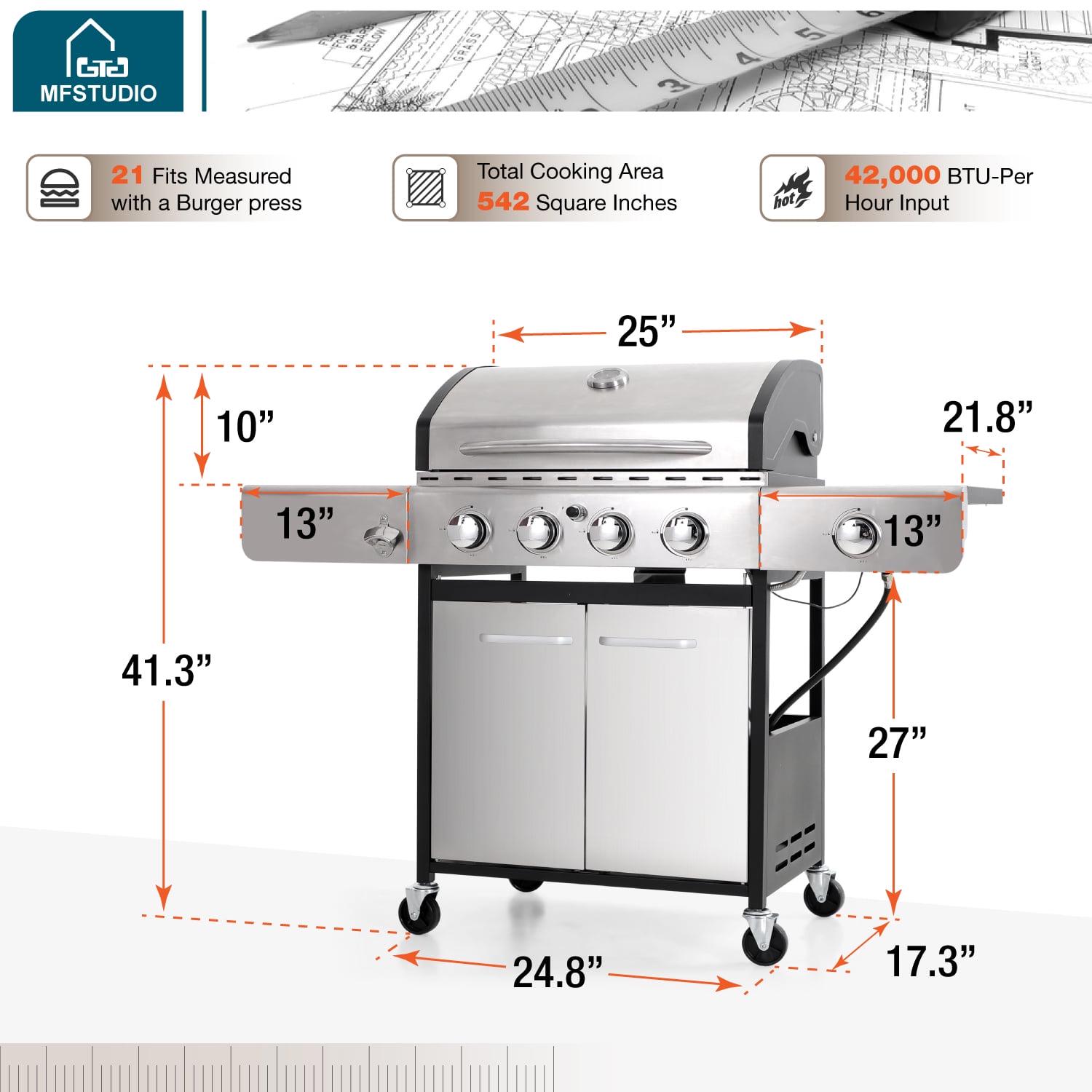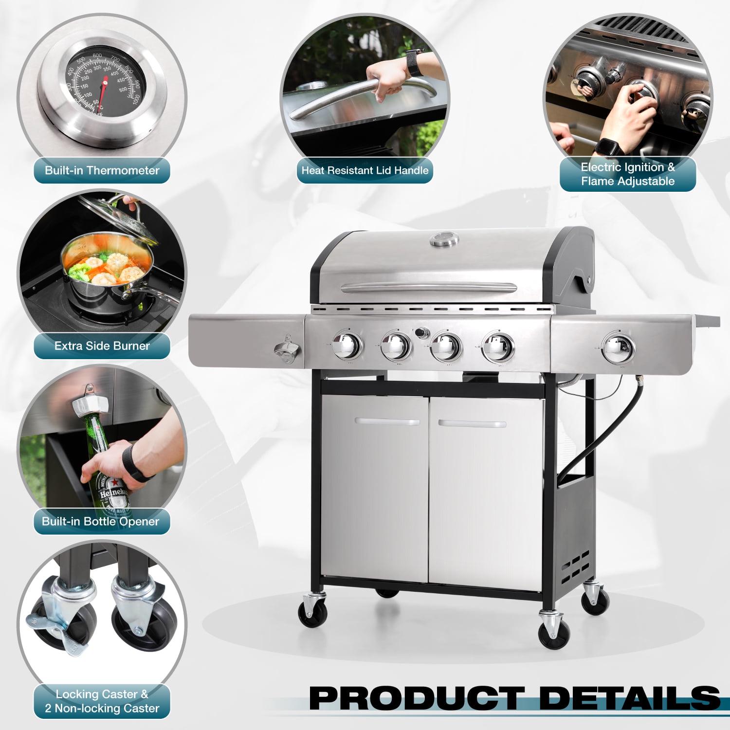 Summit Living Stainless Steel 4 Burner Propane Gas Grill with Side Burner is crafted from stainless steel and porcelain-enameled materials. With 542 sq. in. of total cooking space this BBQ offers enough space to cook for small gatherings or large parties. Its even heat cooking system includes porcelain-enameled cast iron grates, stainless steel burners and porcelain-enamel flame tamer that work together to distribute consistent heat across the entire cooking surface and to reduce grill flare-ups.The double-layer stainless steel lid ensures that the food is evenly warmed, making it more delicious, and it is easy to wipe and clean. It has 4 Stainless Steel burners, can put out 42,000 BTU for per-hour with integrated piezoelectric ignition system, quick start up with the push and turn of a control knob, which is suitable for family gathering or parties.