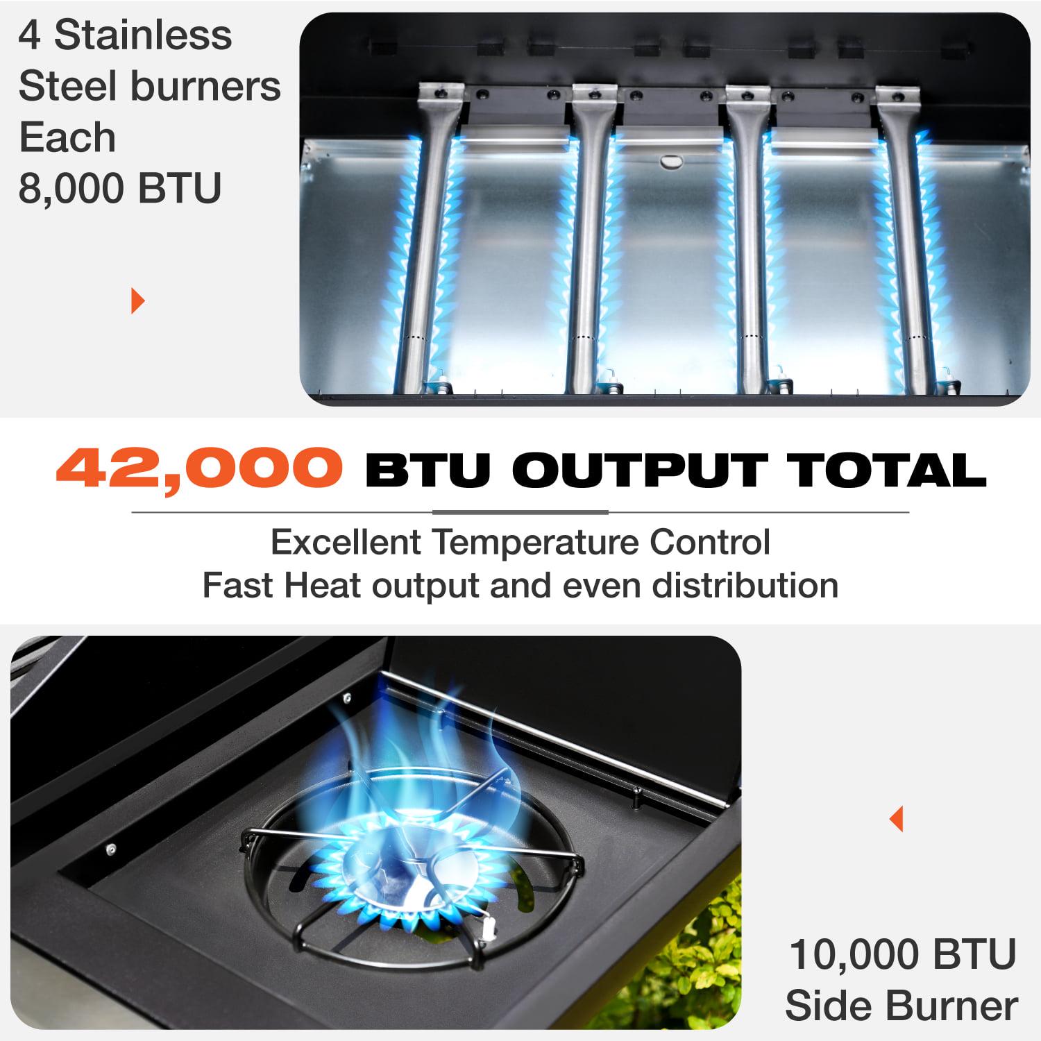 – 4 main stainless steel burners, each carries 80,000 BTU of cooking power. Includes one 10,000 BTU side burner. Total BTU is 42,000.