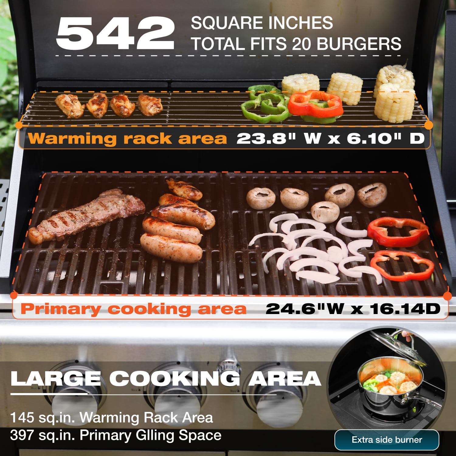 - 145 sq. in. warming rack, offering a total of 542 sq. in. BBQ cooking area