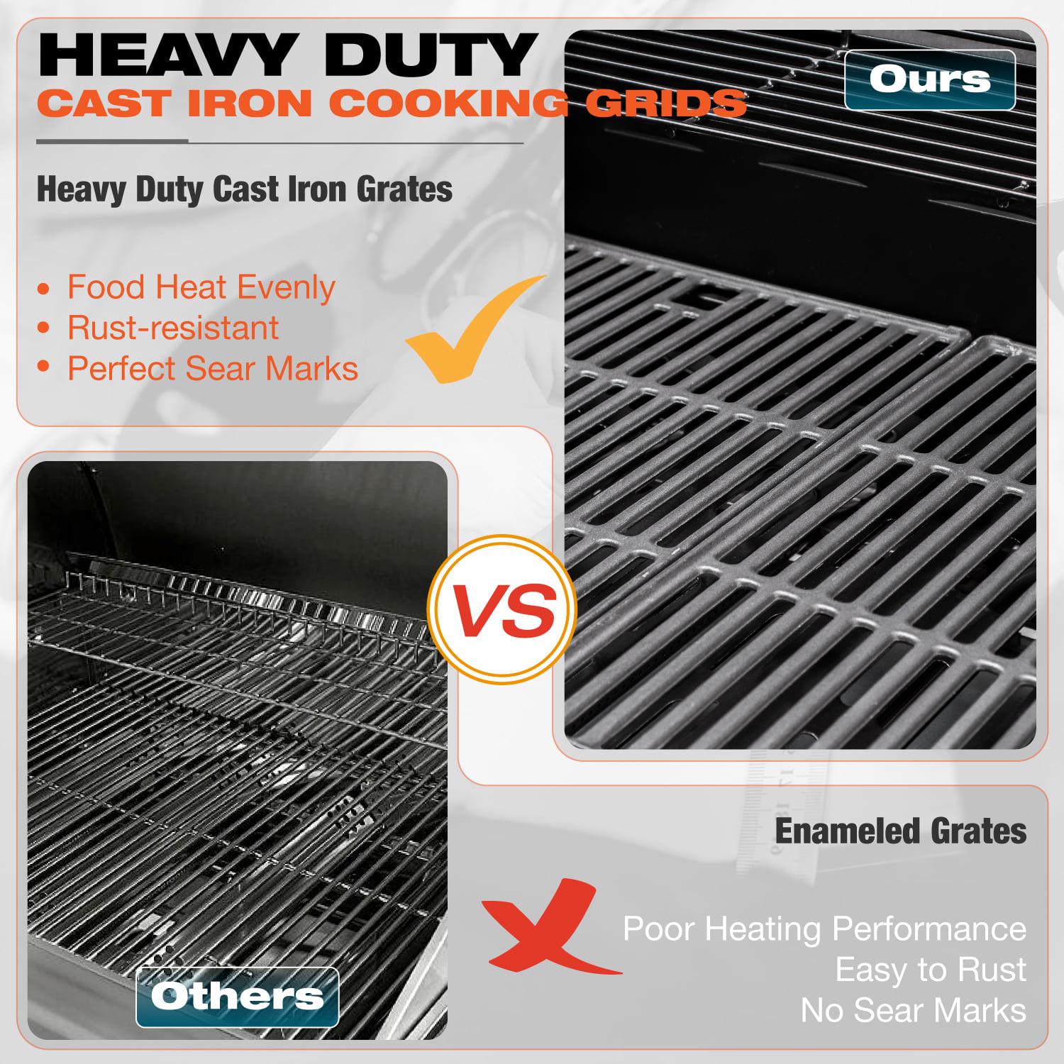 – Durable, easy-to-clean porcelain-enameled cast iron grates provide superior heat retention and distributes even heat, preventing hot or cold spots on grates.