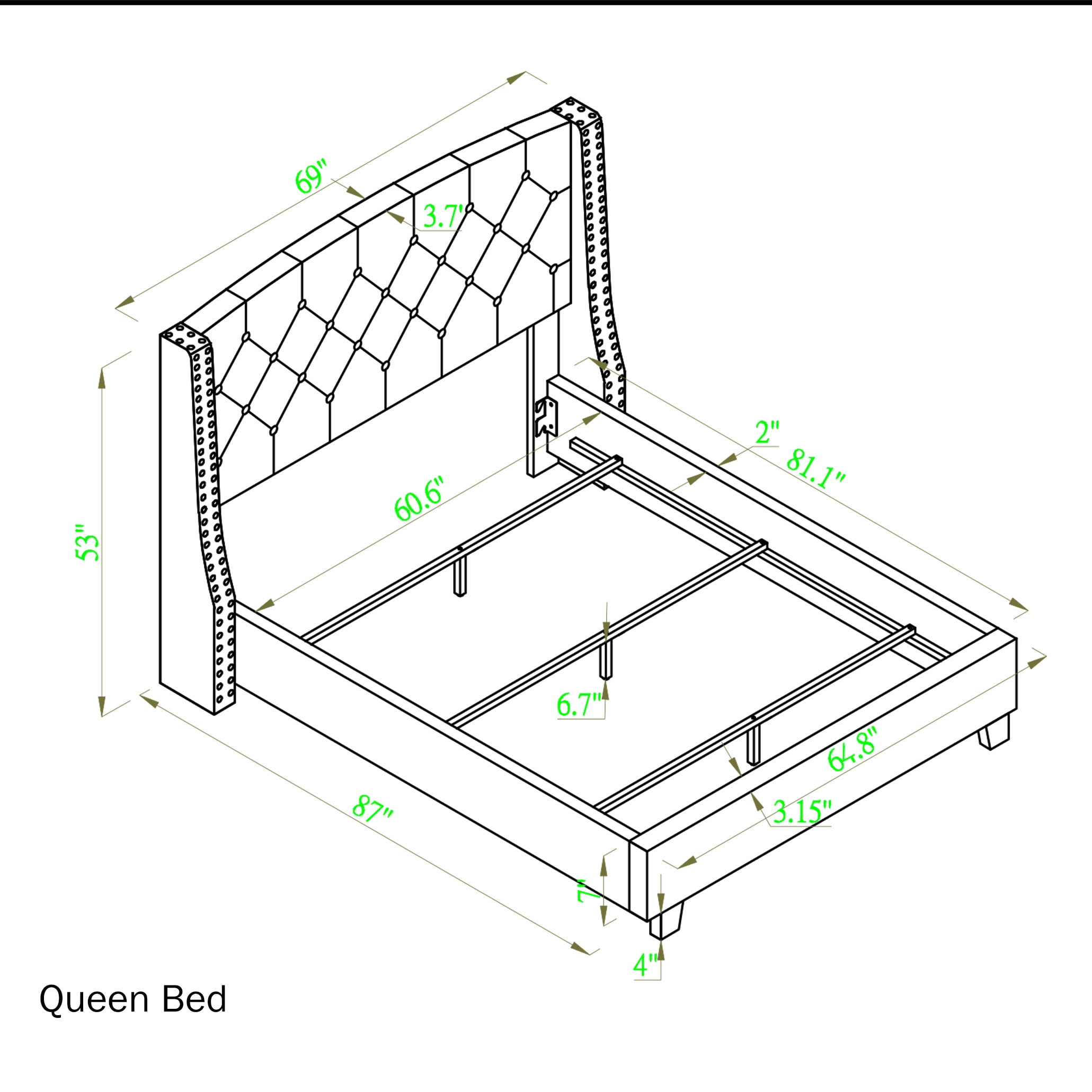 Choose from available sizes. Upholstered shelter bed styling Engineered wood internal frame. Upholstered in velvet fabric Button tufting and nailhead trim to create a sophisticated look you’ll love Sep up dimension: 70″ x 86″D x 56″H Some assembly required. Photo may slightly different from Actual Item in Terms of color due to the Monitor’s display