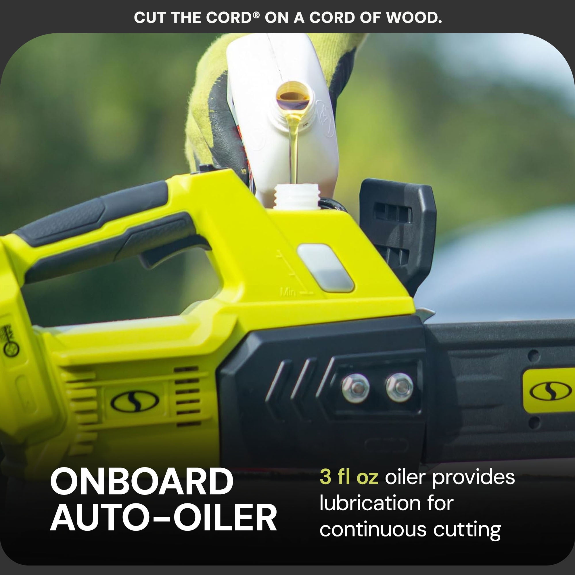 Powered by a single 24-Volt 4.0-Ah battery, providing up to 74 cuts per charge Robust 600-watt motor and 10-inch bar and chain cut cleanly through tree trunks, limbs, logs, brush, and dead branches up to 9.5 inches thick Onboard 3 fl oz auto-oiler keeps the bar and chain fully lubricated for continuous cutting Lightweight and portable at less than 8.5 pounds, making it easy to maneuver and take where the work is Safety features include a built-in hand guard with kick-back brake, a safety switch to prevent accidental starts, and a sheath for safe bar storage when the work is done Backed by a full 2-year warranty